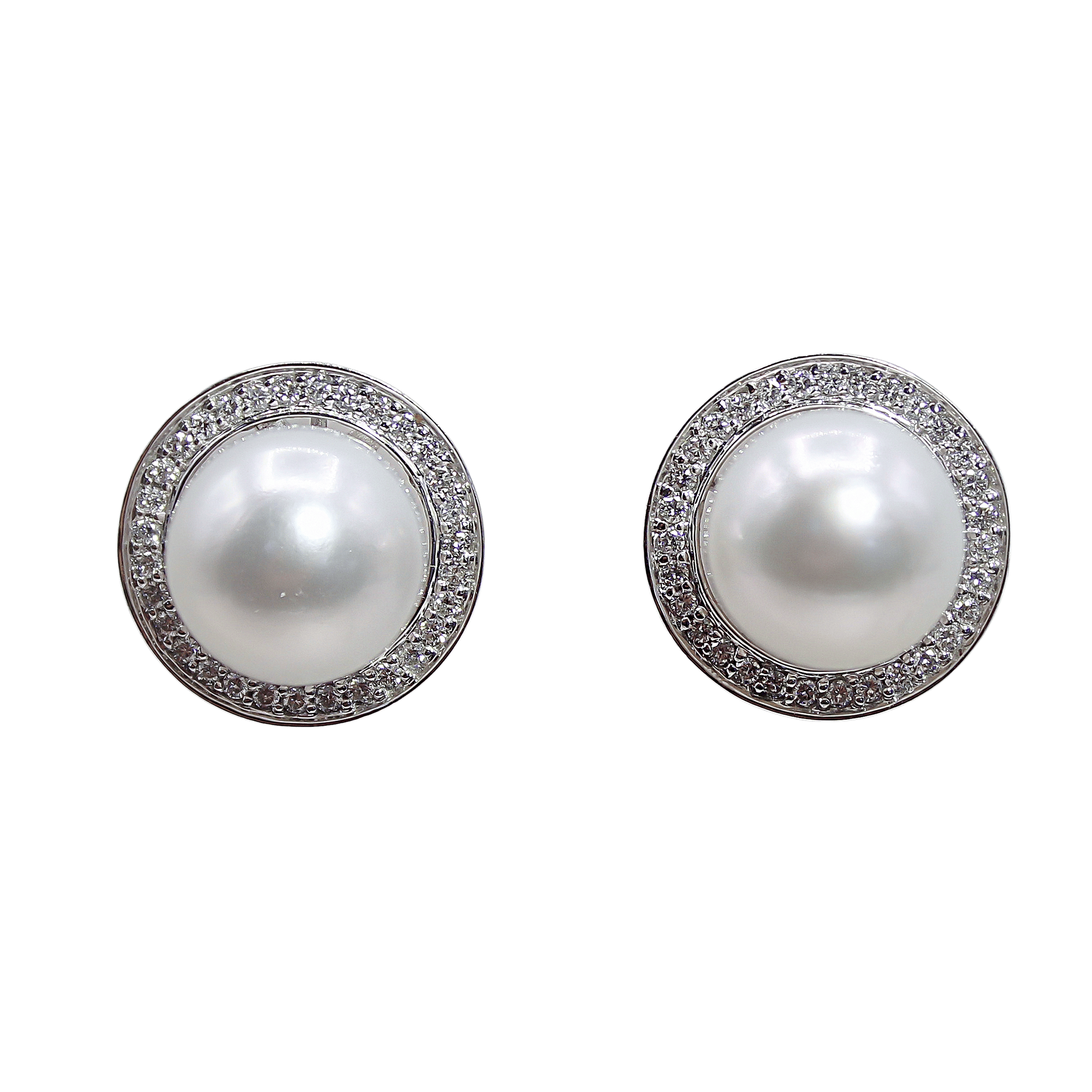Radiating sophisticated glamour, these estate earrings feature impressive 11.50mm cultured pearls that boast a deep, creamy luster and satin-like finish. Each pearl is meticulously encircled by a brilliant halo of natural earth-mined diamonds, totaling approximately 0.50 carats, creating a dazzling contrast against the cool, polished 18k white gold. Perfect for a bride seeking a statement accessory or as a refined addition to evening wear, these button-style studs offer substantial presence and light-catching fire.