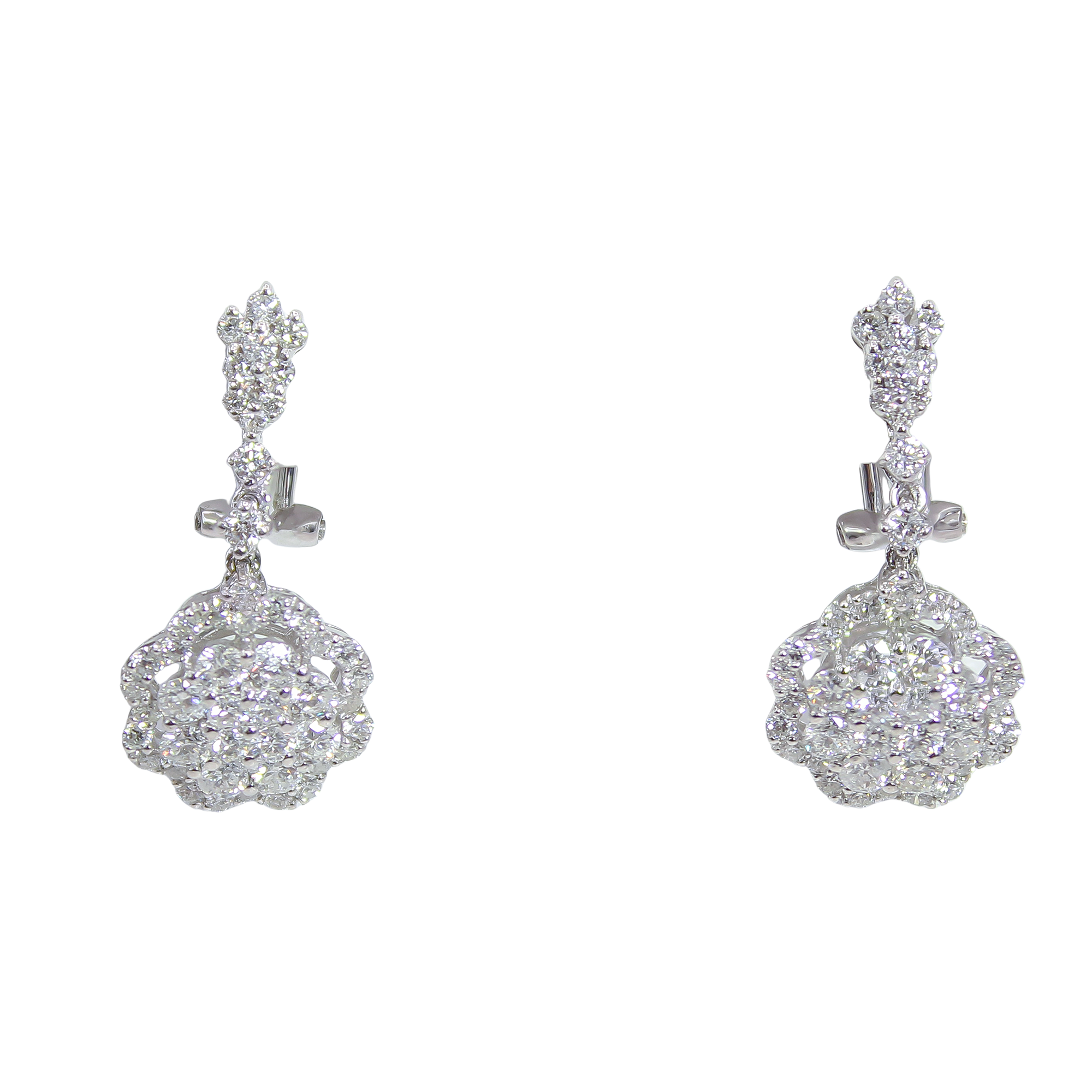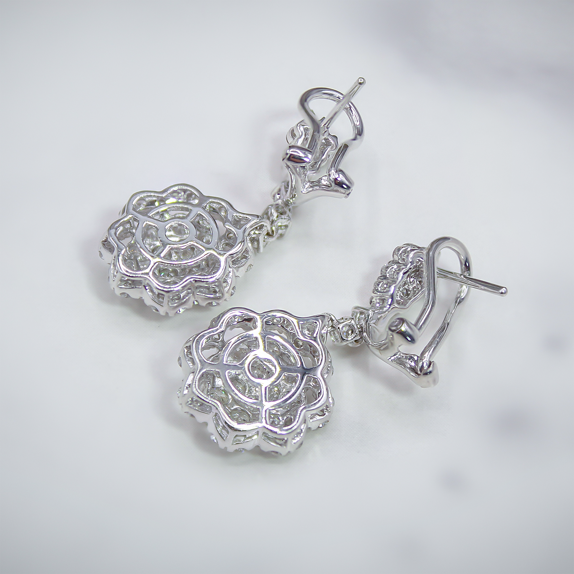 These earrings are pure kinetic energy. Crafted in gleaming 18k white gold, an articulated hinge allows the diamond-encrusted floral clusters to sway gently with every turn of your head, catching the light from every direction. The design is lush and full, utilizing tight pave work to create a seamless wall of sparkle that resembles a frozen flower. Fitted with high-end omega backs (clip and post) for superior comfort and security, these are heavy hitters that sit perfectly on the ear without drooping. A serious power piece for your jewelry wardrobe that demands attention.