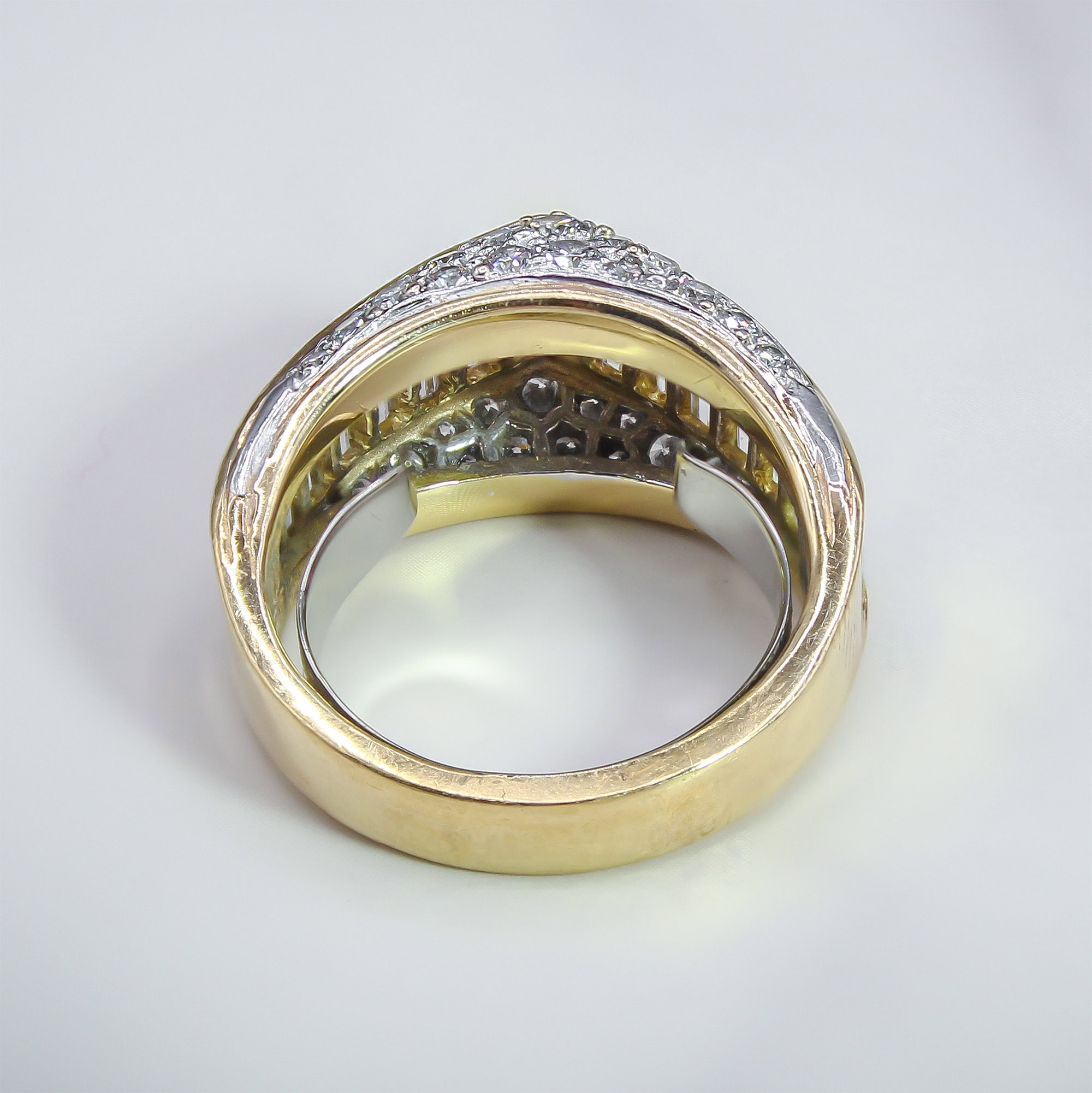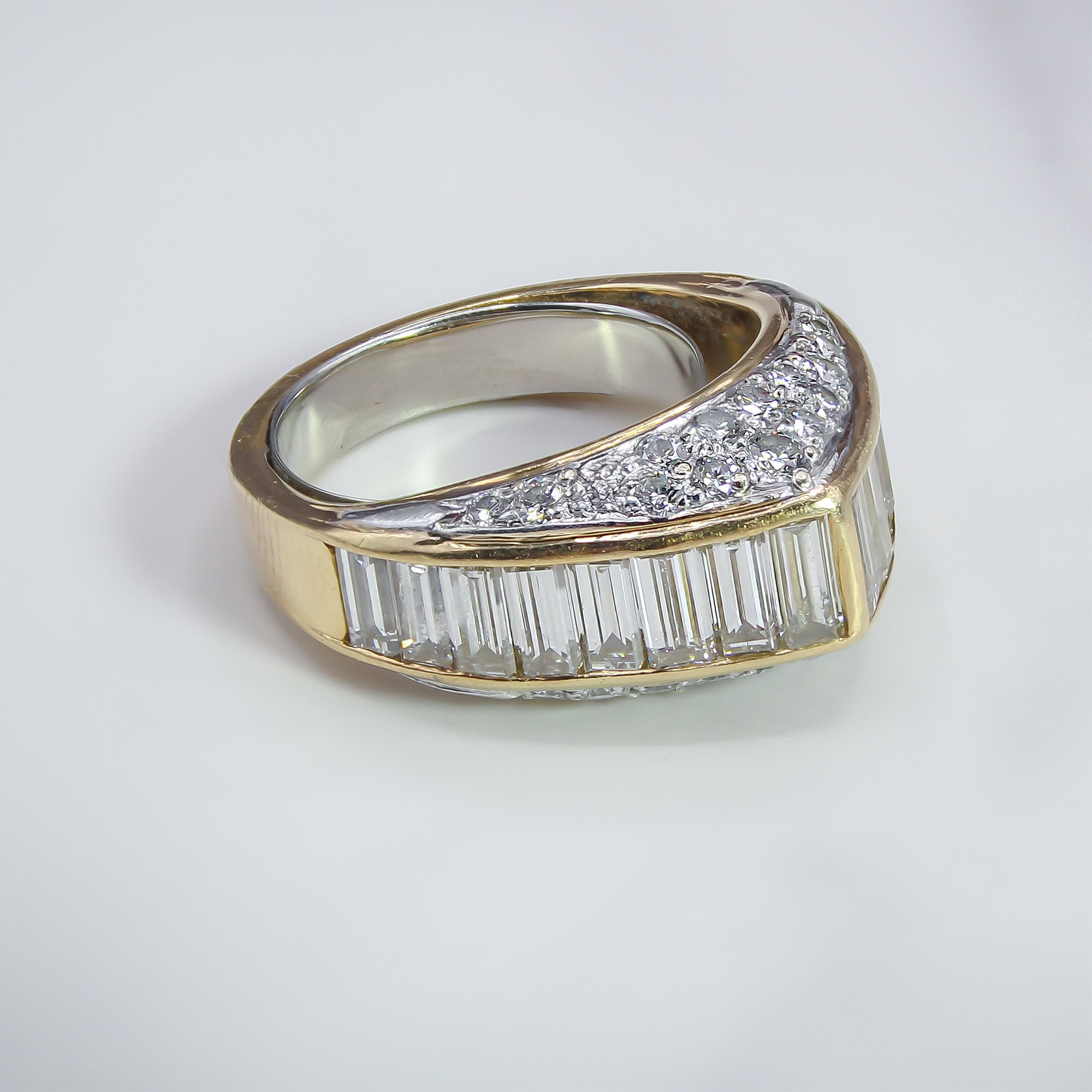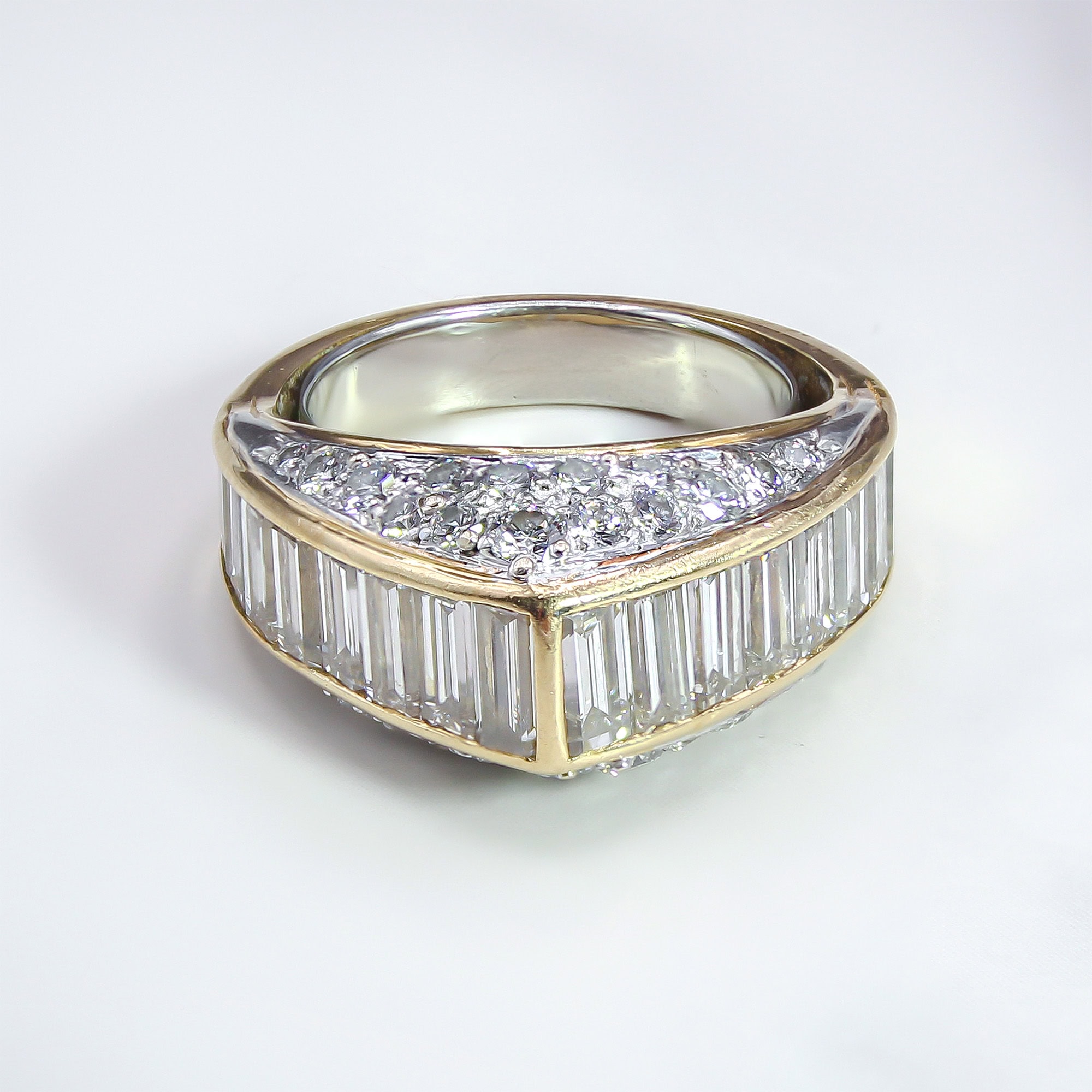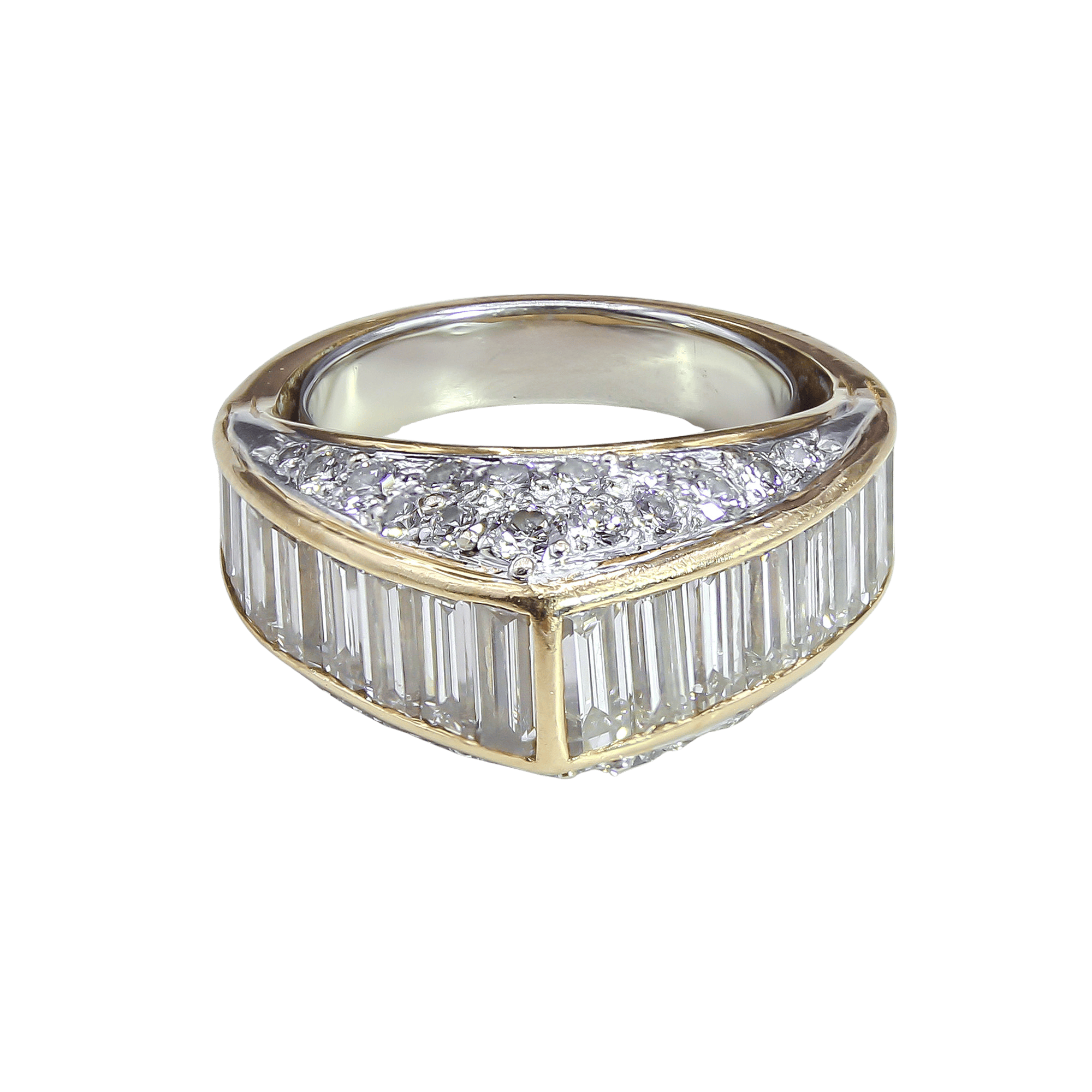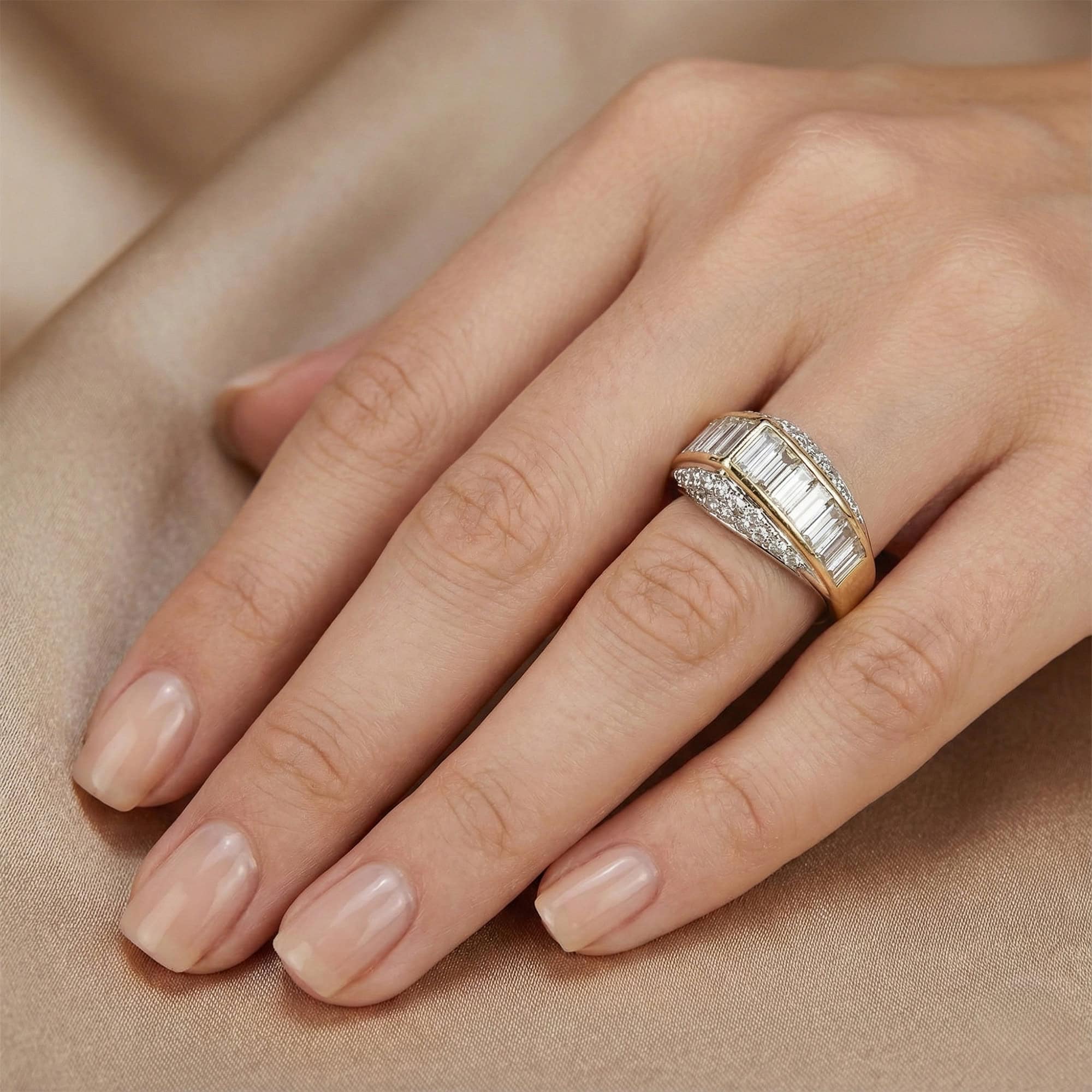 Make an unforgettable entrance with this architectural masterpiece of a ring, where structural elegance meets dazzling brilliance. The bold design features a gleaming channel of precision-set baguette diamonds that cascade down the sides, flanked by a sculpted gallery encrusted with glittering pavé-set round brilliant diamonds. Crafted in rich yellow gold with white gold accents to enhance the diamonds’ icy fire, this heavy, substantial piece feels incredibly luxurious on the hand. It captures light from every angle, creating a mesmerizing display of sparkle that transitions seamlessly from a power suit to evening wear.