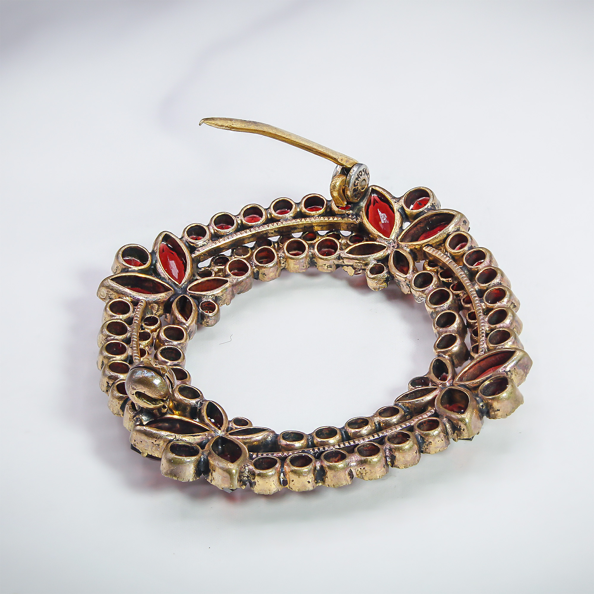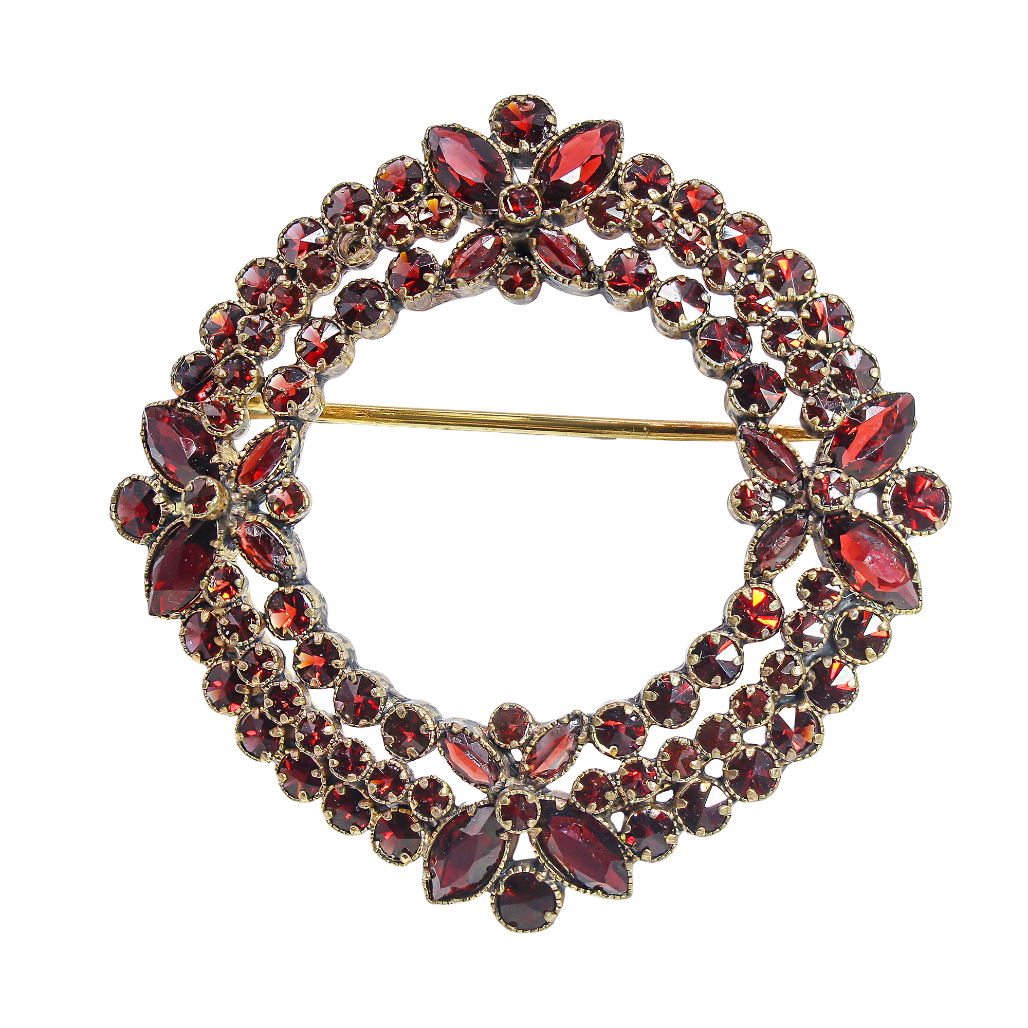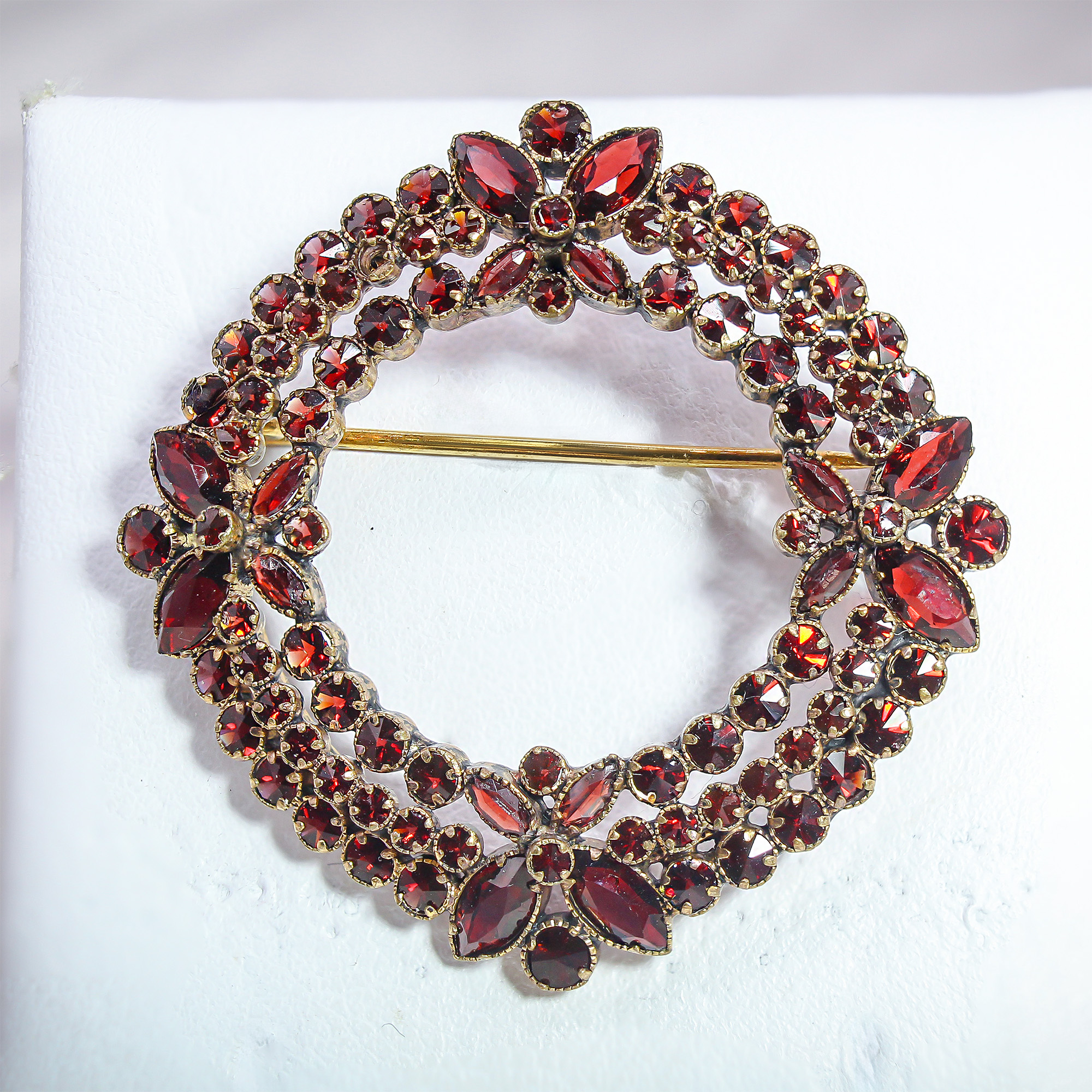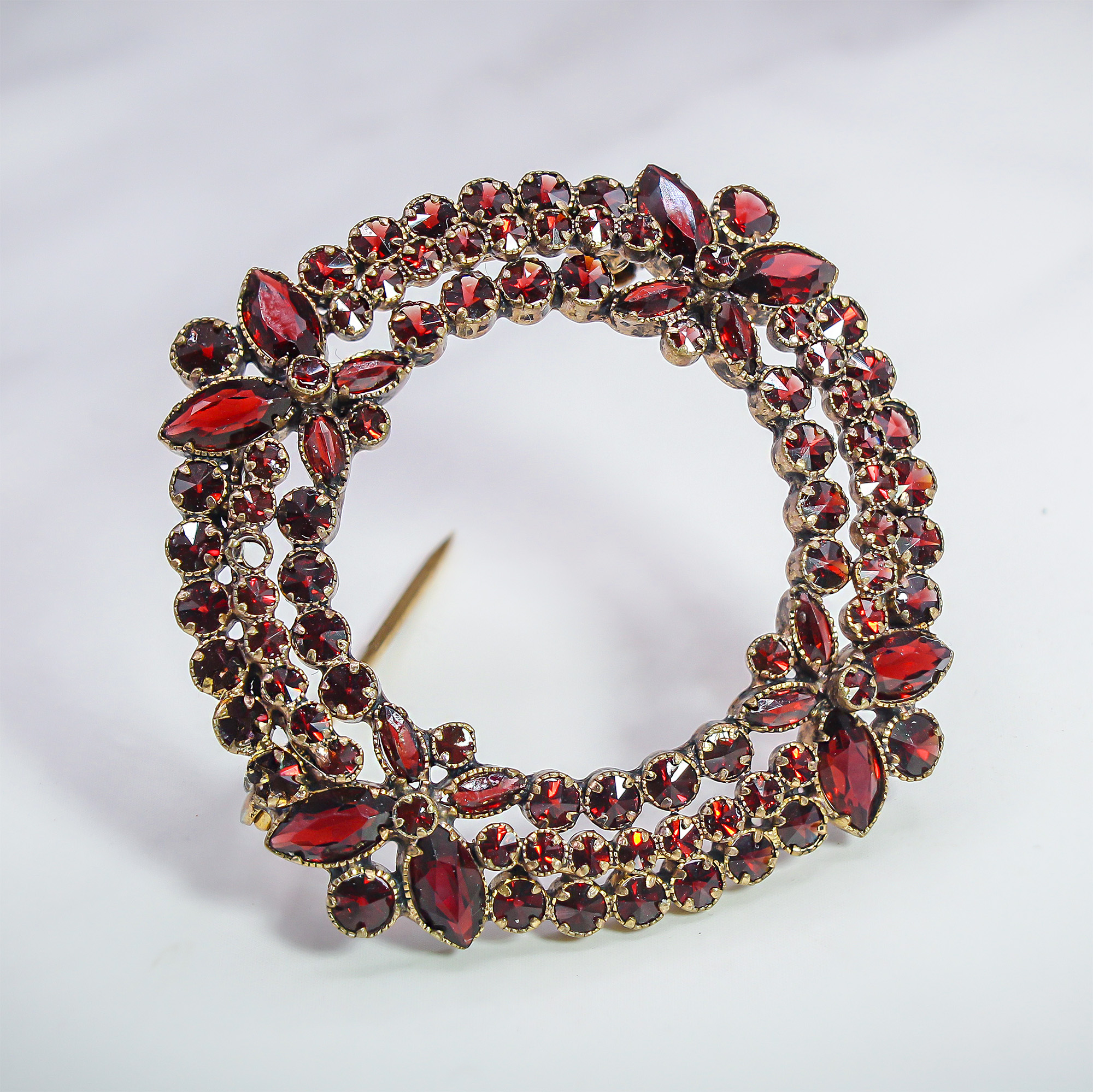 Steeped in the rich history of turn-of-the-century craftsmanship, this Bohemian garnet wreath brooch radiates a sophisticated, moody elegance. The meticulously set rose-cut stones capture the light with a celestial, wine-colored spark that modern glass simply cannot replicate. Whether pinned to a velvet lapel for a winter gala or worn as a sentimental heirloom for a special anniversary, its intricate floral clusters offer a window into the romantic artistry of the late Victorian era.