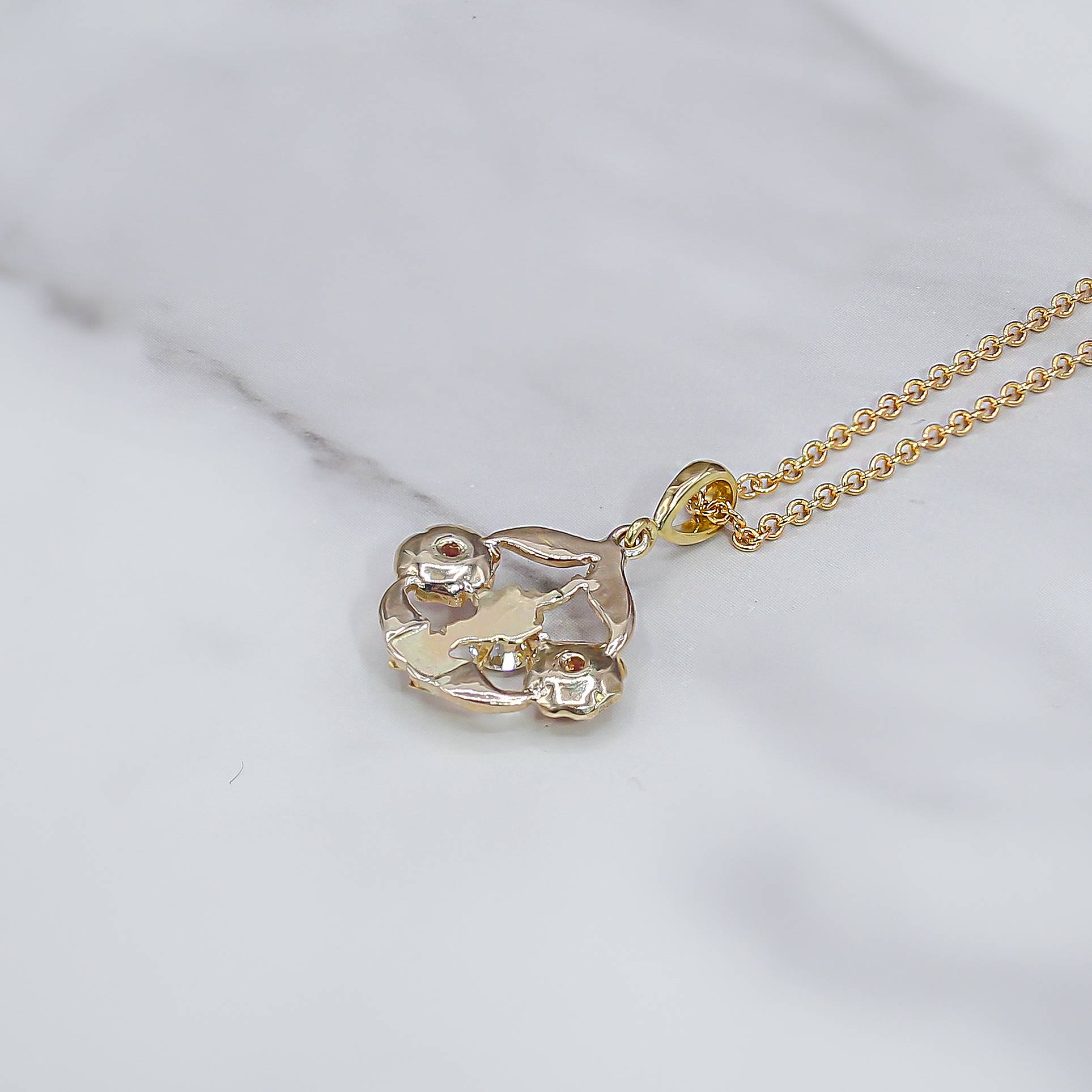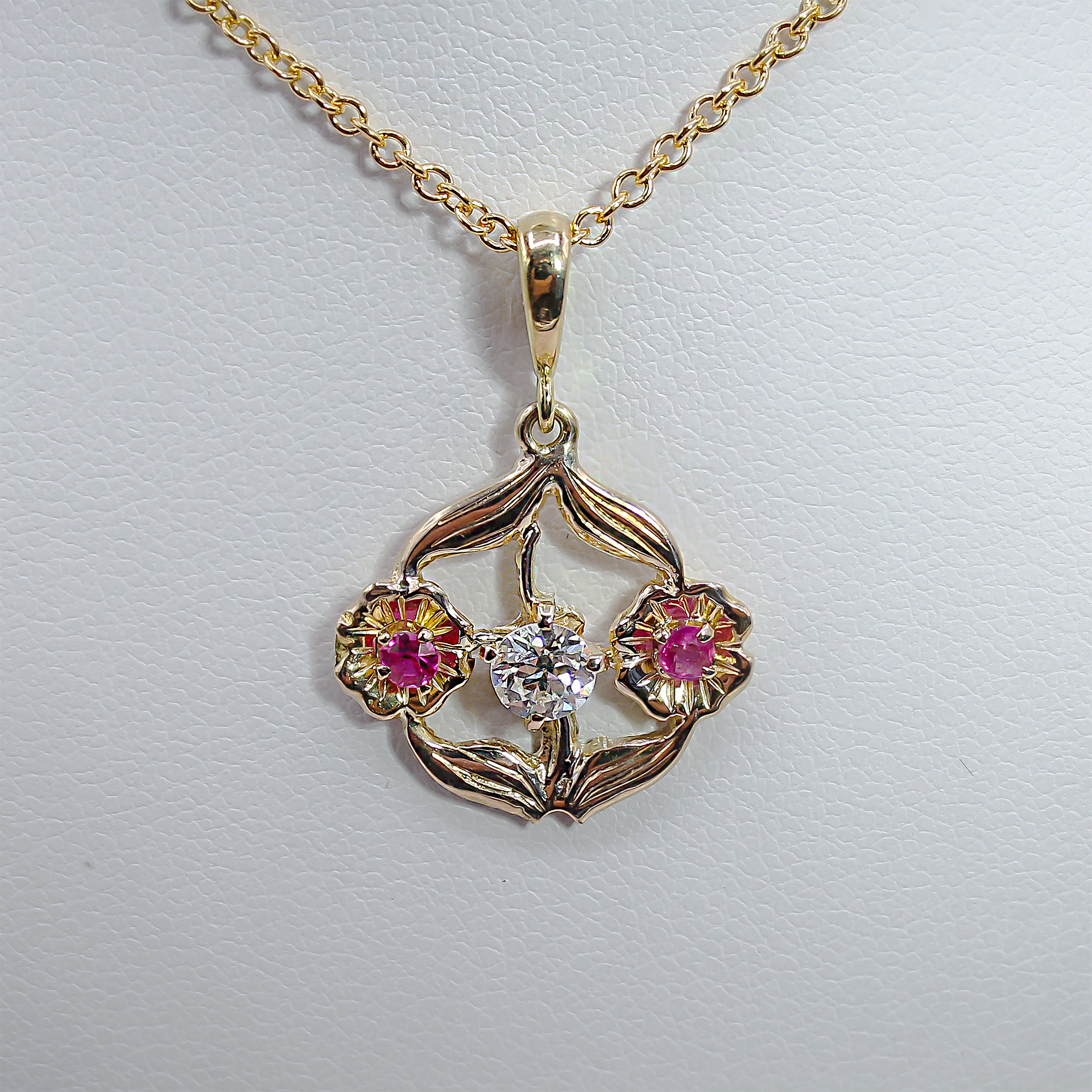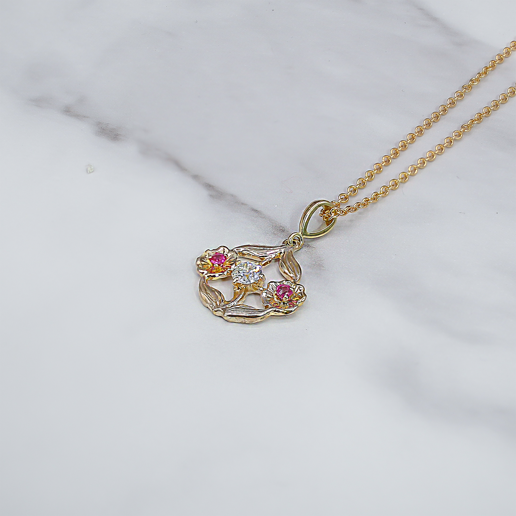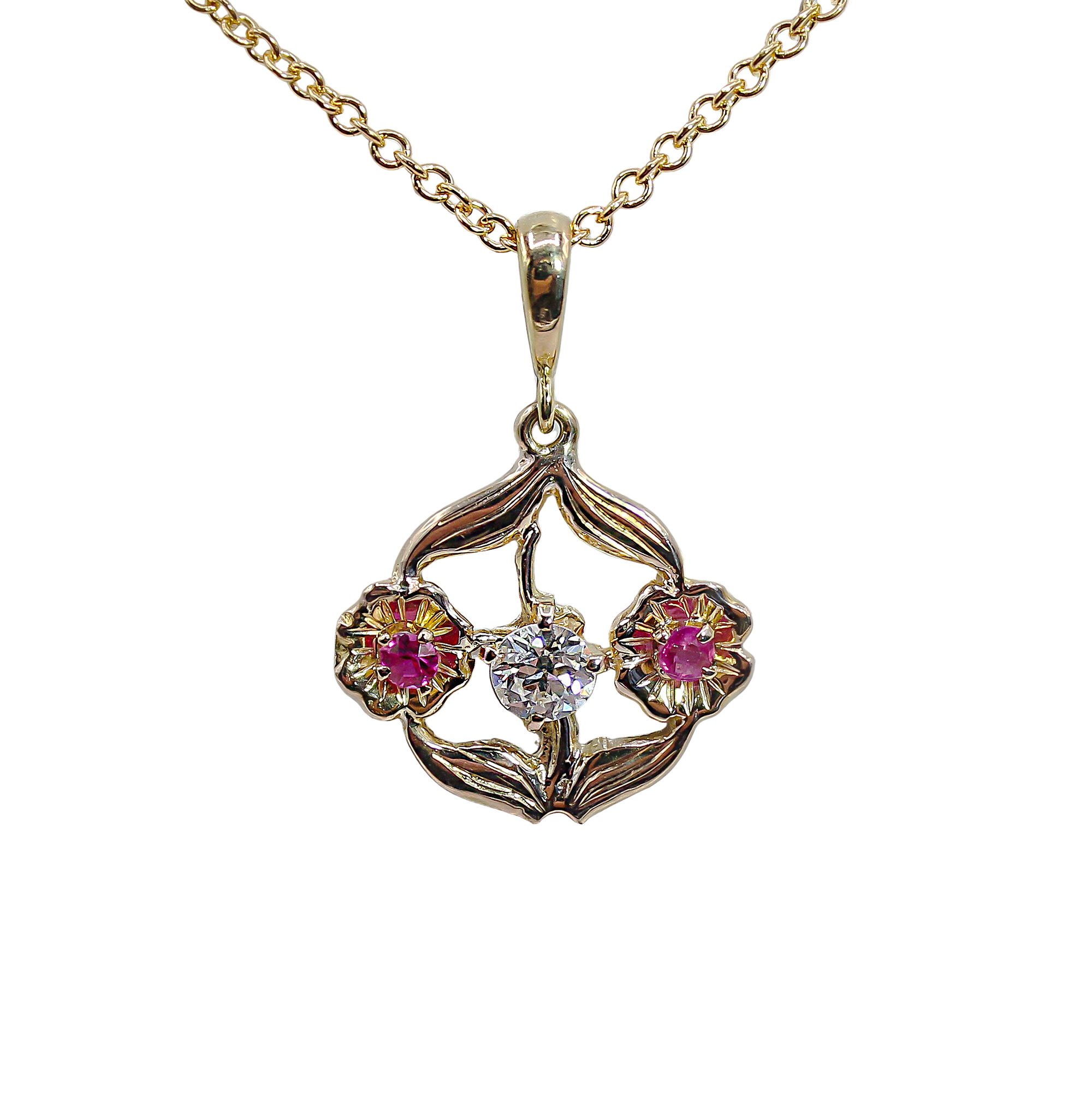 This exquisite pendant captures the flowing, natural beauty of the Art Nouveau movement. Crafted in luminous 14kt Yellow Gold, the design forms an open-work floral and foliate motif. At the center is a brilliant-cut natural Diamond, providing a central sparkle, while two smaller flower clusters on either side are accented with vibrant pinkish-red natural Rubies. The combination of the warm gold, bright diamond, and colorful rubies creates a delicate and captivating piece of wearable art, suspended from a matching gold chain.