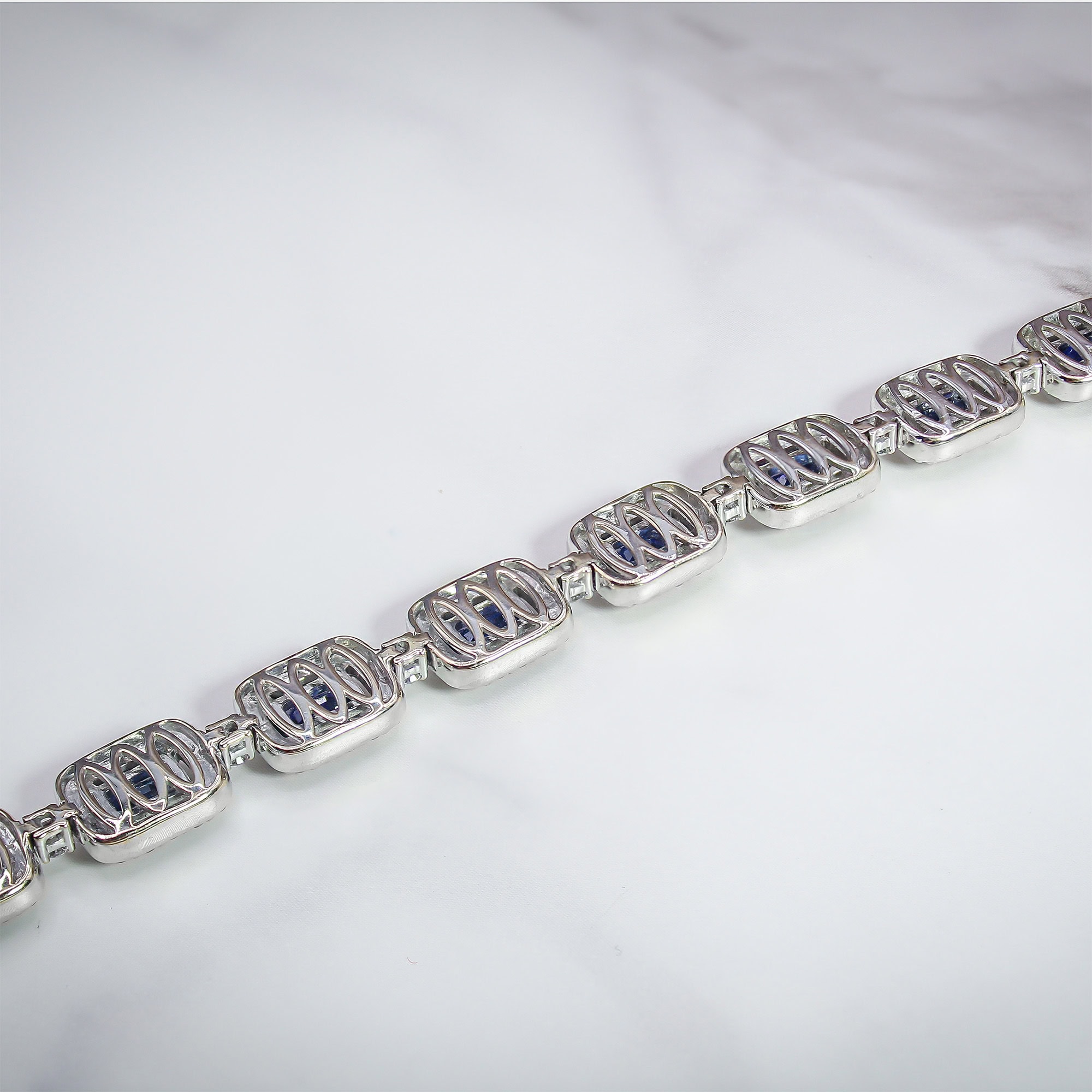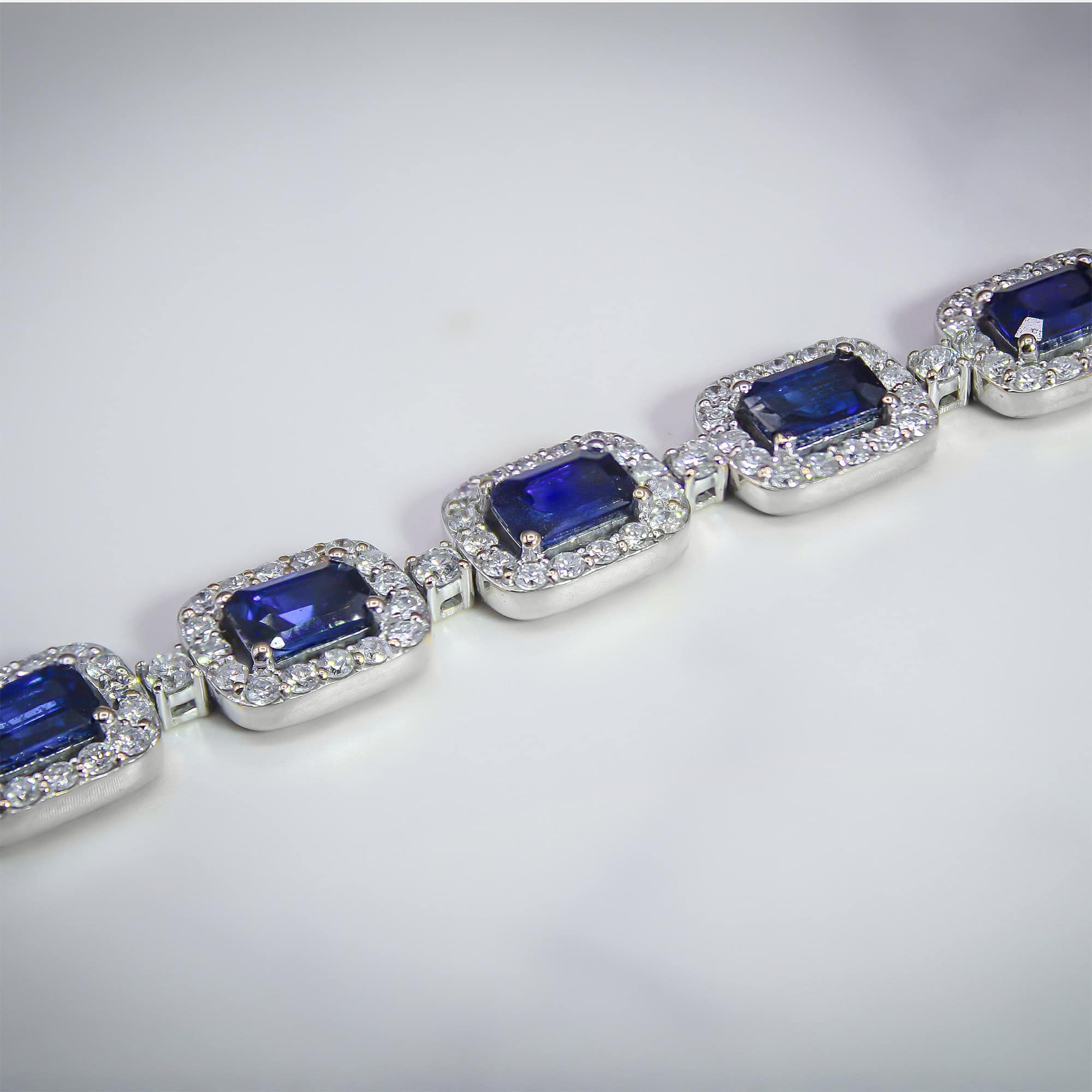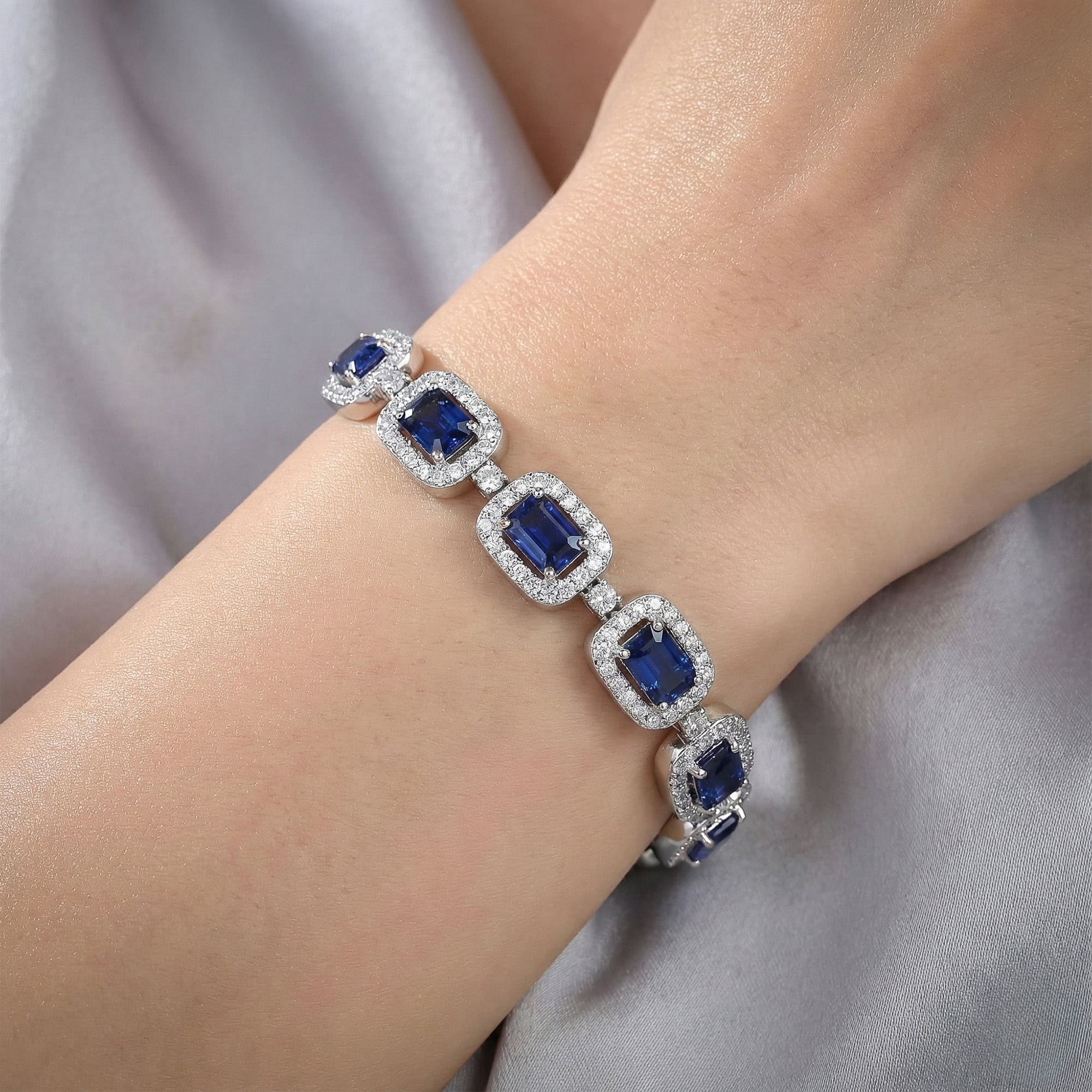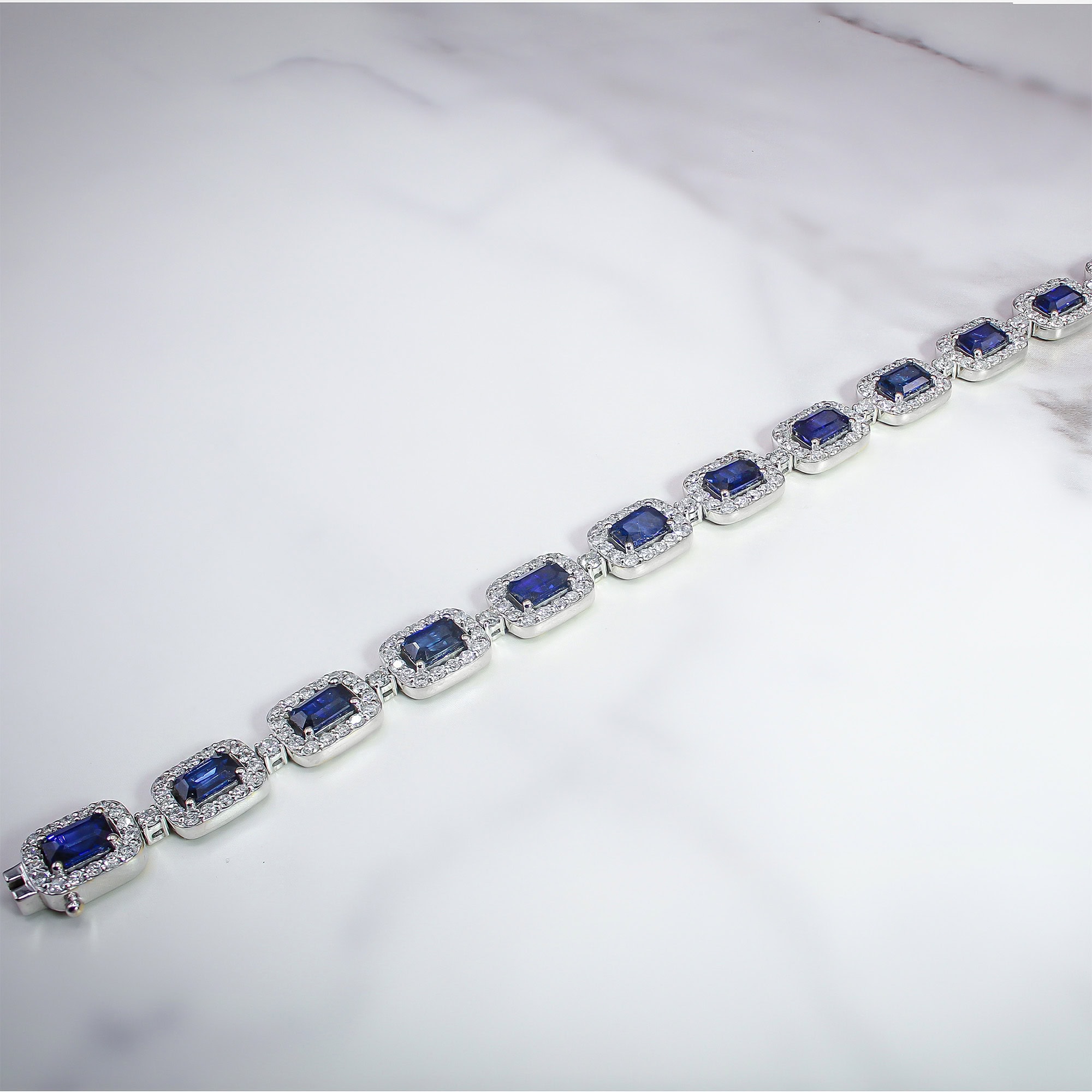 Wrap your wrist in the midnight-blue allure of deep sapphires and the blazing fire of brilliant diamonds. This substantial link bracelet features perfectly matched emerald-cut sapphires, each framed by a sparkling halo that captures and reflects light from every angle. The 18k white gold setting offers a silky, articulated drape, ensuring the piece moves fluidly with you, making it the ultimate accessory for black-tie galas or marking a significant anniversary. It is a masterpiece of contrast, where cool, icy metal meets the rich, velvety warmth of precious gemstones.