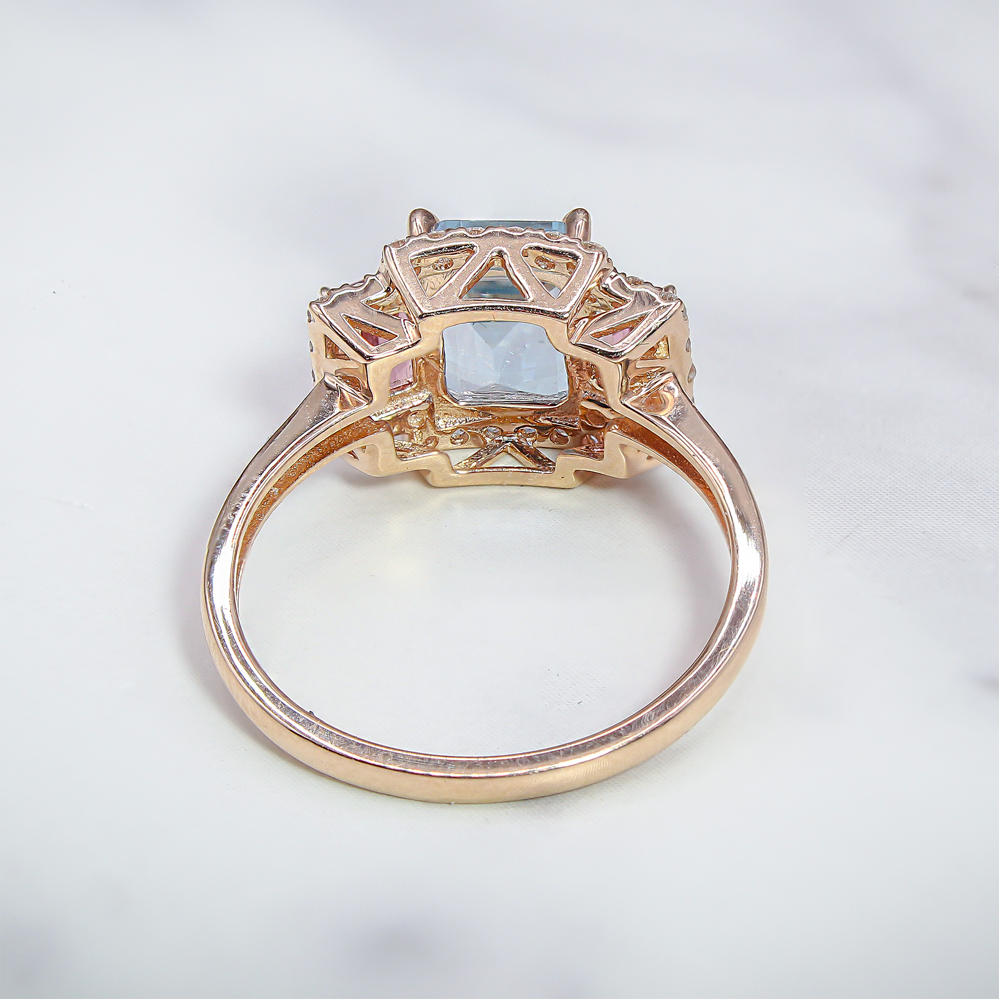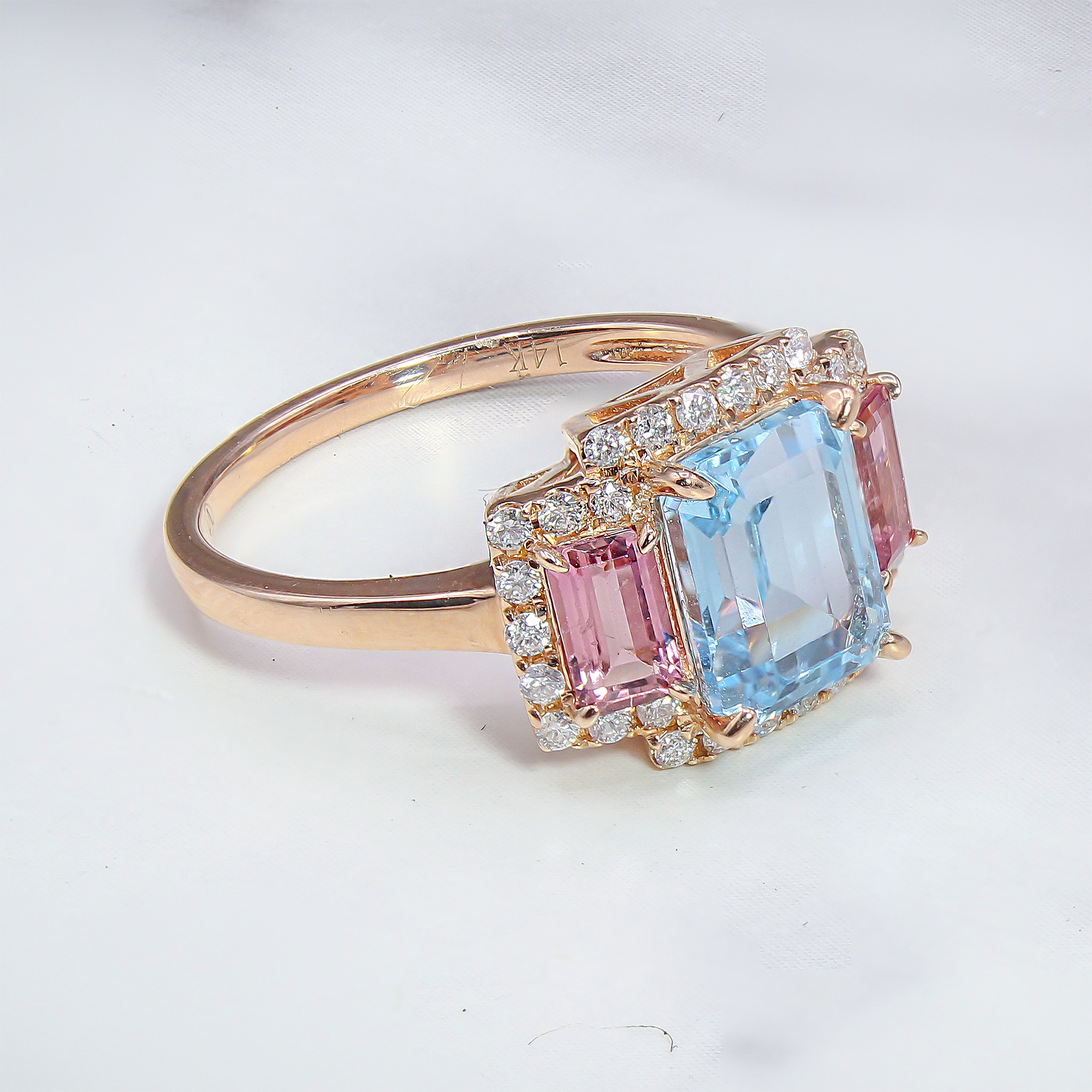 Bathed in the warm, sunset glow of rose gold, this three-stone halo ring offers a refreshing play of color that captures the eye from across the room. The crisp, sky-blue facets of the emerald-cut topaz are beautifully framed by the romantic blush of pink tourmalines, creating a sophisticated palette that feels both modern and timeless. Each stone is encircled by a delicate border of sparkling diamonds, ensuring a radiant shimmer that transitions effortlessly from a bright afternoon brunch to an elegant evening gala.