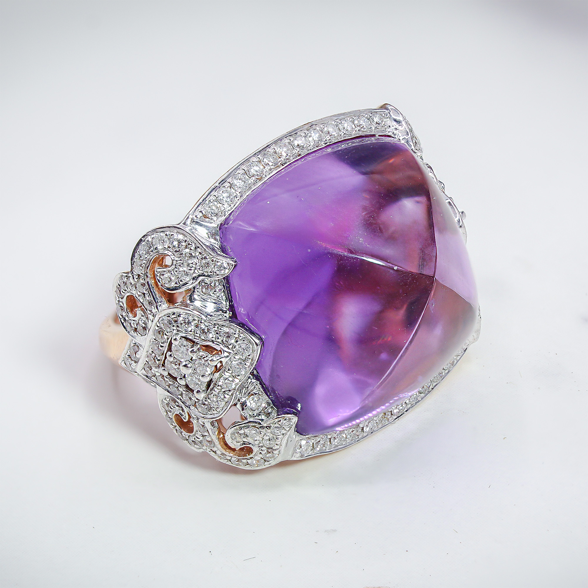 This striking cocktail ring centers a lush, velvet-purple amethyst featuring a unique “buff top” cut that creates a deep, liquid-like pool of color. Intricate rose gold filigree and scrolling metalwork peek through the gallery, while a shimmering halo of brilliant diamonds catches the light from every angle. Whether worn to a gallery opening or an intimate anniversary dinner, this ring radiates a sophisticated warmth and an undeniable sense of mystery.