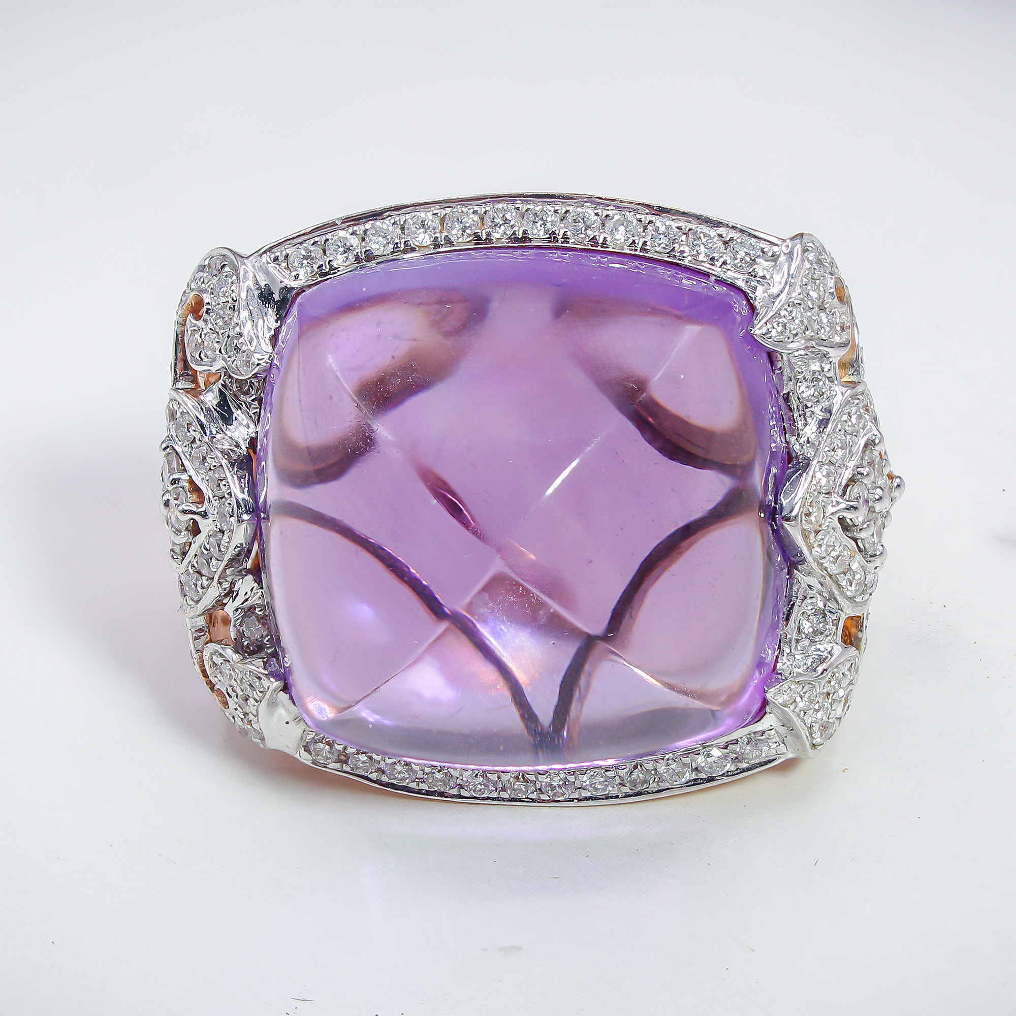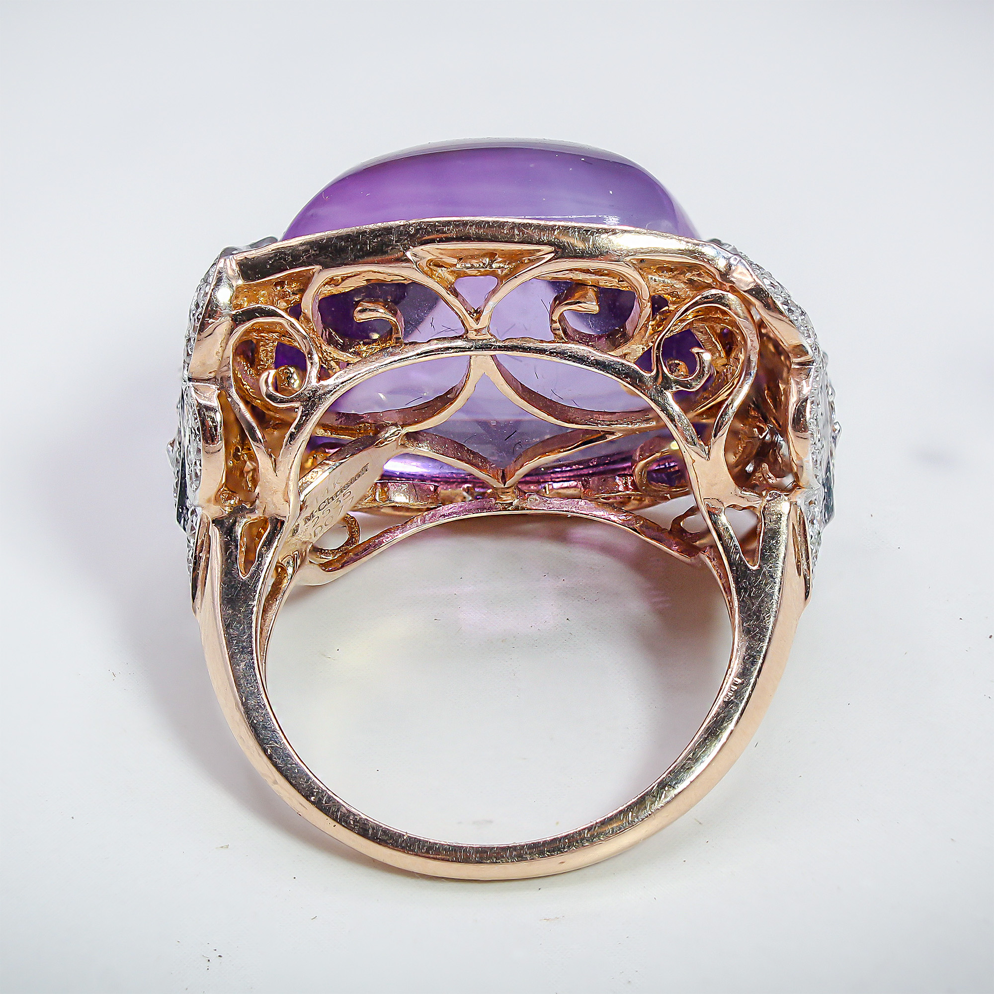 “The combination of the smooth, tactile amethyst surface and the romantic rose gold filigree makes this a standout architectural piece you won’t find in modern mass-produced jewelry.”