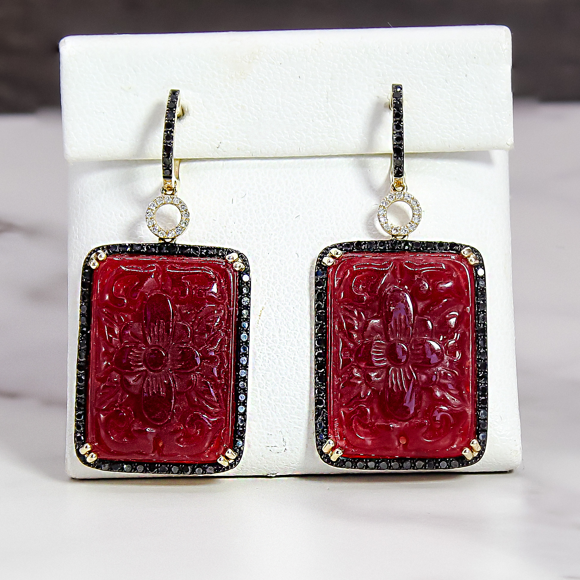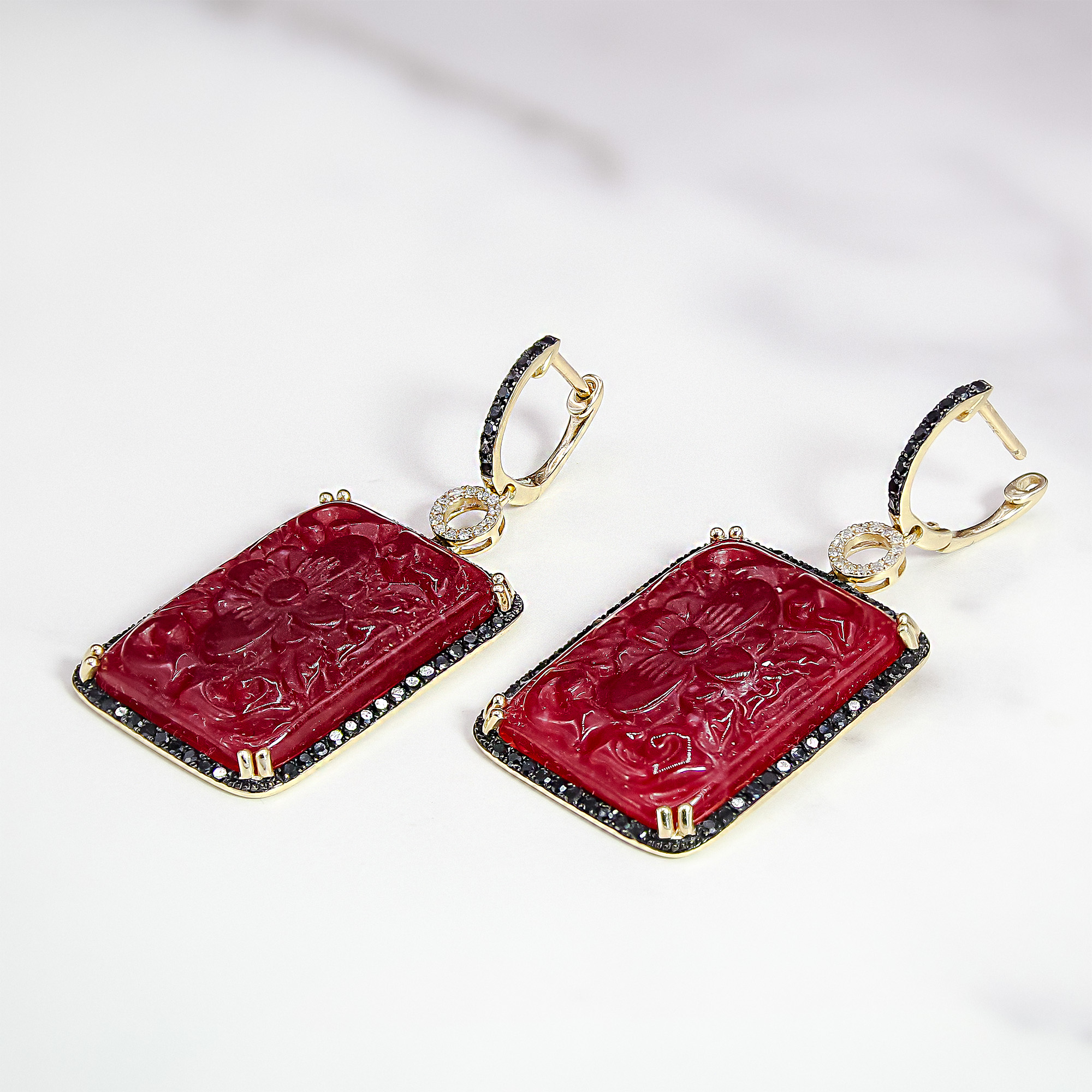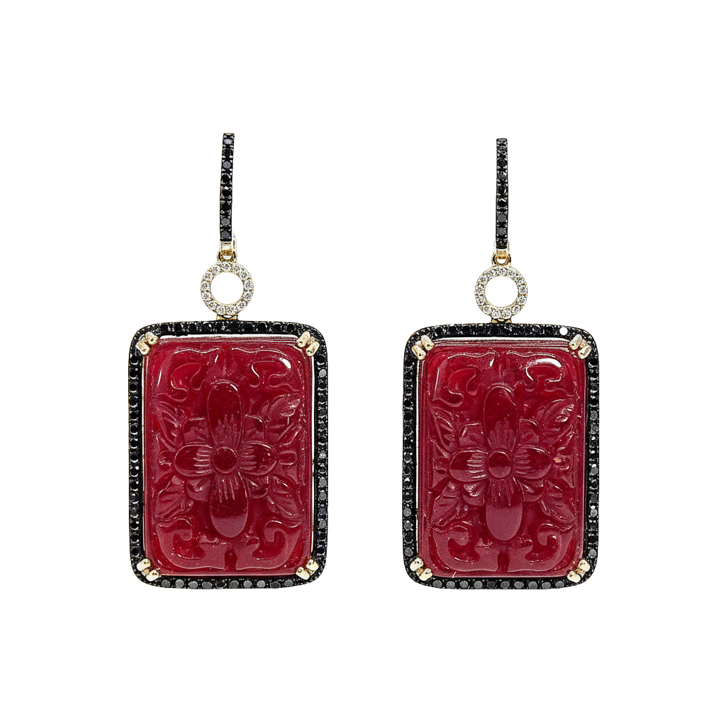 These striking drop earrings by Dabakarov feature magnificent rectangular carved ruby agate stones, each showcasing a beautifully intricate floral design. The rich, deep red of the agate is framed by a dazzling border of pave-set black diamonds, creating a dramatic contrast. Above the main drop, the lever-back closure is adorned with a delicate circle of sparkling white diamonds, adding a touch of brilliant light. Crafted in lustrous 14k yellow gold, these statement earrings exude a bold yet sophisticated luxury, perfect for making an unforgettable impression.