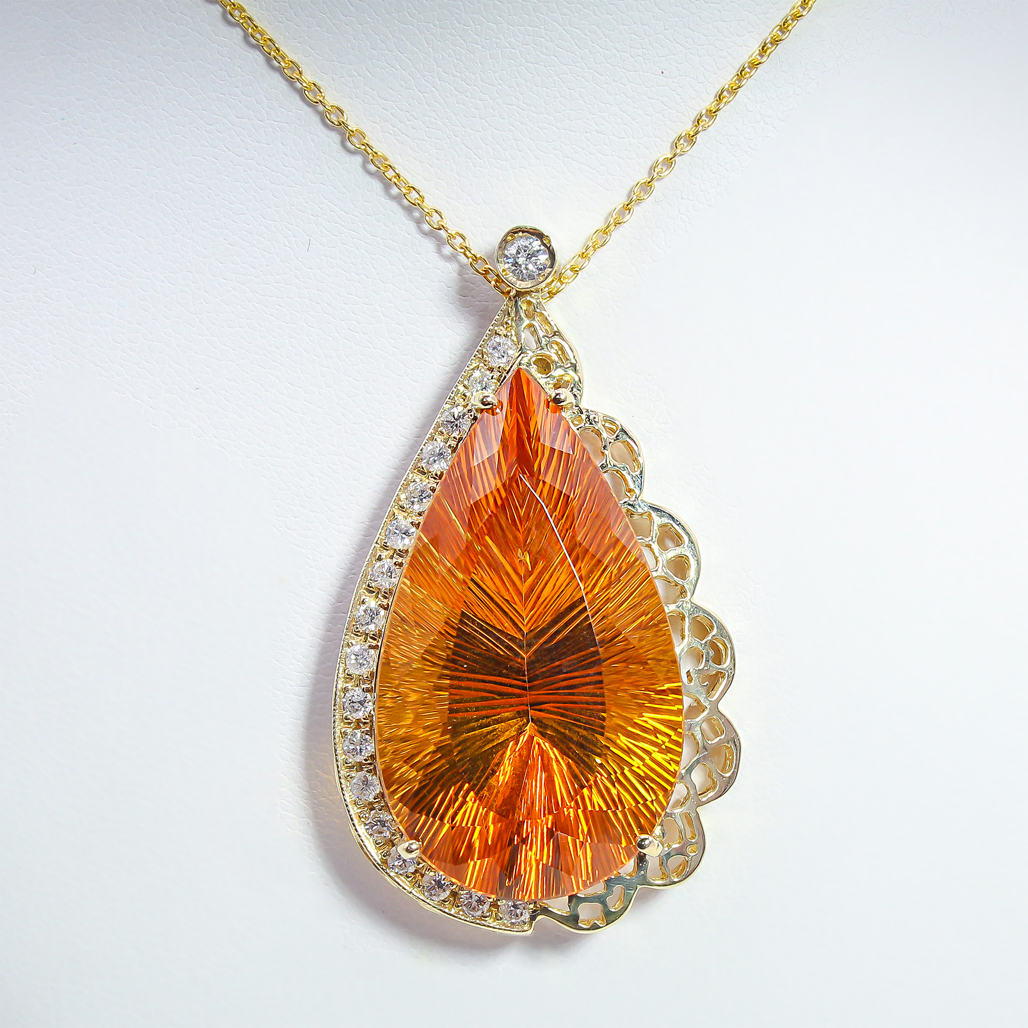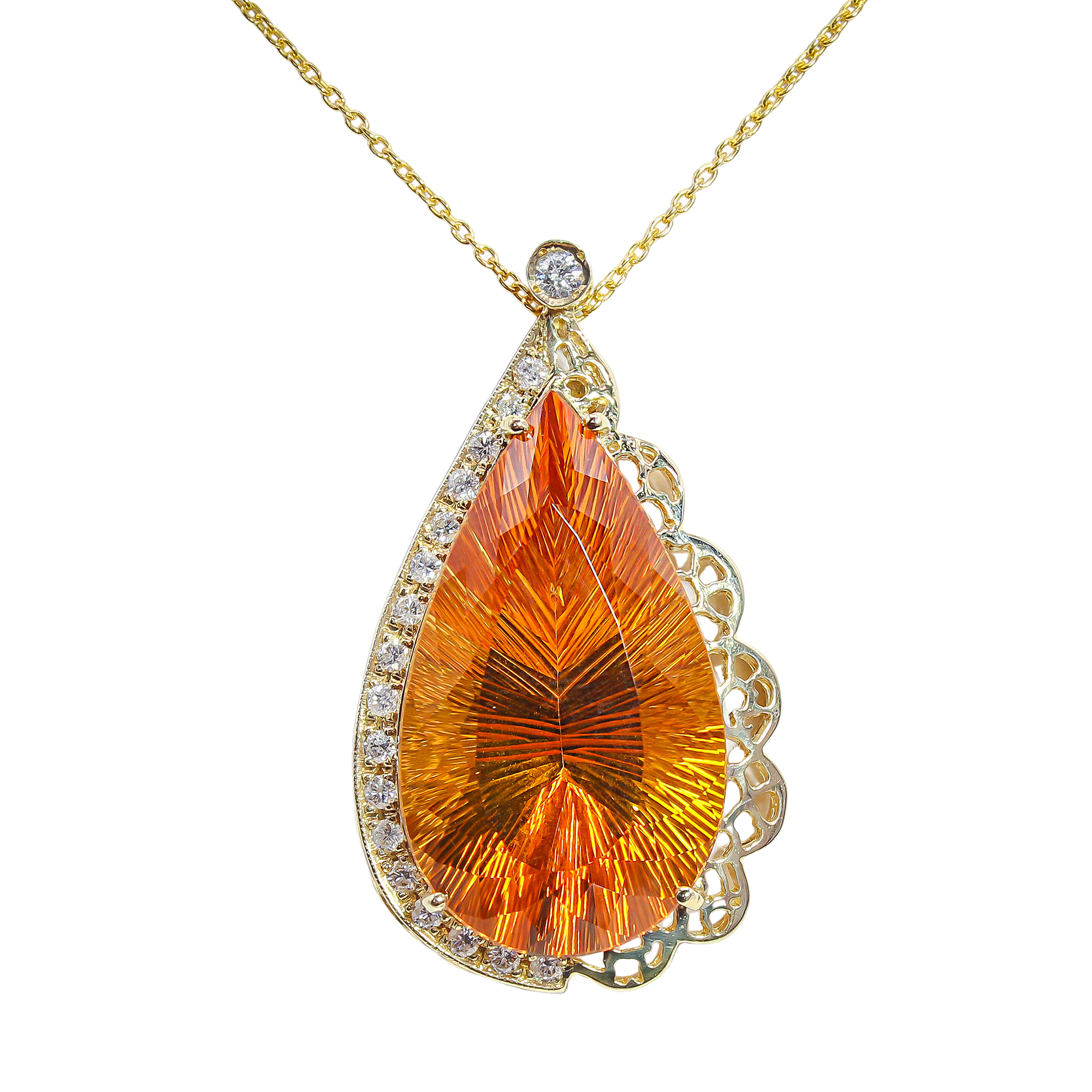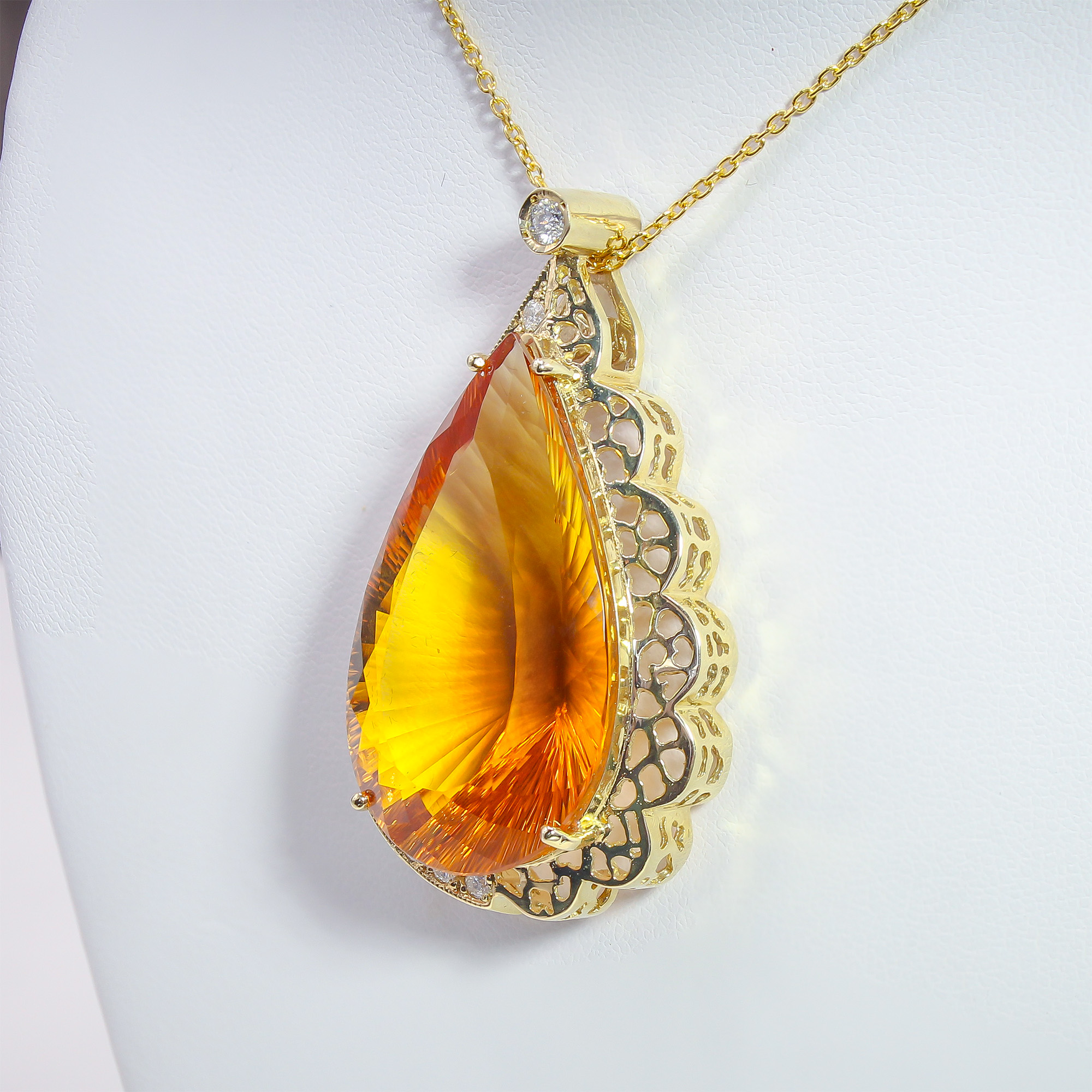 Bask in the warm, golden glow of this monumental 44.84ct teardrop citrine, featuring an intricate “fantasy” cut that creates a mesmerizing dance of light within the stone. The honey-hued gem is cradled in an ornate 14kt yellow gold frame, detailed with delicate openwork filigree and a shimmering scalloped border of brilliant-cut diamonds. This extraordinary estate pendant serves as a true wearable sunbeam, perfect for making an unforgettable entrance at your next gala or high-profile celebration.