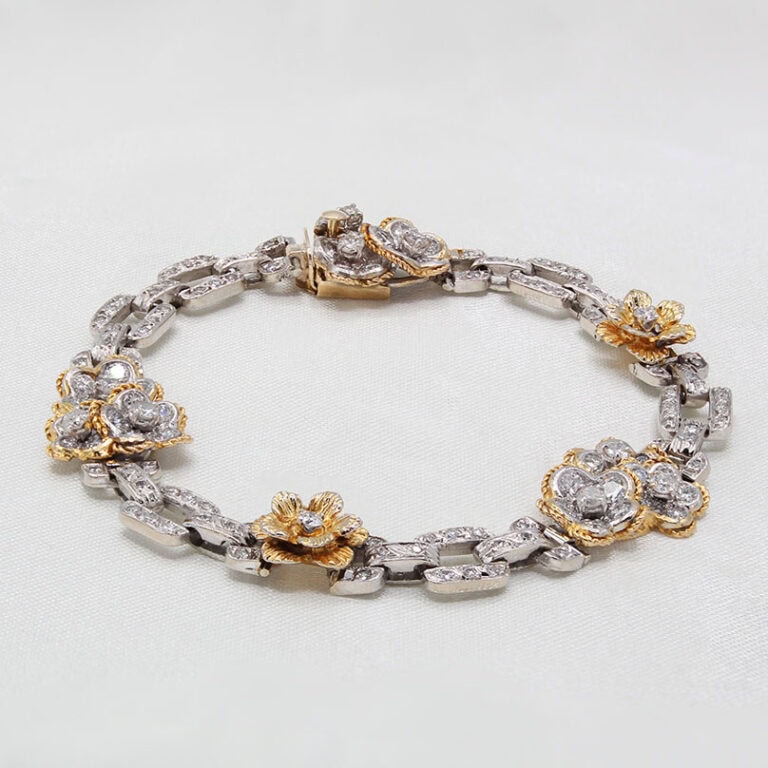 A palette of beautiful colors are brought to this bracelet by many sapphires. The multicolored sapphires total a weight of 4.20ct and are surrounding by diamonds totaling a weight of 1.34ct. This amazing design is crafted out of 14kt white gold.