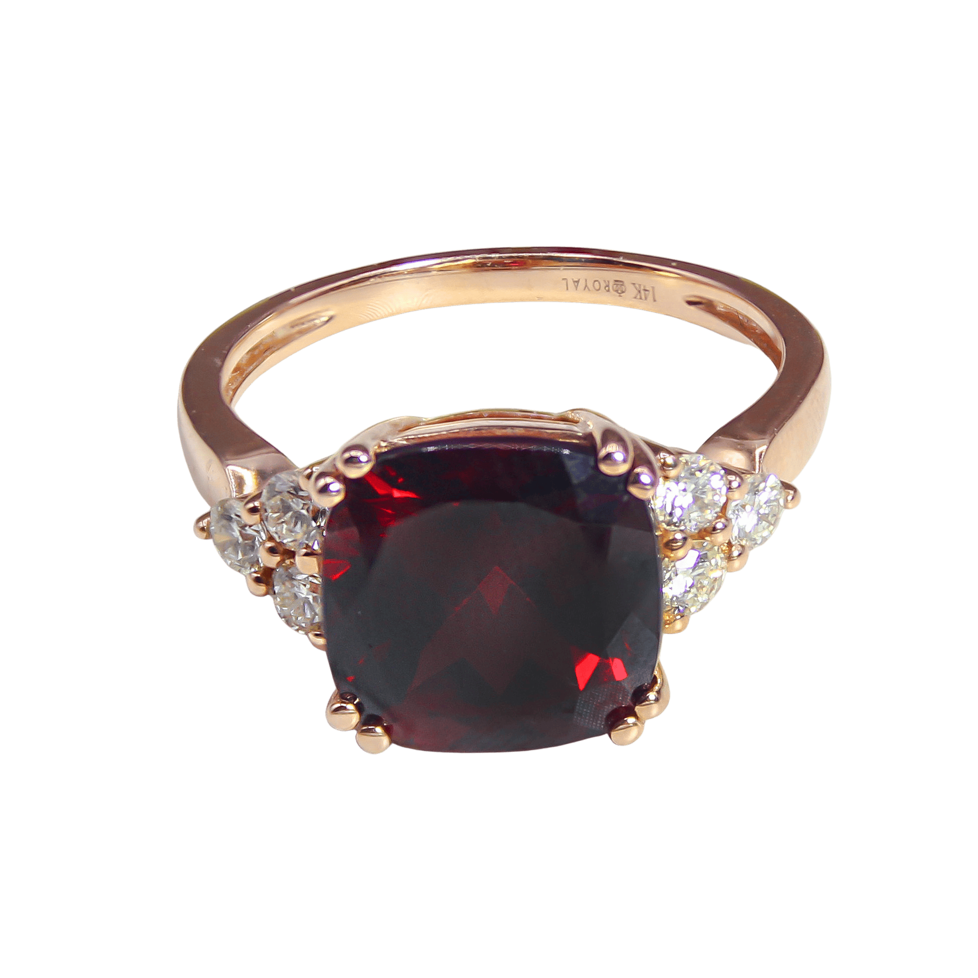 “The pairing of the deep red garnet with the blush tones of rose gold creates a sophisticated, romantic palette that stands out from traditional yellow or white gold styles.”