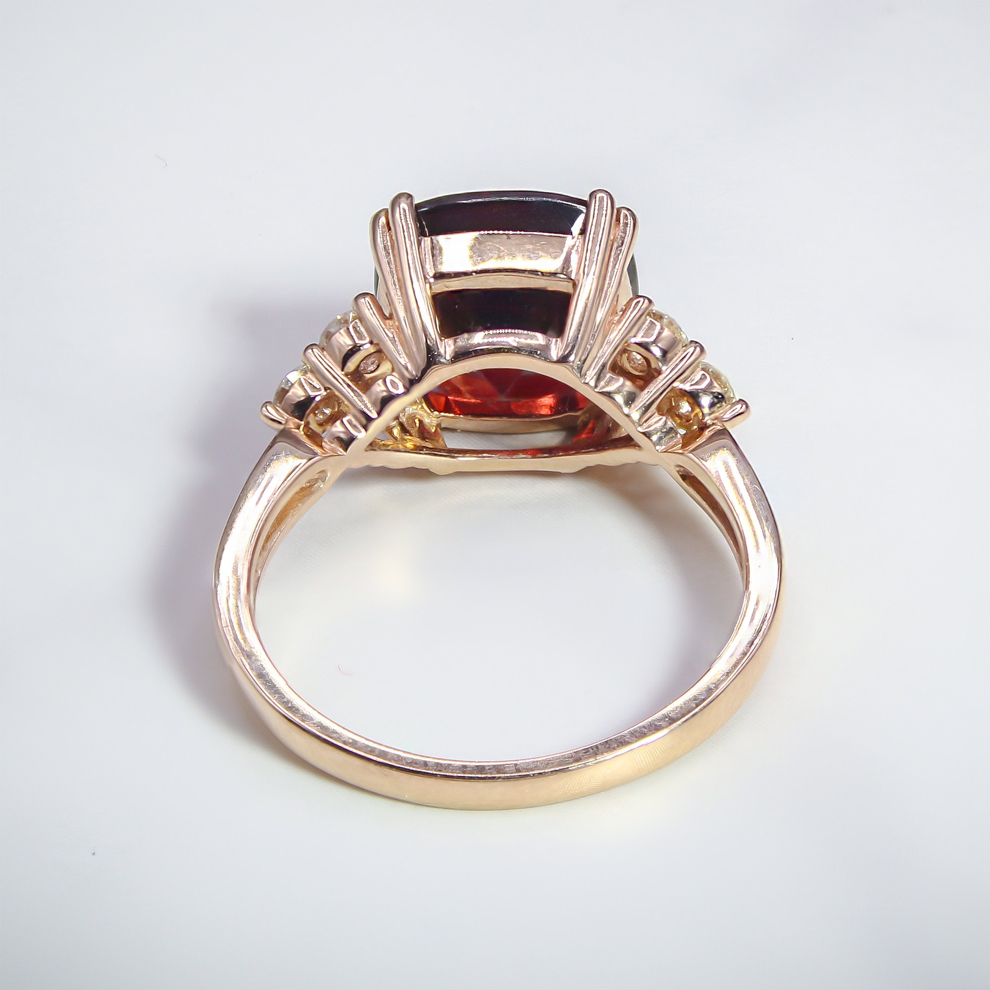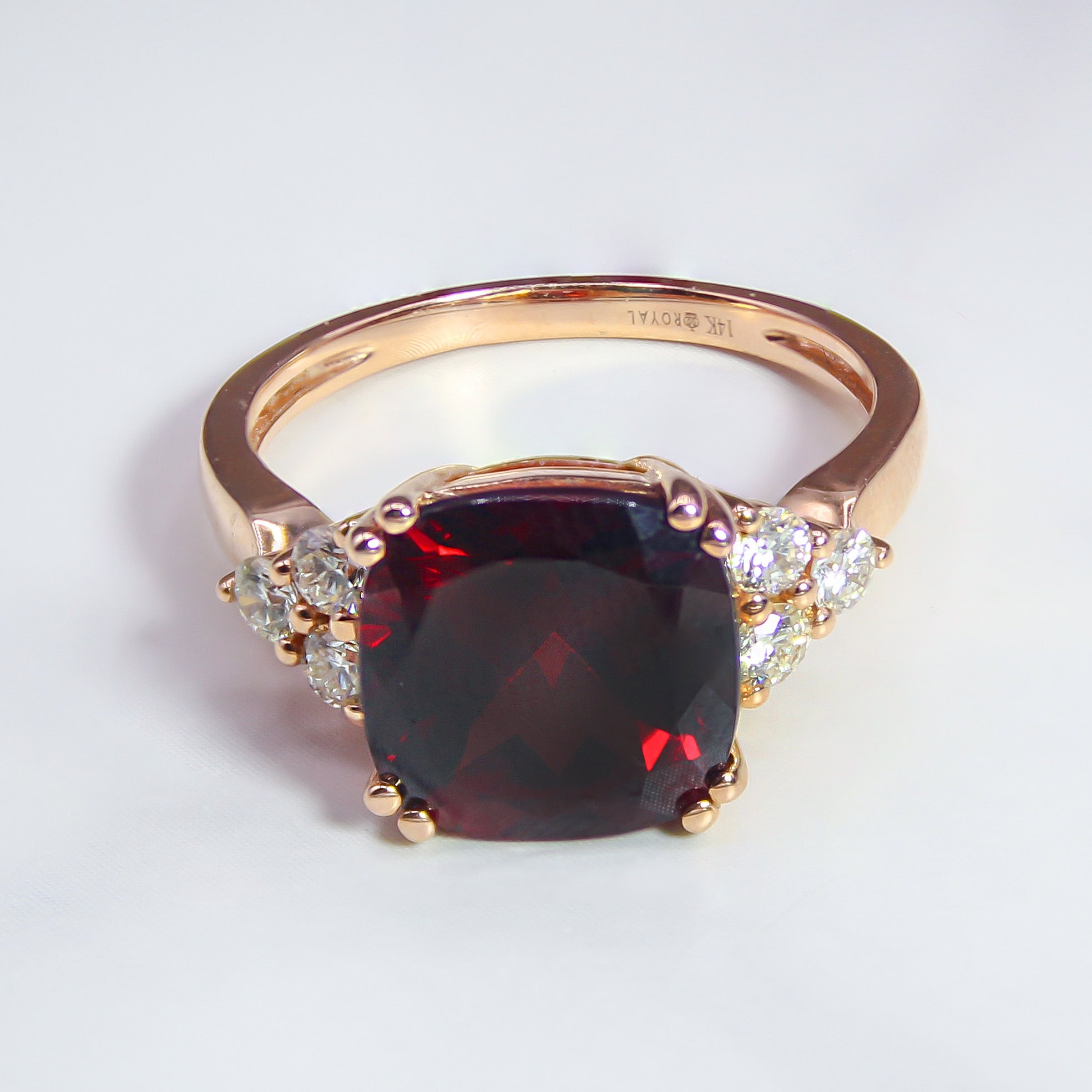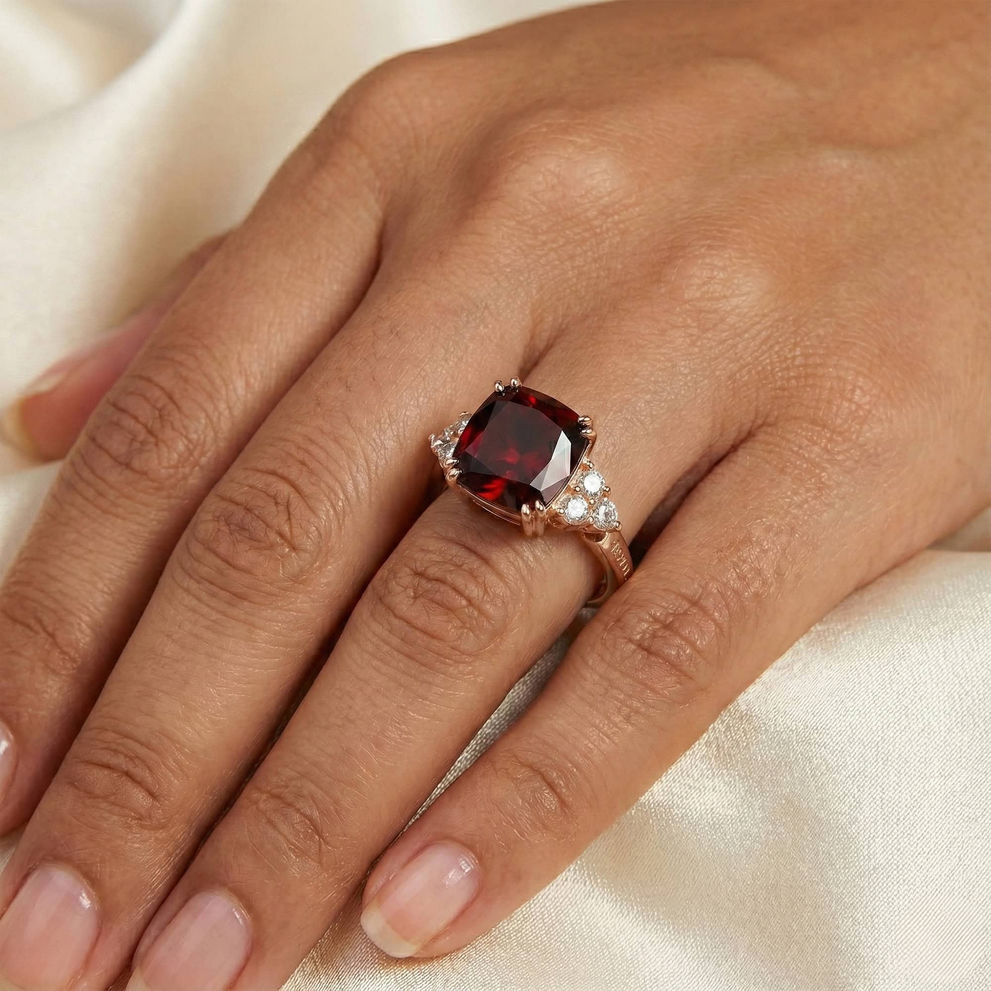 Embrace the sultry elegance of this magnificent cushion-cut Garnet ring, boasting a deep Bordeaux hue that glows with an inner fire. The substantial center stone is perfectly cradled in warm rose gold, creating a monochromatic harmony that is both modern and deeply romantic. Flanked by sparkling triangular clusters of bright white diamonds, this piece captures the light from every angle, making it an unforgettable choice for a milestone January birthday or a sophisticated evening statement.