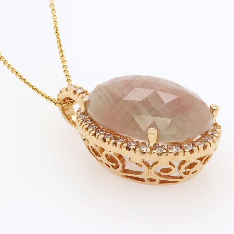 A citrine pendant designed by Dabakarov features a unique overlay of gold and diamond swirls. The center citrine weighs 13.75ct and is set in 14kt yellow gold. Diamonds total a weight of 0.16ct and are set in complimenting white gold.
