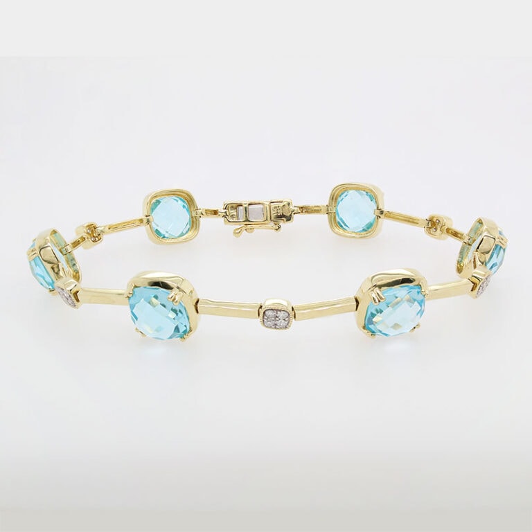 Smoky topaz, blue topaz, amethyst, and citrine are set around a unique bracelet designed by Dabakarov. The multi-colored stones weigh a total of 34.47ct and are accompanied by diamonds that are set in between each. The diamonds total a weight of 0.21ct and are set in 14kt yellow gold with black rhodium.