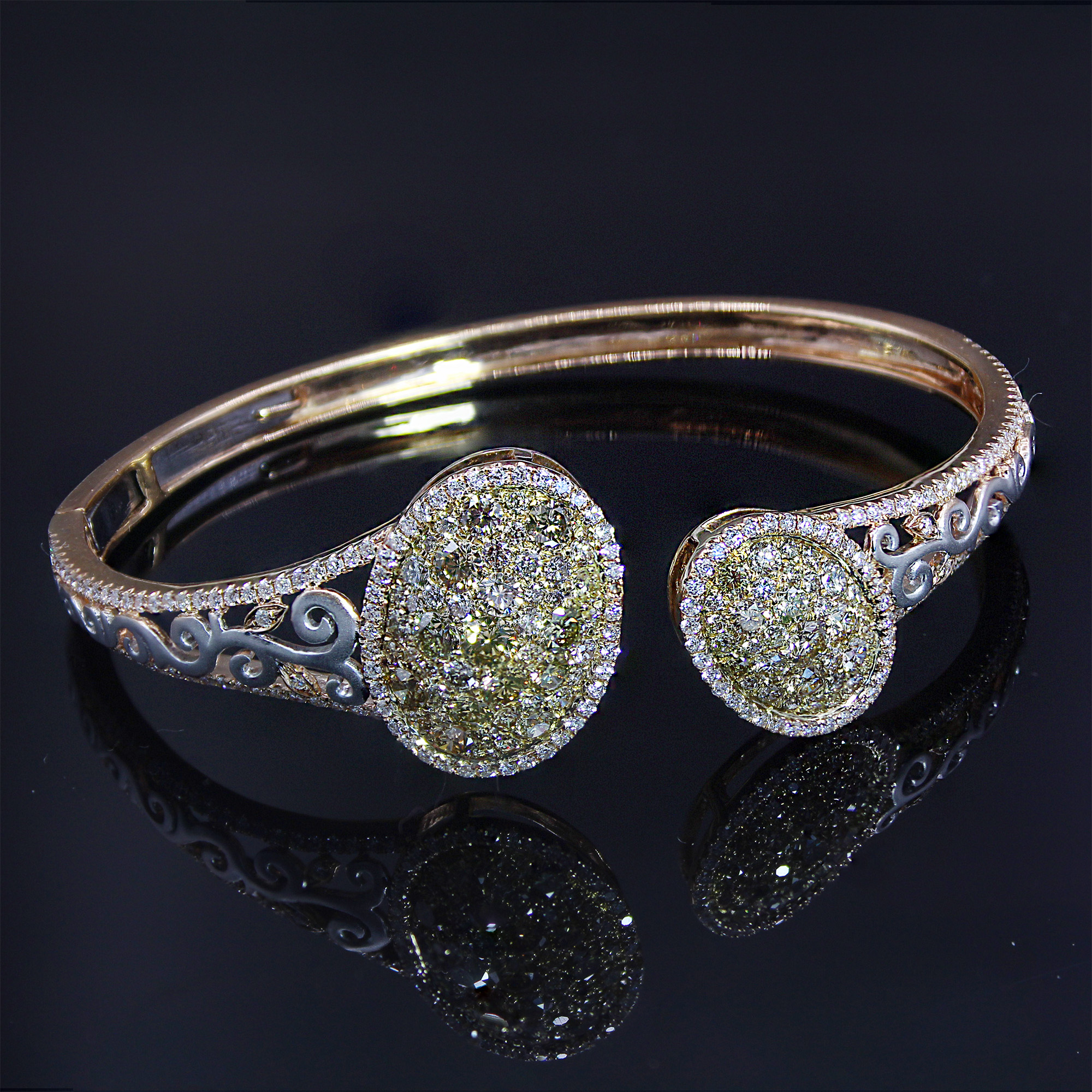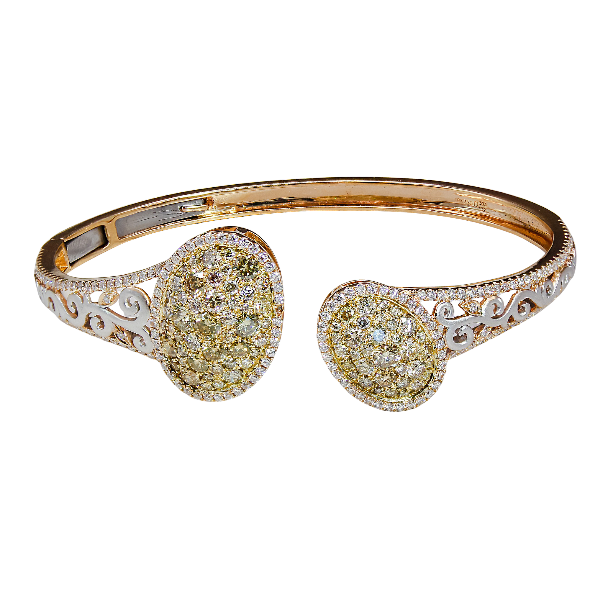Discover the exquisite artistry of Dabakarov in this striking 18kt two-tone gold cuff bangle. The open-crossover design culminates in two breathtaking oval settings, one slightly larger than the other, creating a dynamic, asymmetrical appeal. Each oval is paved with a dense cluster of brilliant-cut natural yellow diamonds, creating a rich, sunlit sparkle that commands attention. A halo of dazzling white diamonds frames these clusters, further enhancing their vibrant glow. The sides of the 18kt gold band feature meticulous scrollwork detailing in contrasting white gold, adding a sophisticated, lacy texture to the substantial yellow gold frame. This hinged bangle is a true statement piece, flawlessly blending bold, modern form with timeless diamond luxury.