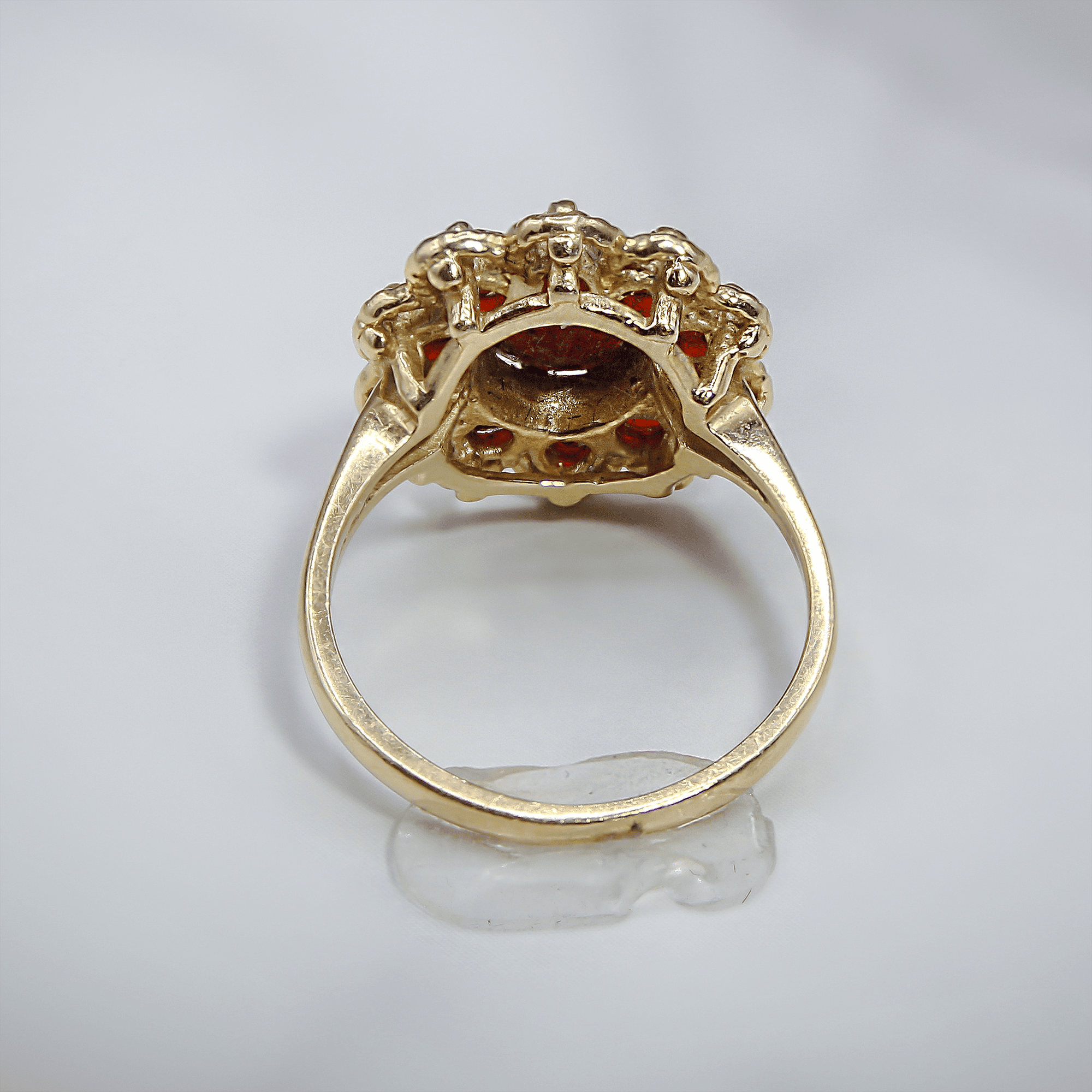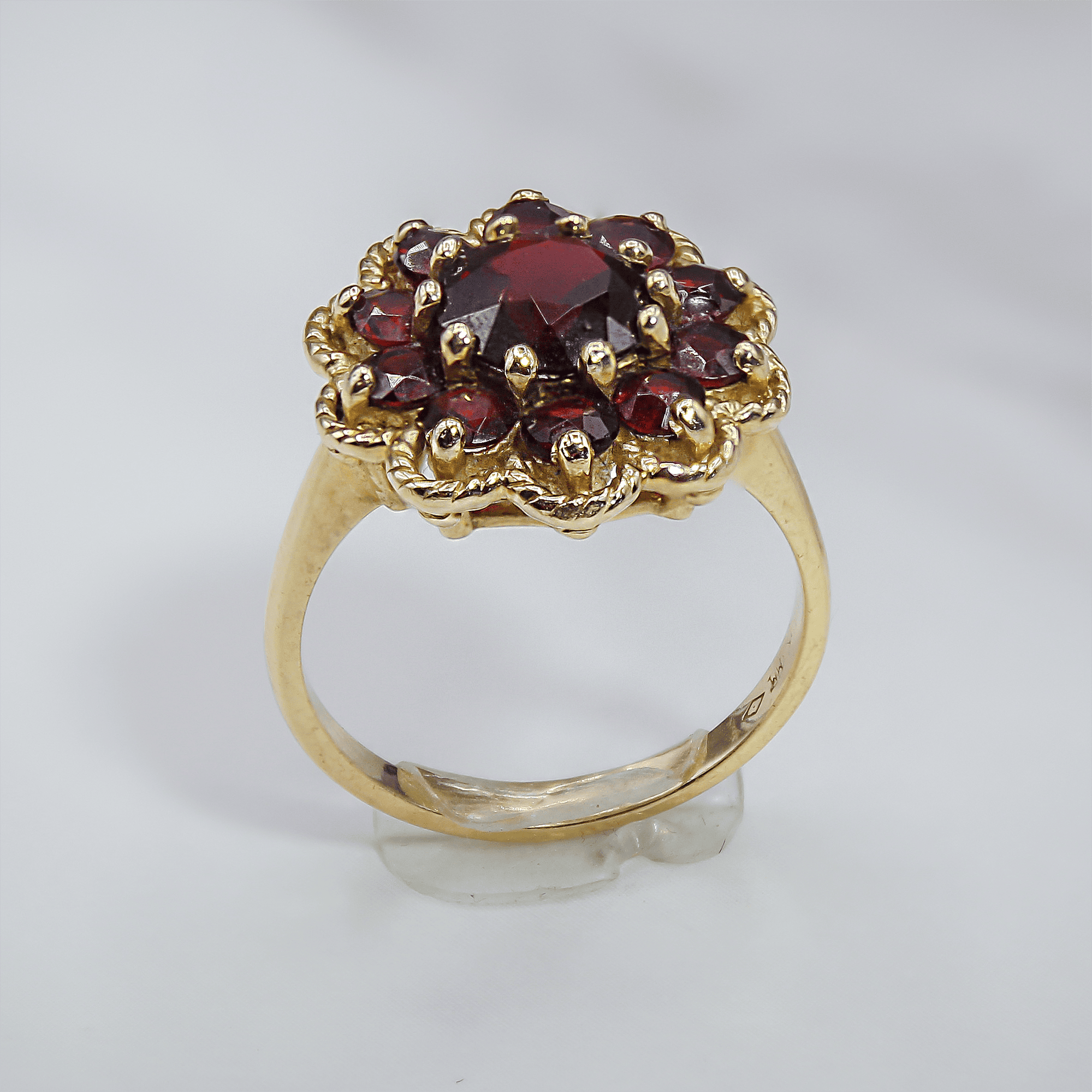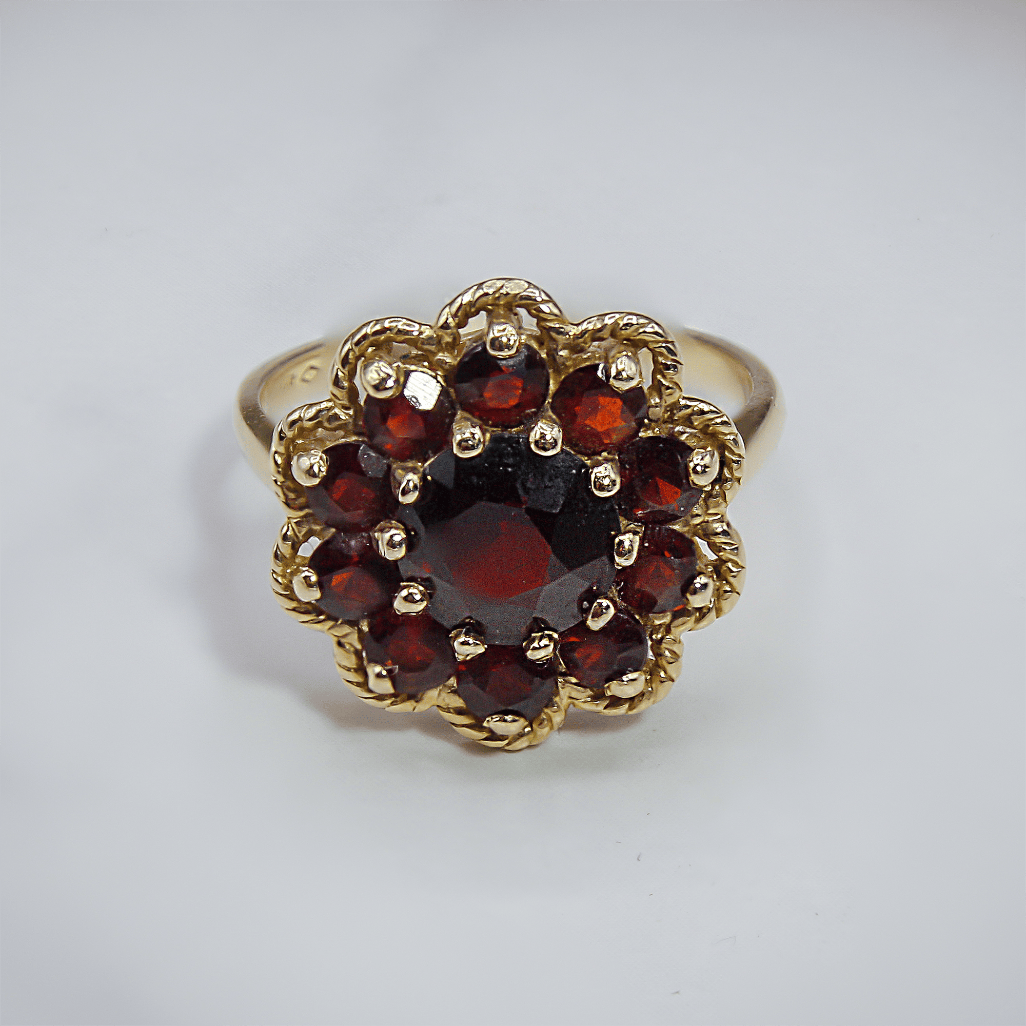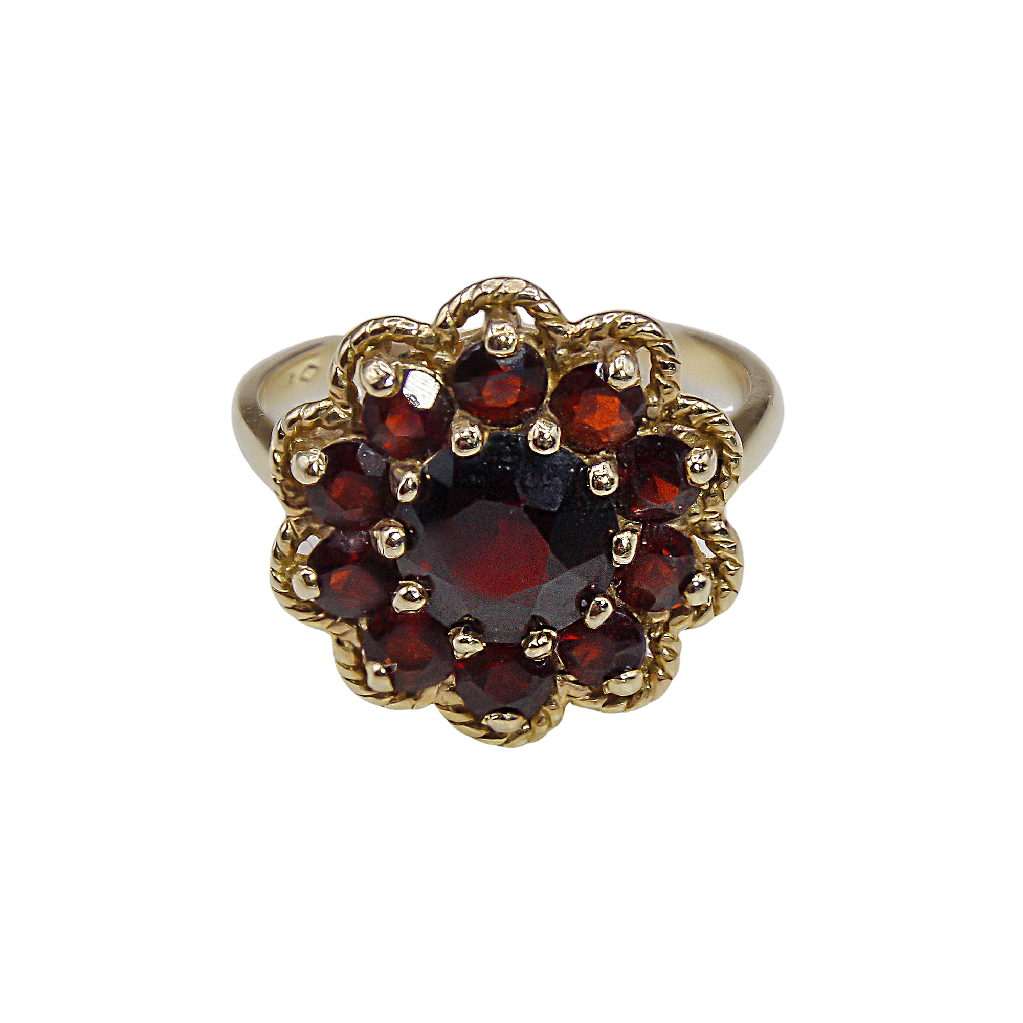 Capture the romance of a bygone era with this captivating Garnet floral cluster ring. The design features a substantial center garnet surrounded by a blooming halo of matching deep crimson stones, creating a rich, velvety glow that catches the light with moody sophistication. Framed by intricate twisted rope detailing in warm yellow gold, this piece embodies a classic “Bohemian” aesthetic, making it a perfect signature piece for daily wear or a dramatic accent for evening attire.