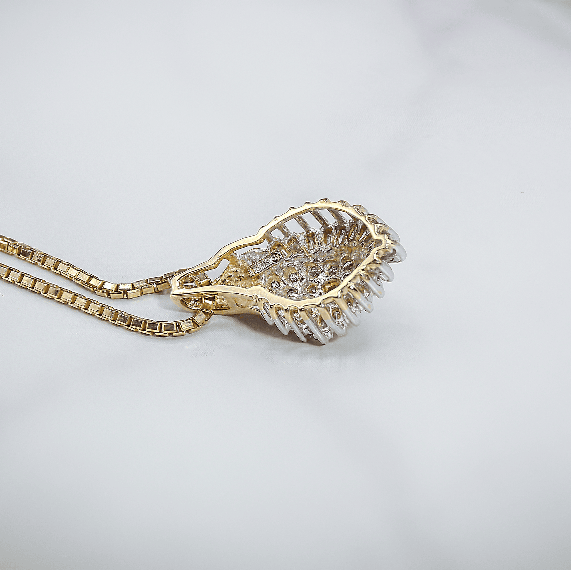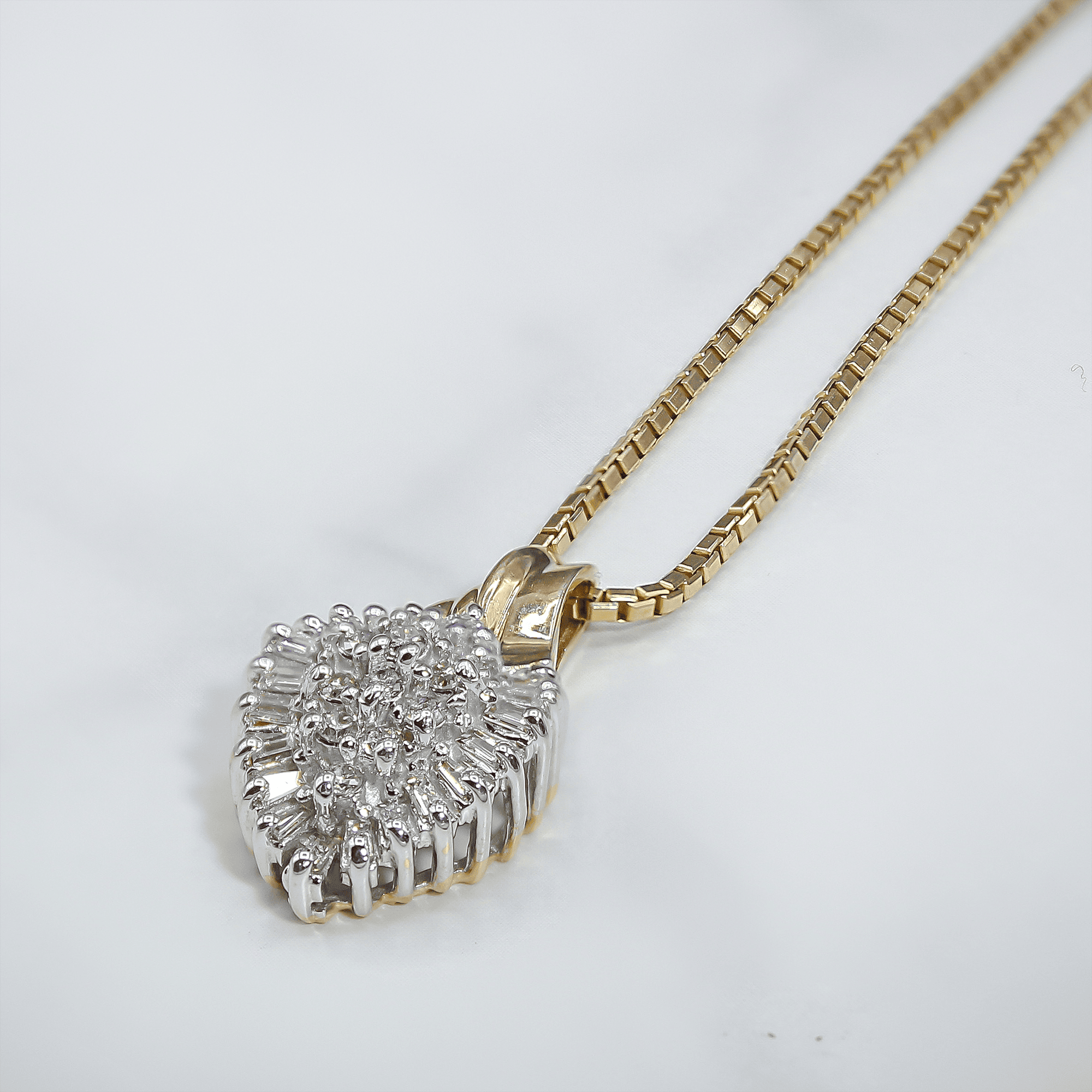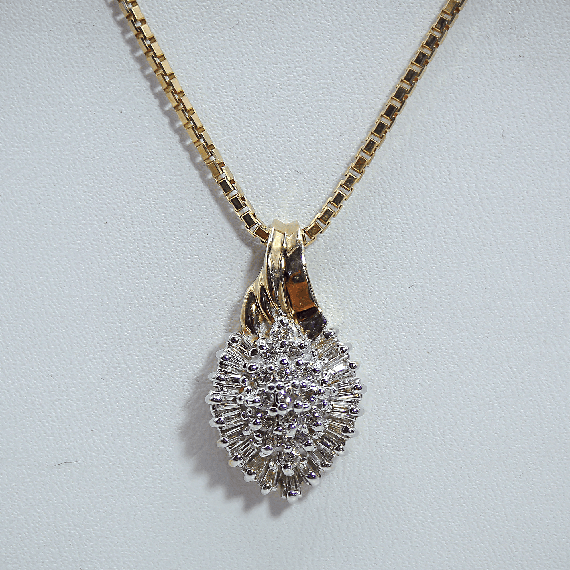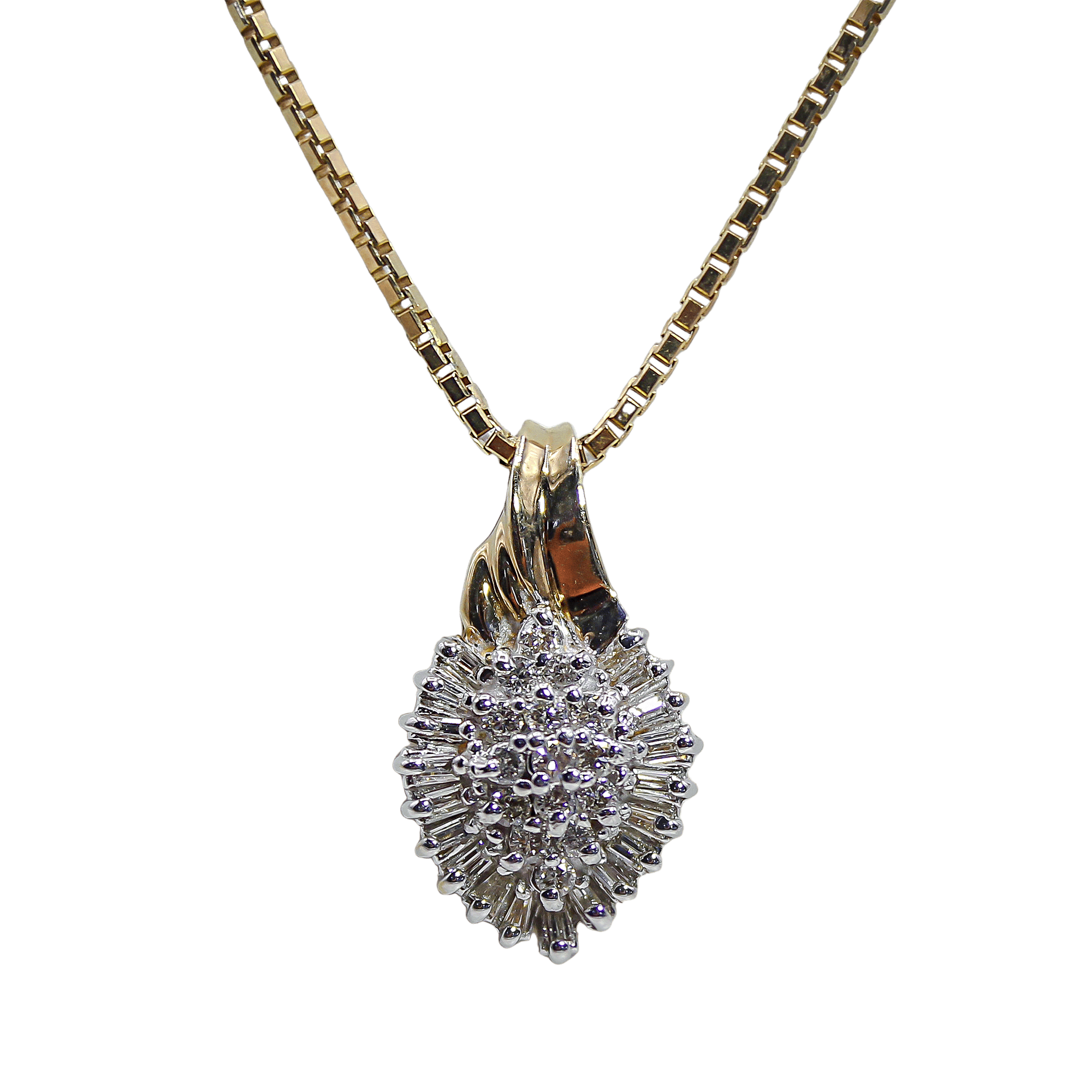 Capture the light from every angle with this exquisite two-tone diamond pendant, a true testament to classic jewelry design. The piece features a central cluster of round brilliant diamonds elevated by a halo of shimmering tapered baguettes in a “ballerina” style arrangement, creating a pear-shaped silhouette that elongates the neckline. Set in cool white gold to maximize the diamonds’ icy brilliance, the pendant is suspended from a warm, swirling 10k yellow gold bail and box chain. This is a versatile, sophisticated accessory perfect for adding a touch of everyday luxury or finishing an evening look.