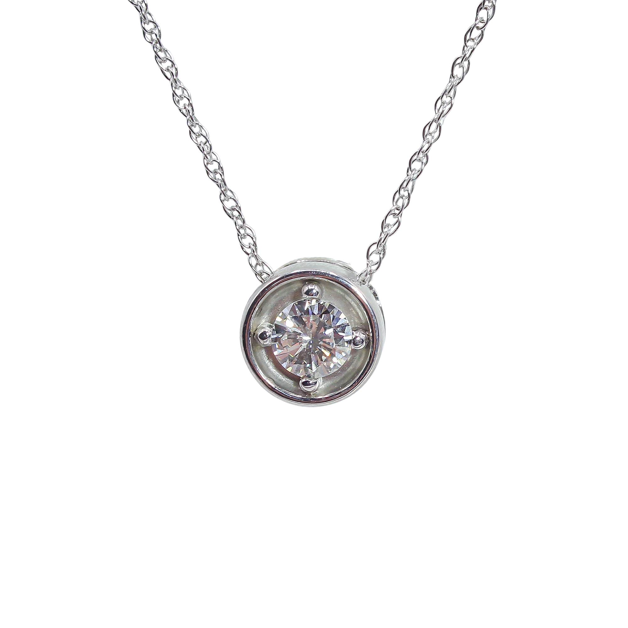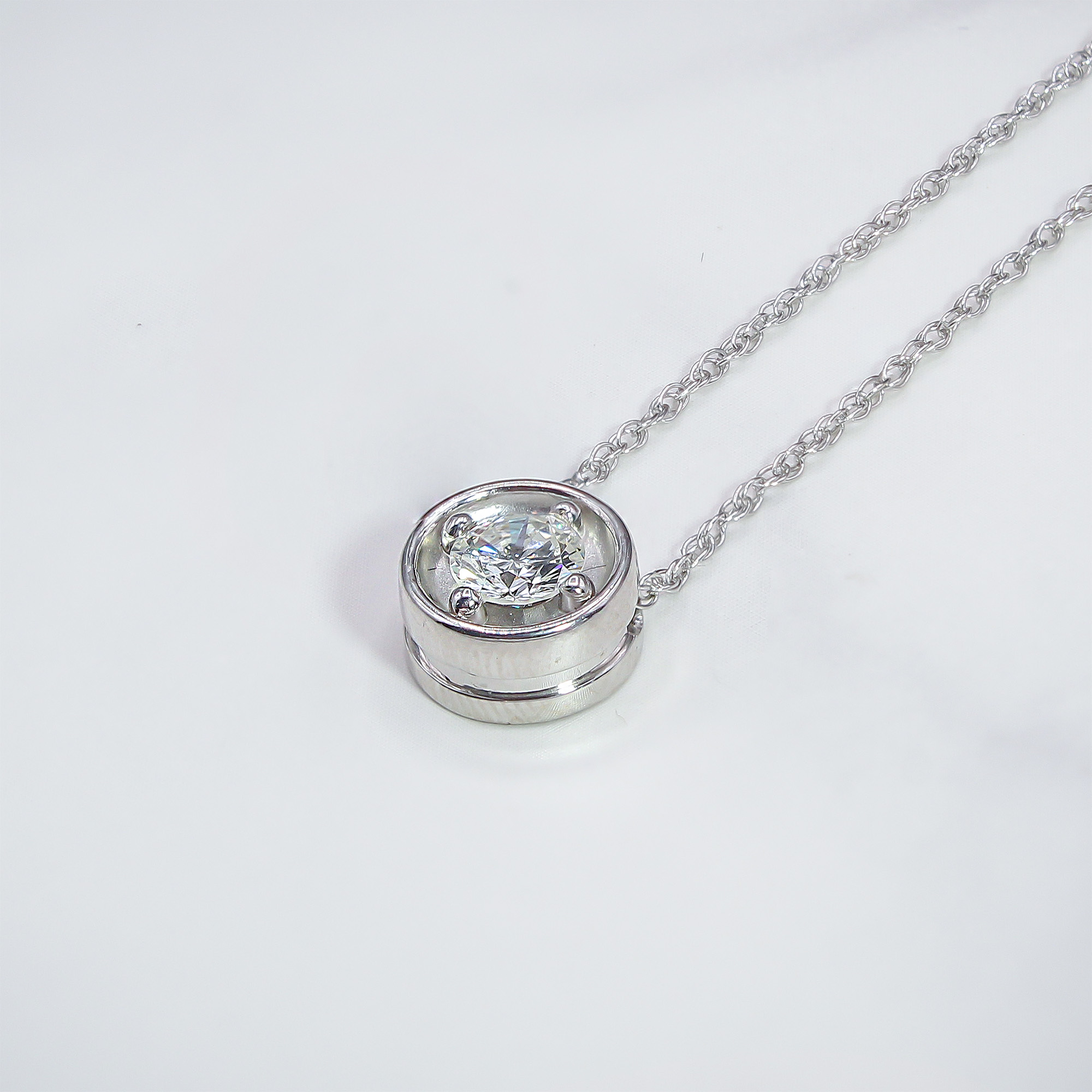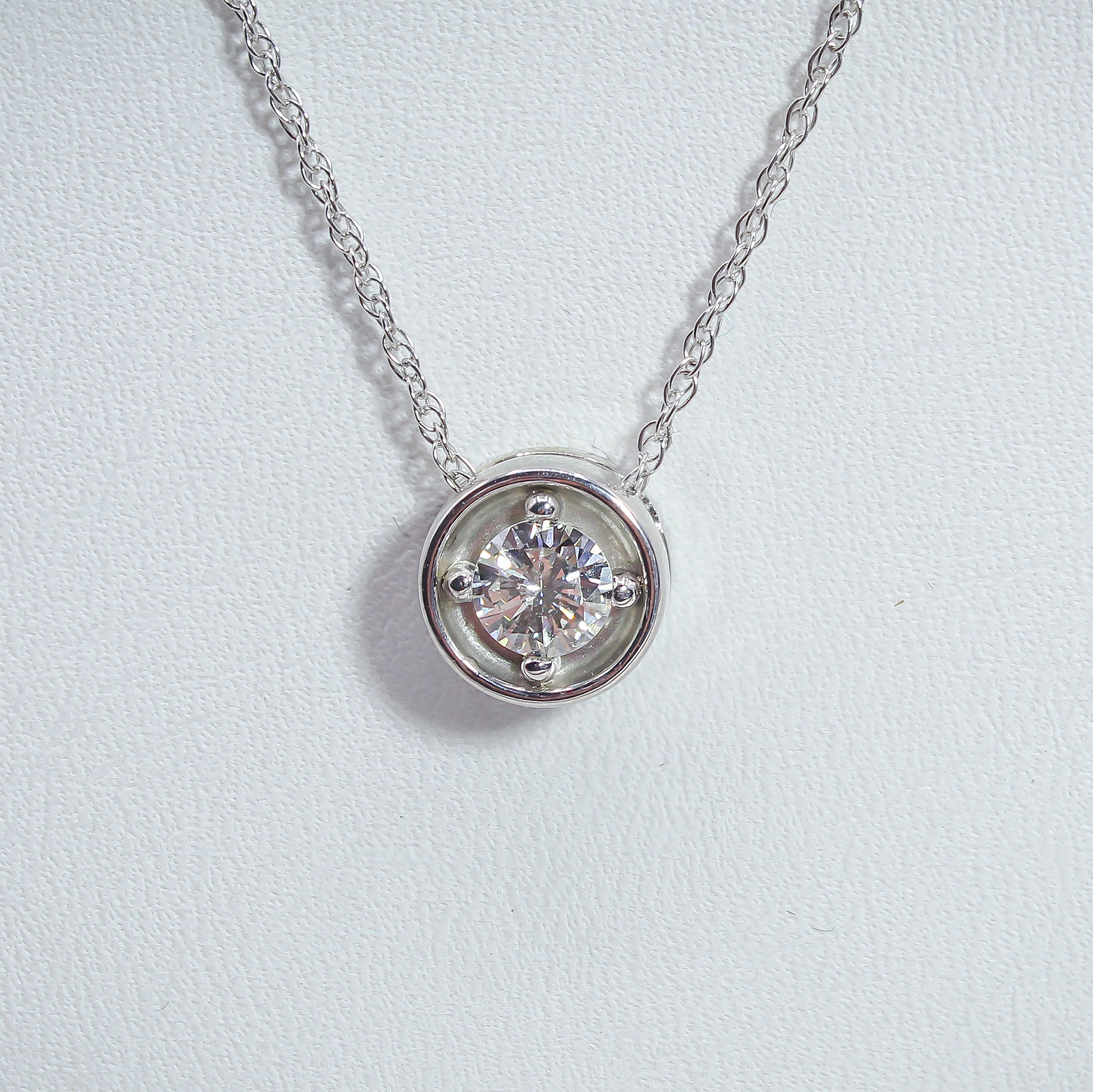 This striking solitaire pendant features a brilliant earth-mined diamond suspended within a sleek, architectural floating bezel. The open-frame design allows light to flood the stone from every angle, maximizing its natural fire and G-H color brilliance. Set in polished 14kt white gold, this piece offers a clean, contemporary aesthetic that transitions seamlessly from a professional daytime look to an elegant evening out.