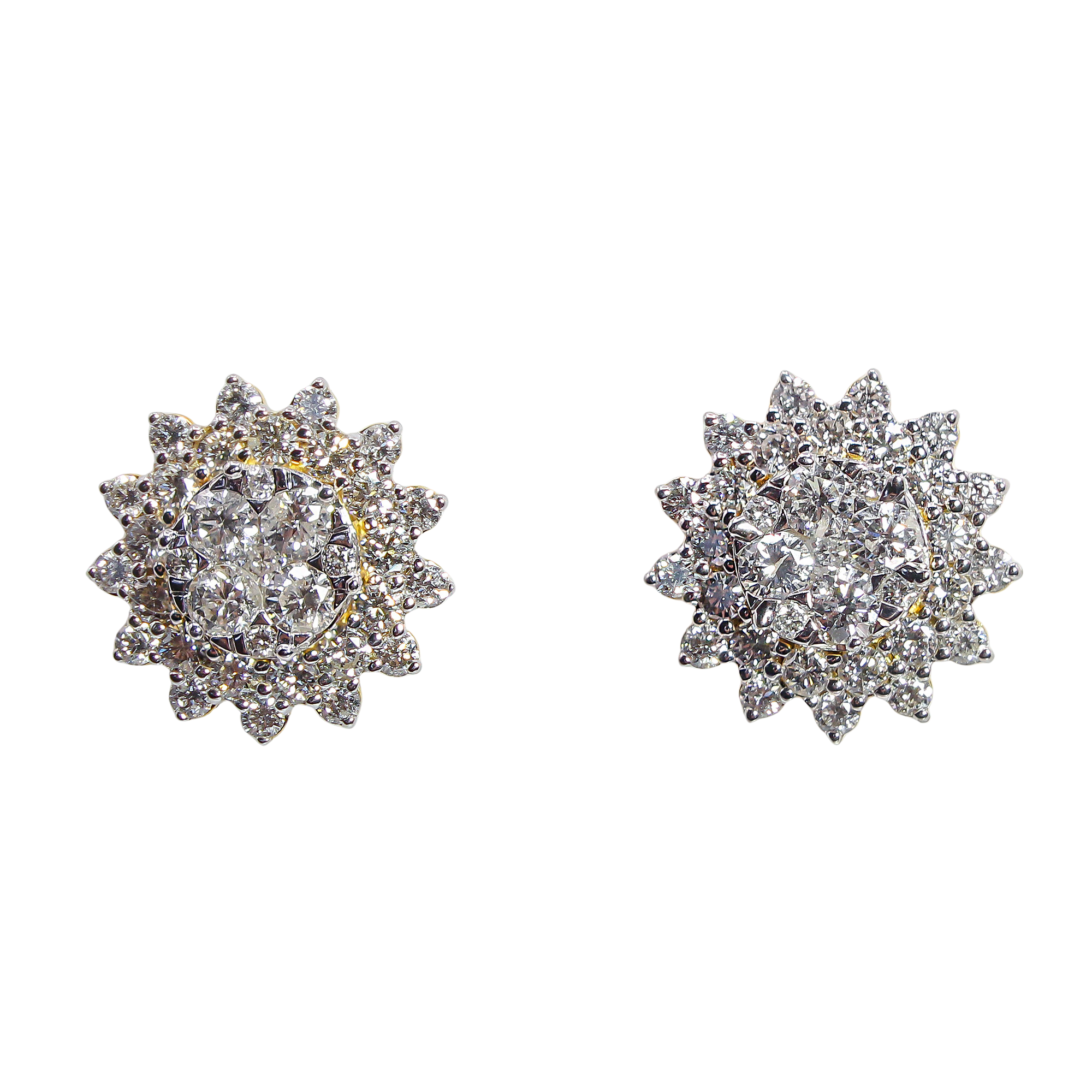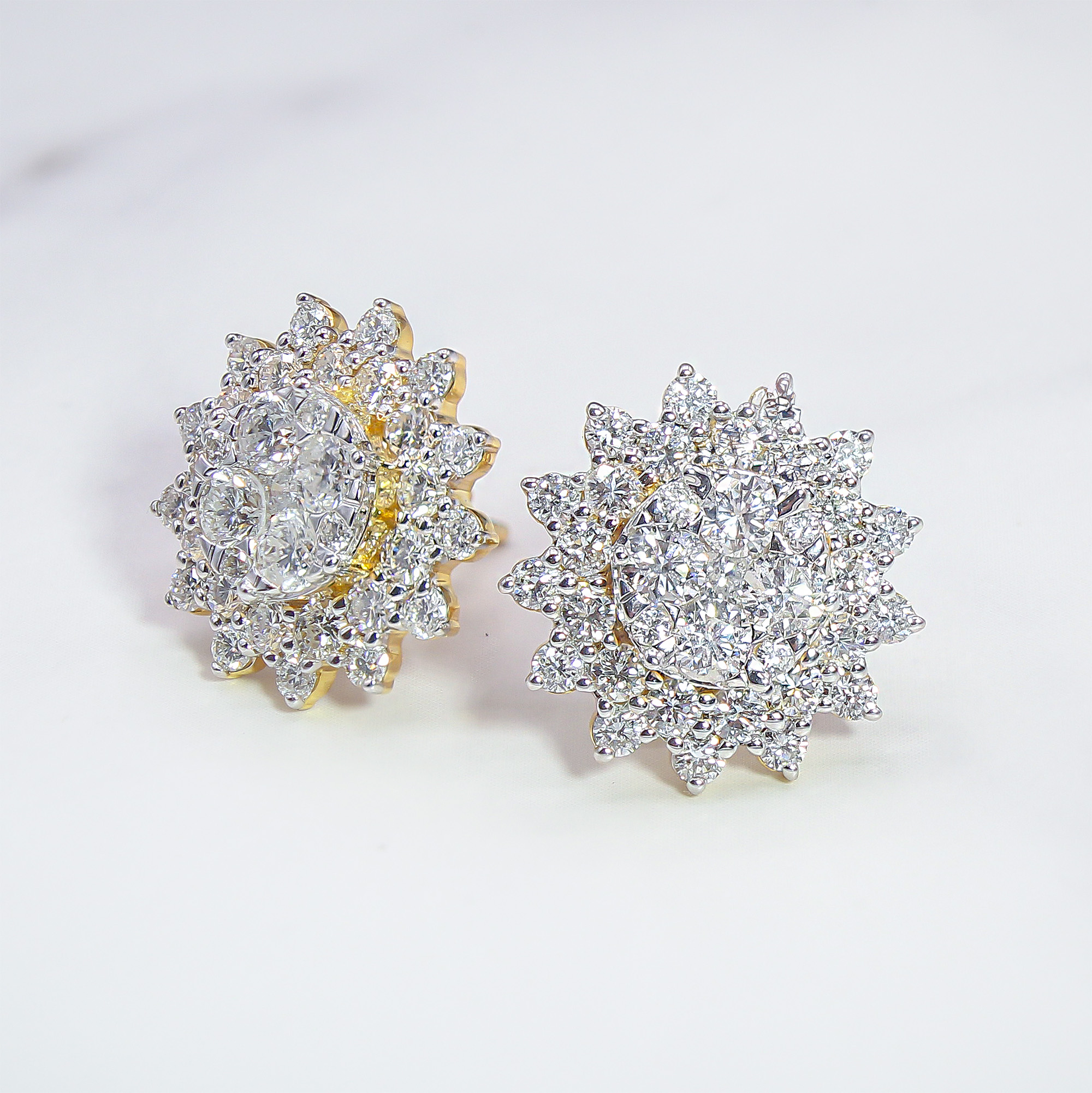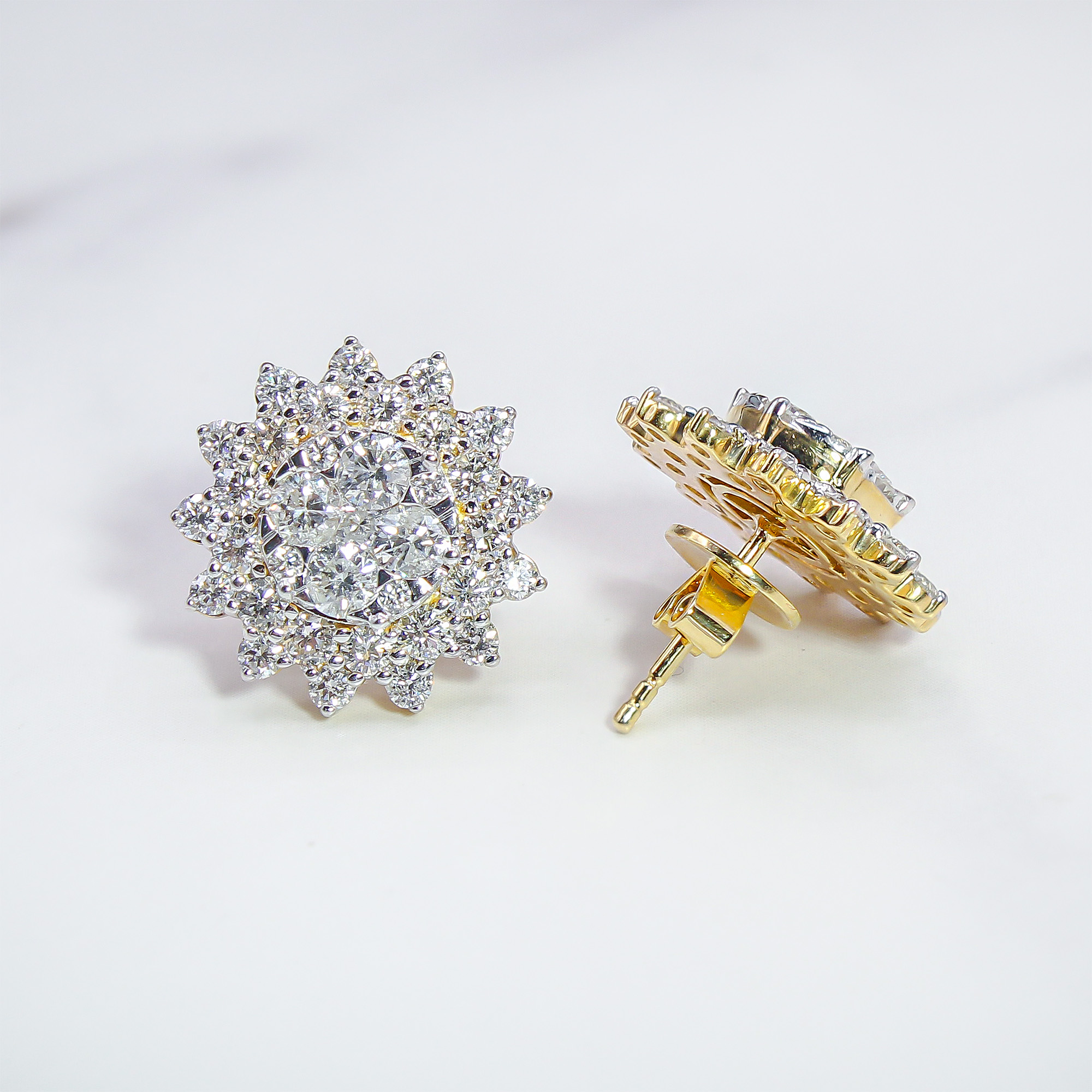These magnificent sunburst clusters capture the light from every angle, radiating a brilliance that mimics the mid-day sun. The clever two-tone design uses a yellow gold foundation to provide a warm, classic weight, while the white gold settings allow the high-quality diamonds to appear seamless and icy. Whether worn to a black-tie gala or to elevate your everyday luxury, these earrings offer a commanding presence and a timeless silhouette that never goes out of style.