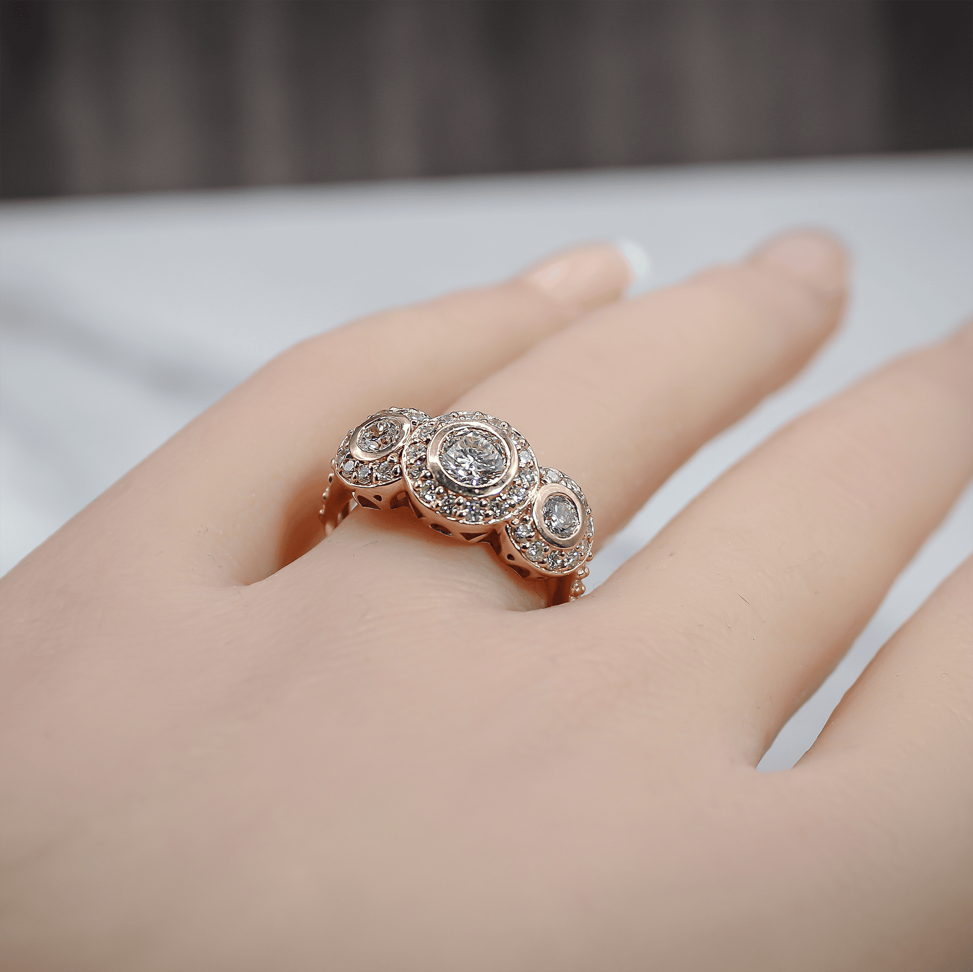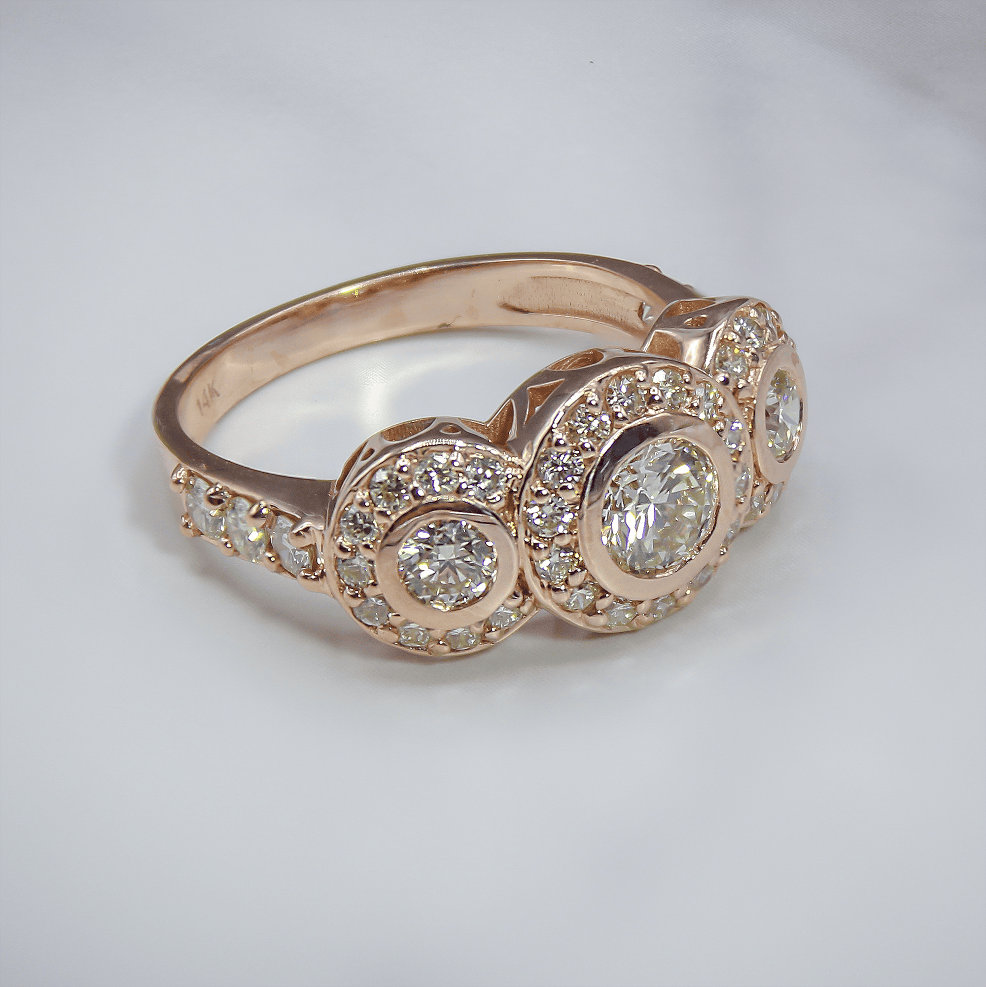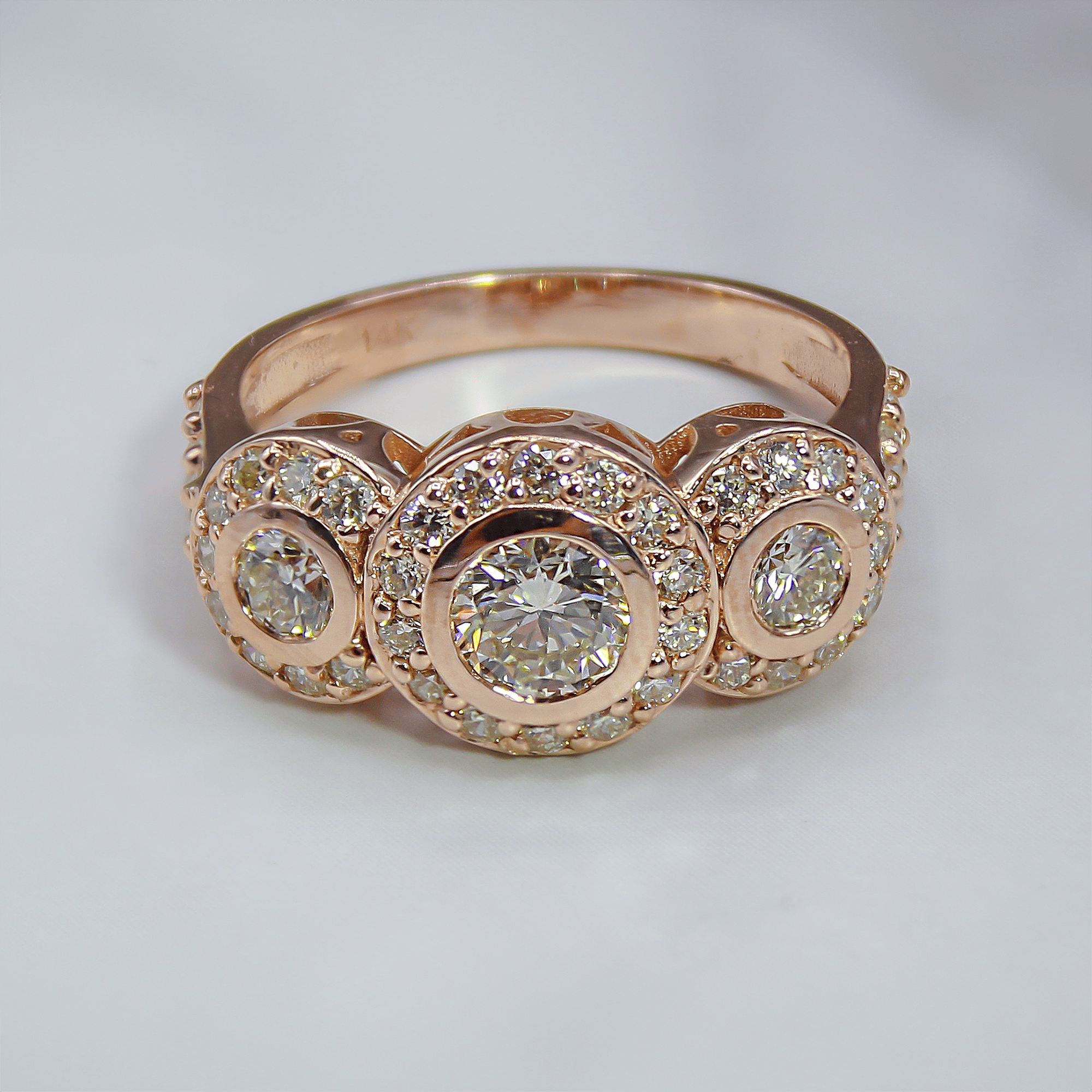 Embrace the romantic symbolism of “Past, Present, and Future” with this substantial three-stone diamond ring. Crafted in rich 14k rose gold, the setting features three central diamonds securely nestled in smooth bezel-style halos, accented by shimmering diamond shoulders. The central stones possess an L-M color rating, offering a soft, candlelit warmth that blends seamlessly with the pink hues of the gold for a sophisticated, monochromatic aesthetic. With its impressive VS clarity, this ring delivers brilliant light performance and a smooth, snag-free profile perfect for daily luxury.