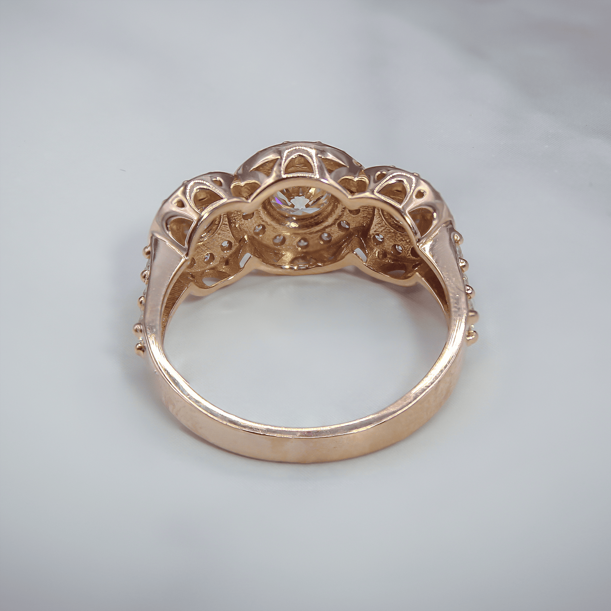 Diamond Three-Stone Halo Anniversary Ring in Rose Gold