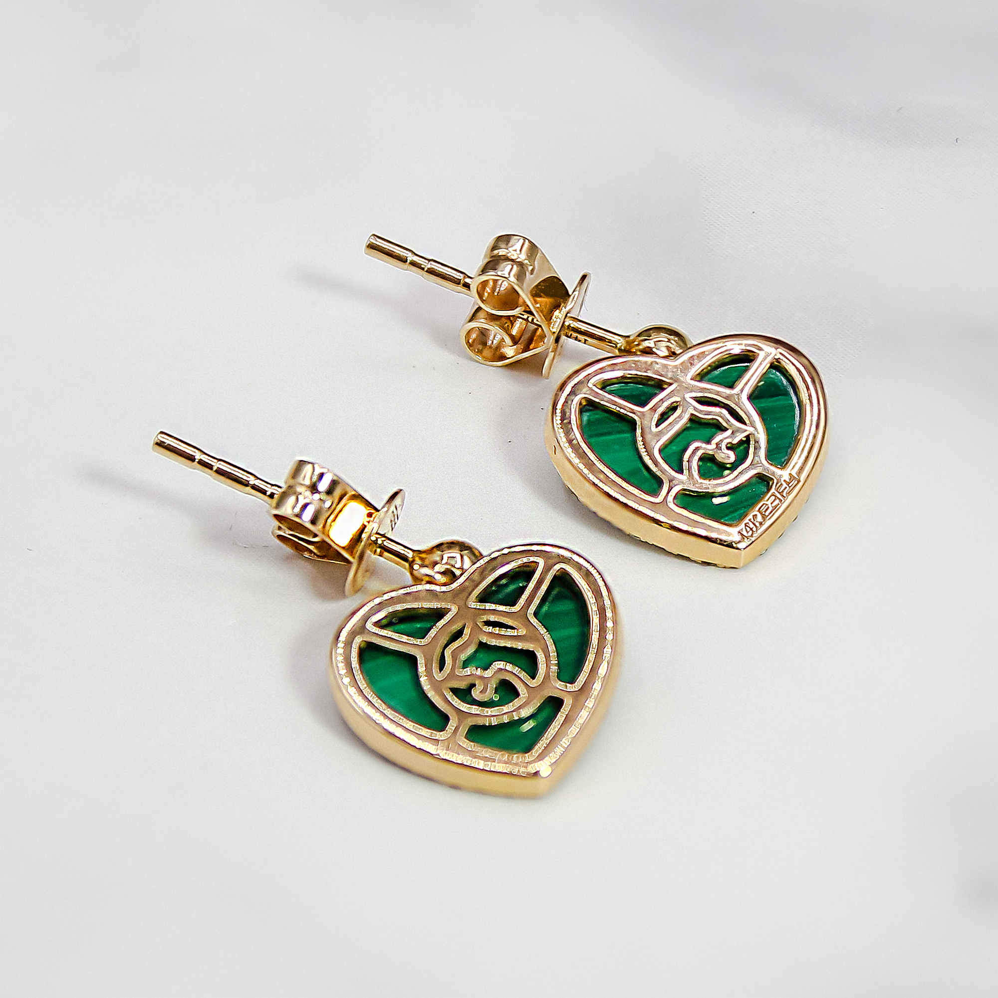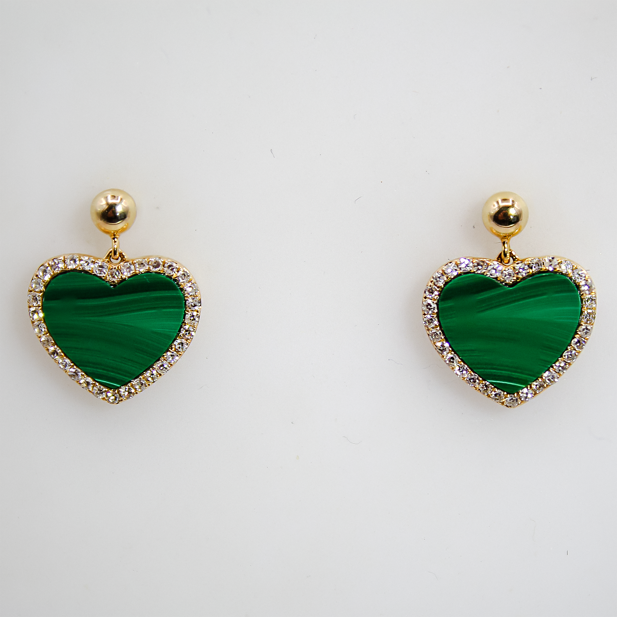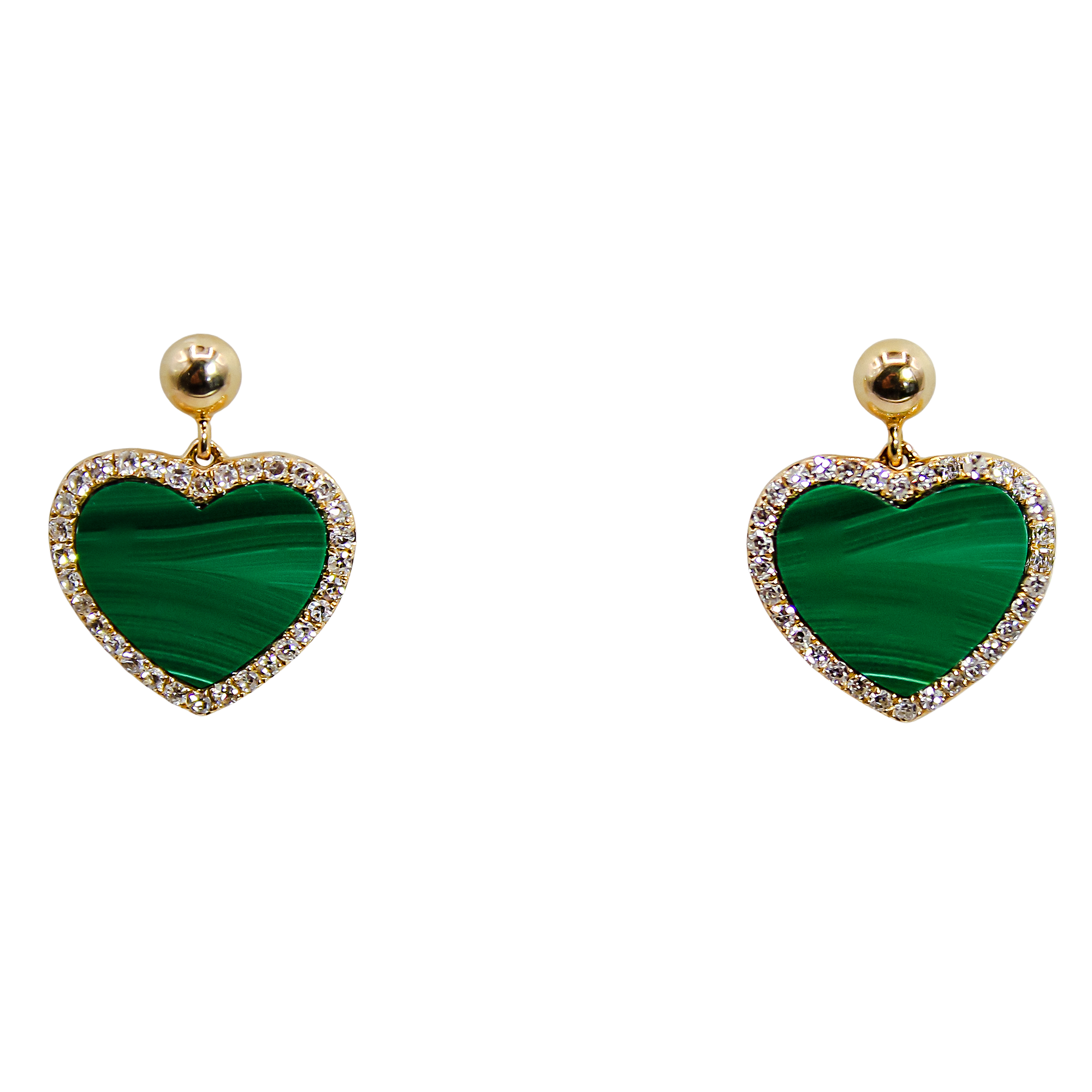 These enchanting drop earrings feature a captivating heart shape, meticulously crafted in rich 14 karat yellow gold. Each earring showcases a central, polished Malachite stone, renowned for its vibrant, deep green color and characteristic natural banding, symbolizing transformation and positive change. The lush malachite heart is beautifully framed by a brilliant halo of natural, fine-cut diamonds, providing a striking contrast and magnificent sparkle. The earrings are secured with a classic gold ball stud and butterfly backs, offering a perfect blend of secure wear and graceful movement. Signed by EFFY, a mark of quality and contemporary design. A true statement piece that brings a bold splash of color and luxury to any collection