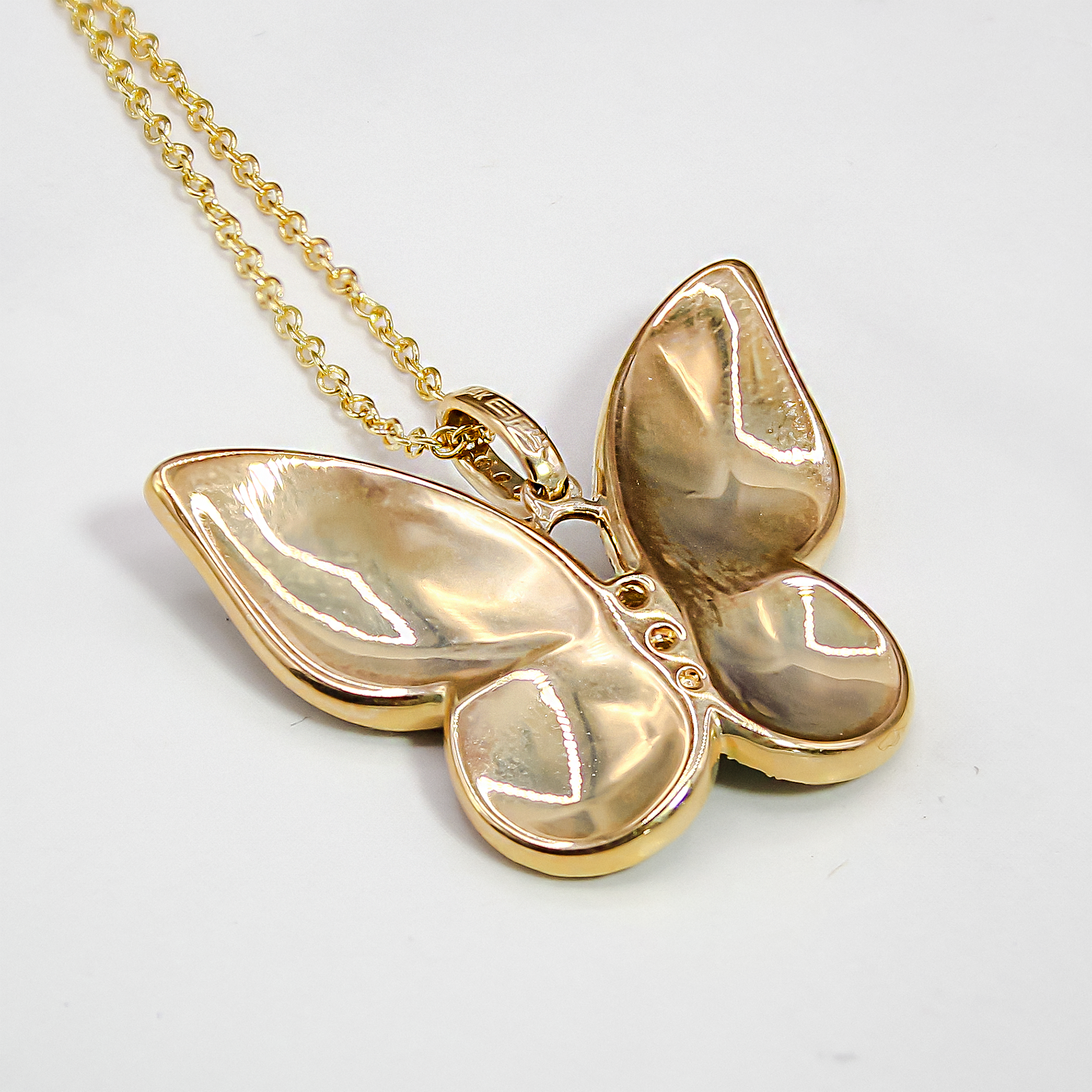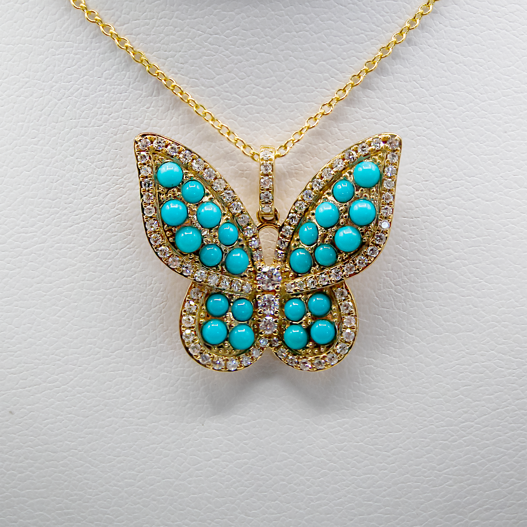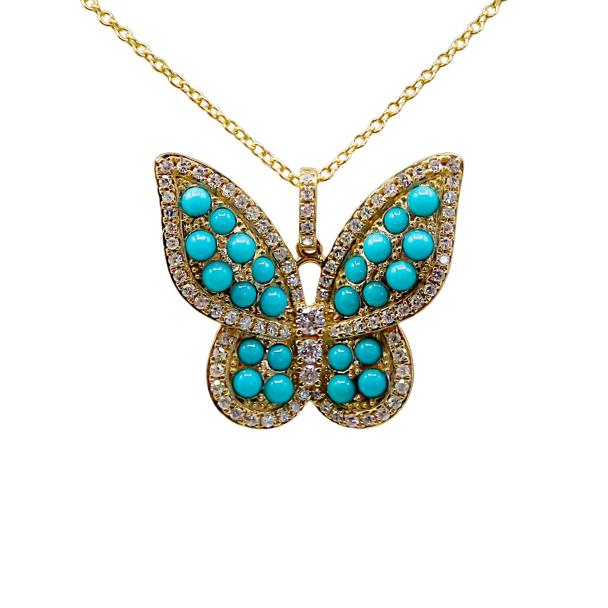 Capture the spirit of transformation with this stunning EFFY butterfly pendant. Crafted from luminous 14kt yellow gold, the iconic winged silhouette is richly paved with brilliant-cut diamonds that outline the wings, creating a dazzling sparkle. The body and inner wings are adorned with smooth, vibrant blue cabochon Turquoise stones, offering a captivating contrast to the gold and diamonds. Suspended from a delicate gold chain, this piece is a joyful statement of natural beauty and sophisticated design.