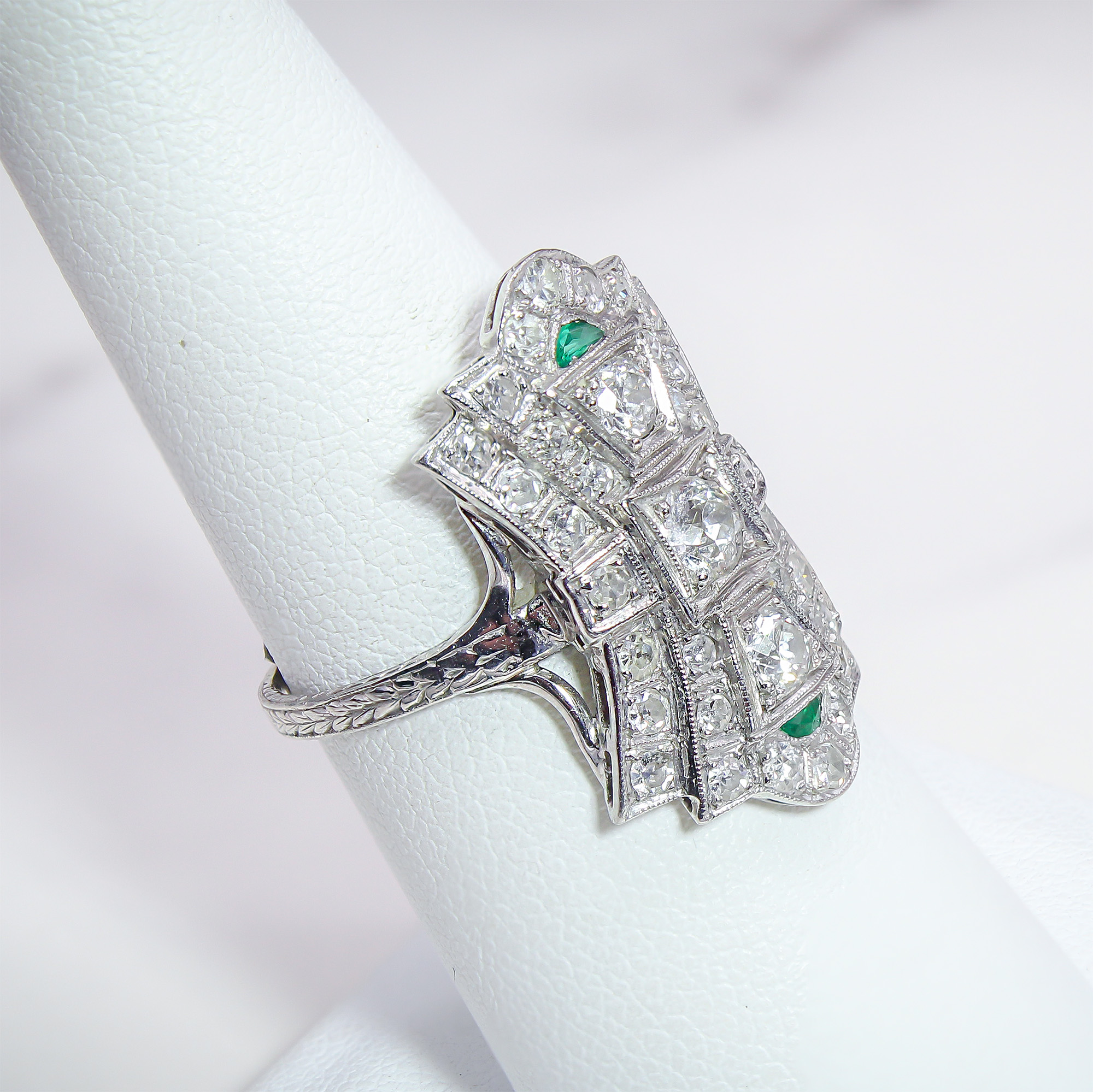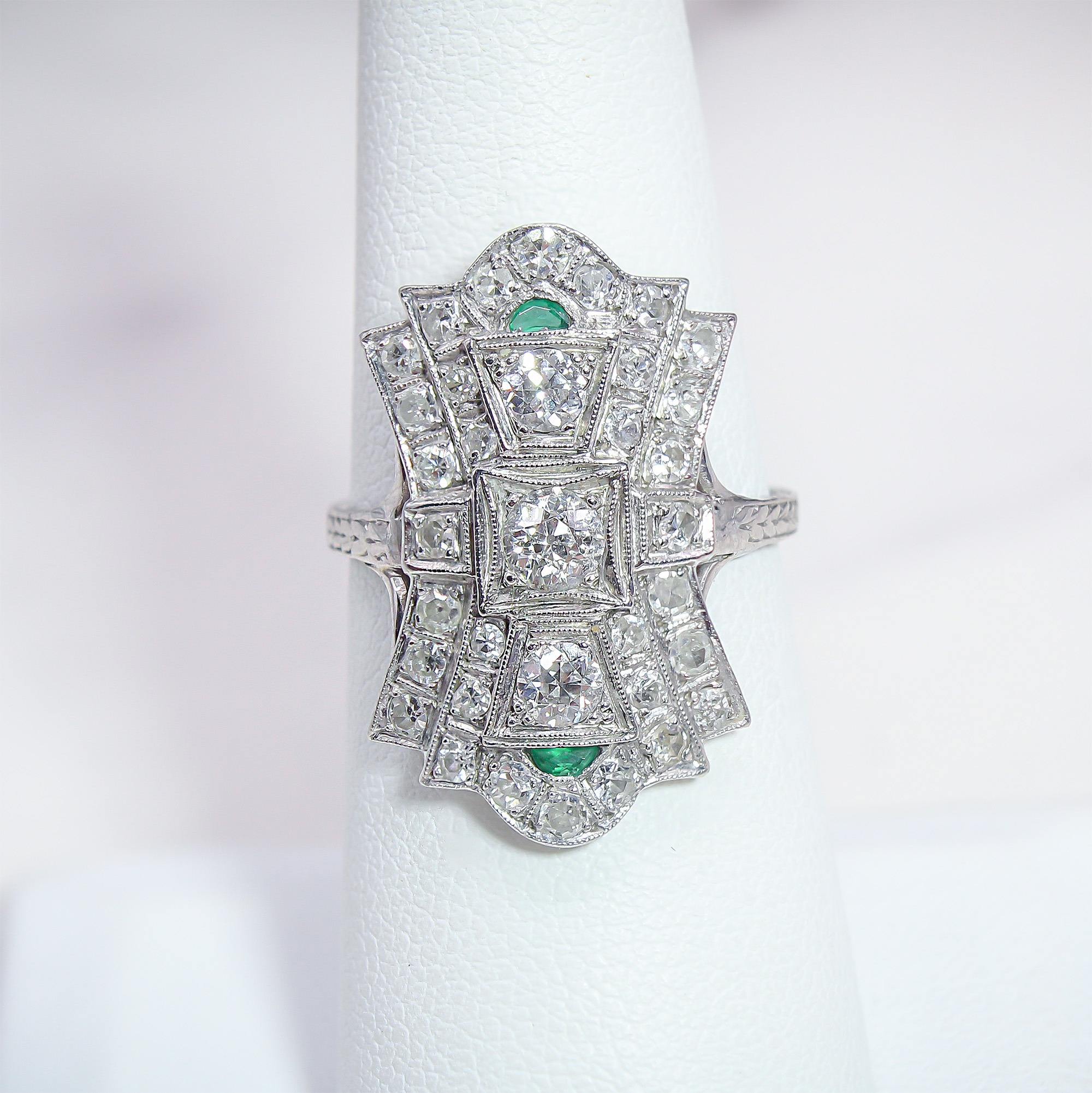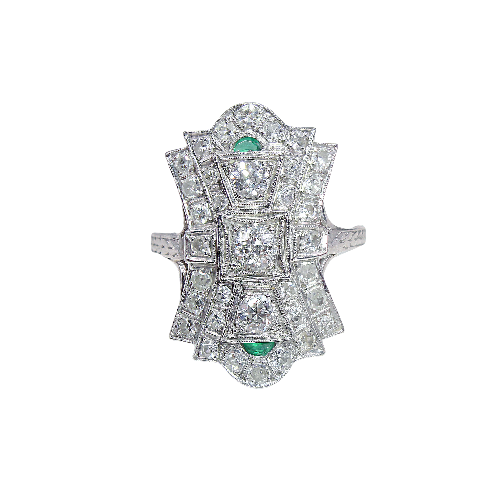 This exquisite Art Deco dinner ring captures the architectural grandeur of the 1920s, featuring a cascading geometric silhouette that elongates the finger with grace. Brilliant earth-mined diamonds create a continuous field of light, punctuated by two vivid green emeralds that offer a sophisticated pop of color. As an authentic vintage piece, it carries a unique character and a whisper of past celebrations, making it an extraordinary choice for a milestone anniversary or a signature evening accessory.
