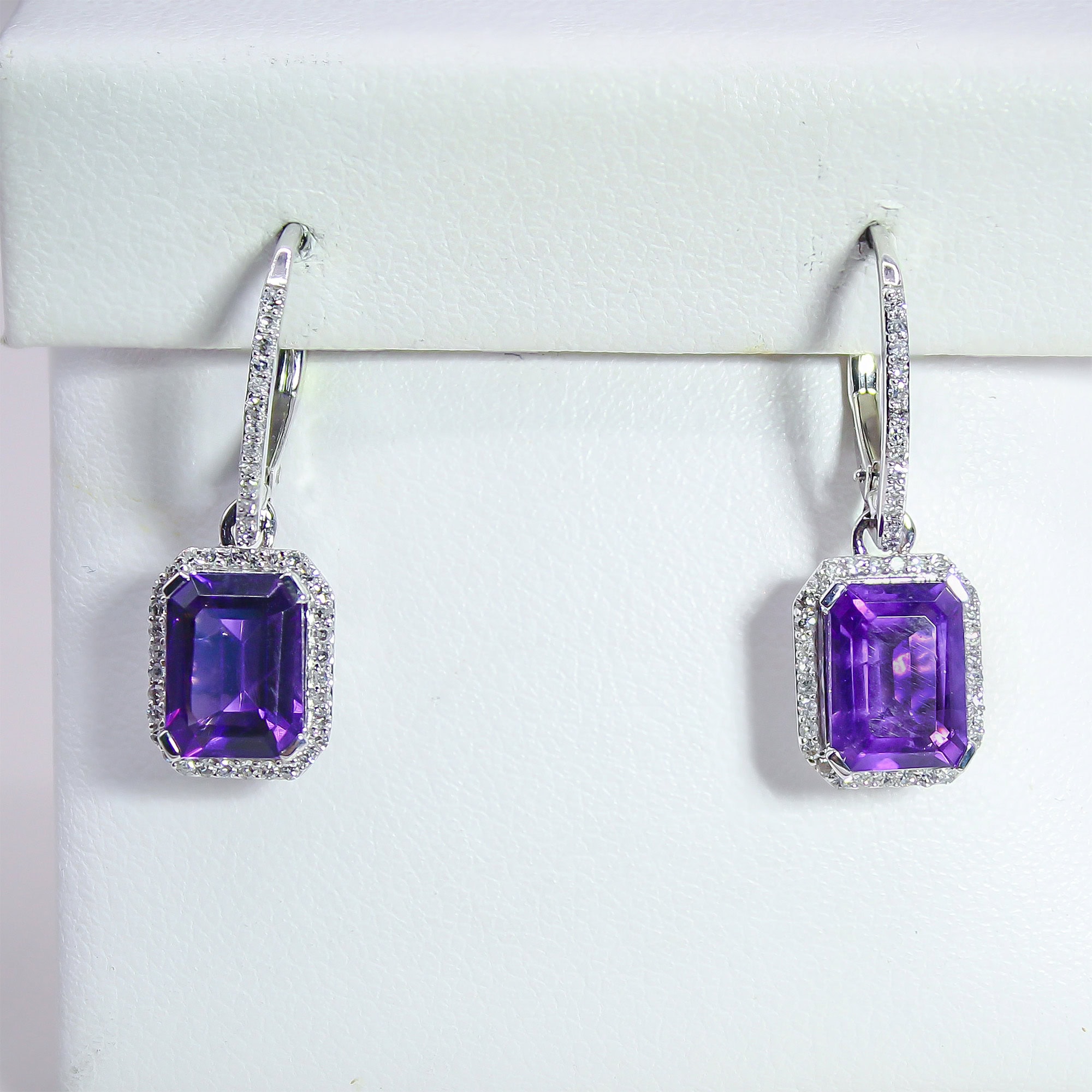 Exude regal elegance with these breathtaking drop earrings, featuring deep, velvety emerald-cut amethysts that command attention. Framed by a sparkling halo of bright white diamonds that extends up the lever-back setting, these gems catch the light with every subtle turn of the head. Whether worn for a February birthday celebration or a sophisticated evening gala, they offer a luxurious pop of color that feels both modern and timeless.