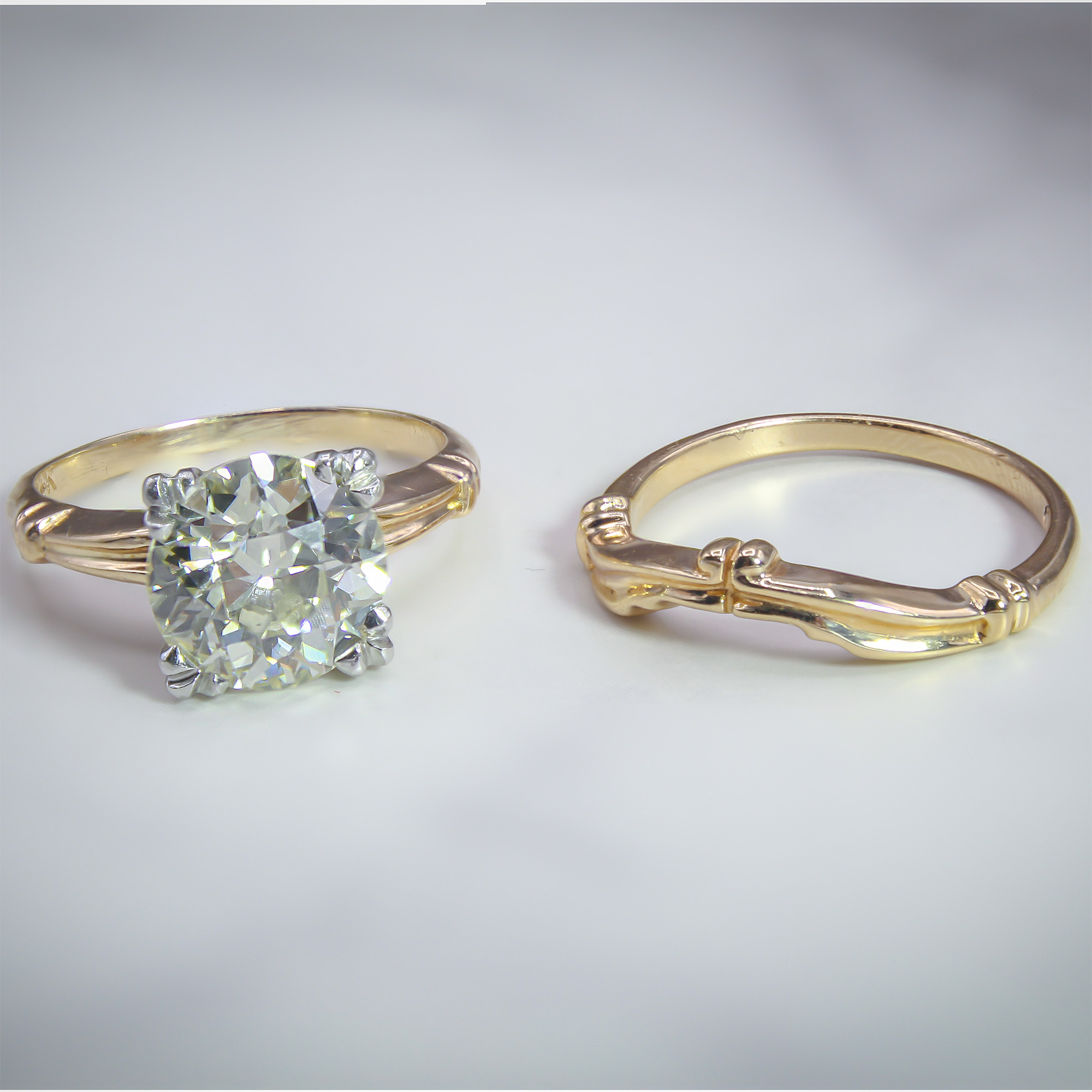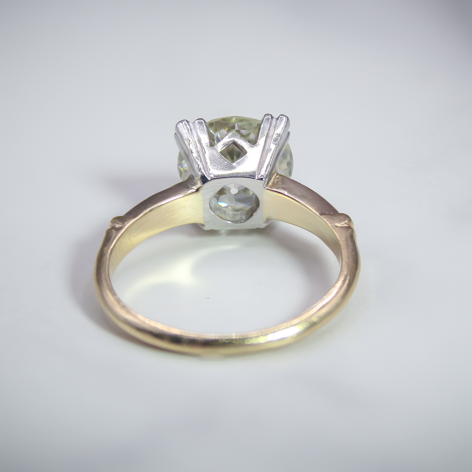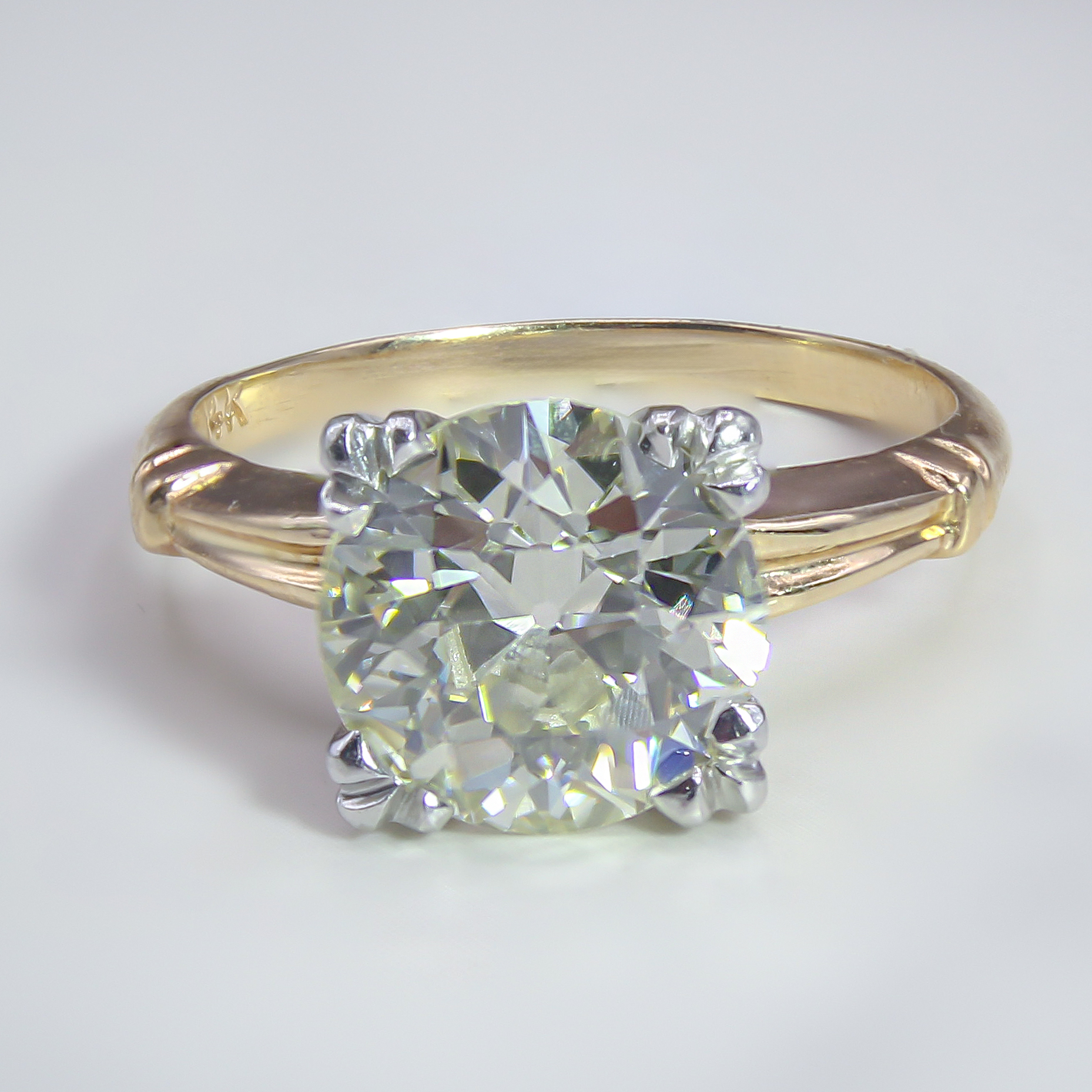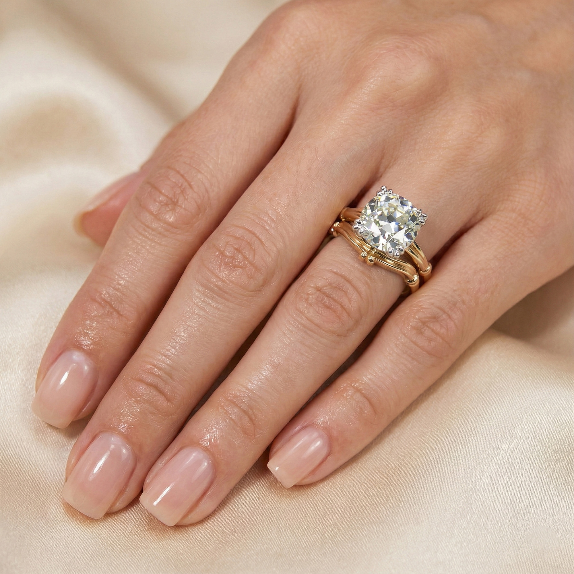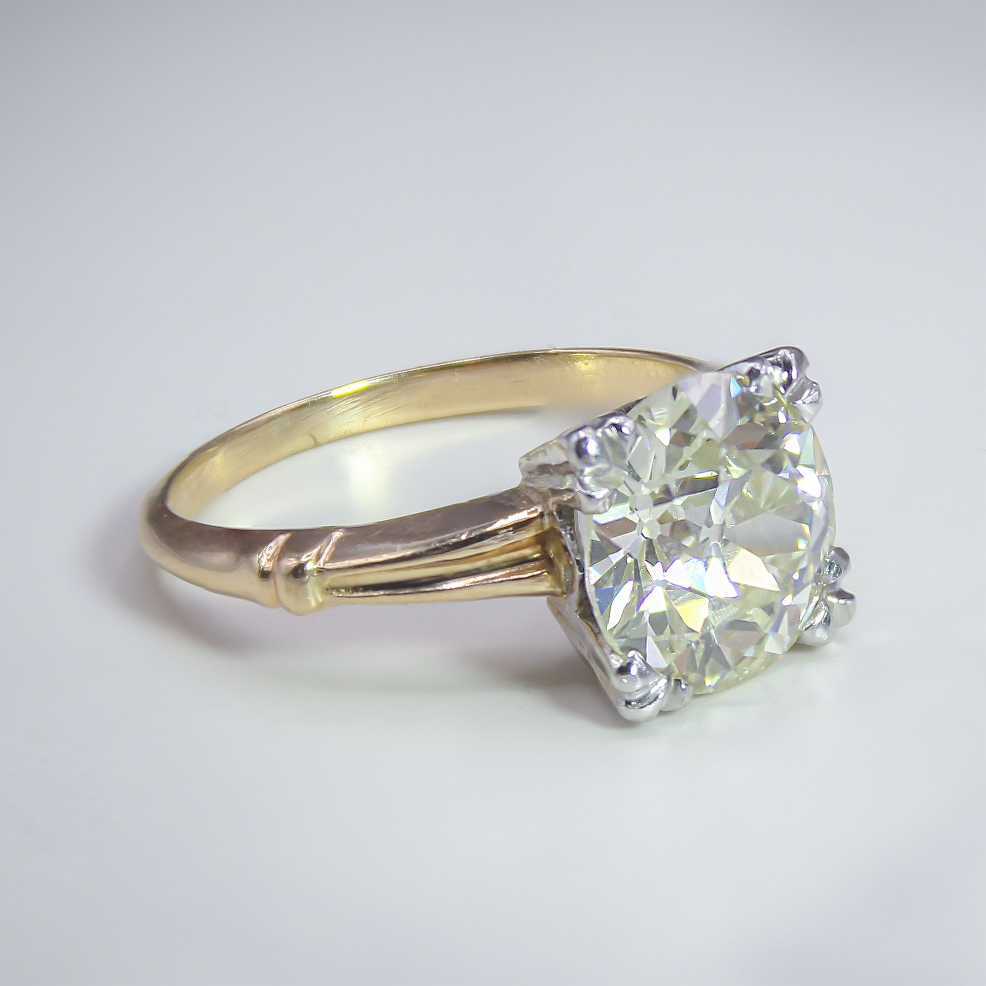 This breathtaking solitaire showcases a massive 2.75-carat European Brilliant cut diamond, a rare antique style prized for its ability to capture light even in dim settings. The diamond’s unique “Q-R” color grade offers a warm, romantic faint yellow hue that pairs flawlessly with the lustrous yellow gold setting, creating a cohesive and sophisticated aesthetic. Boasting an exceptional VVS-2 clarity, the stone is virtually flawless to the naked eye, allowing the distinct, wide facets of the European cut to display their mesmerizing kaleidoscope of fire and brilliance.