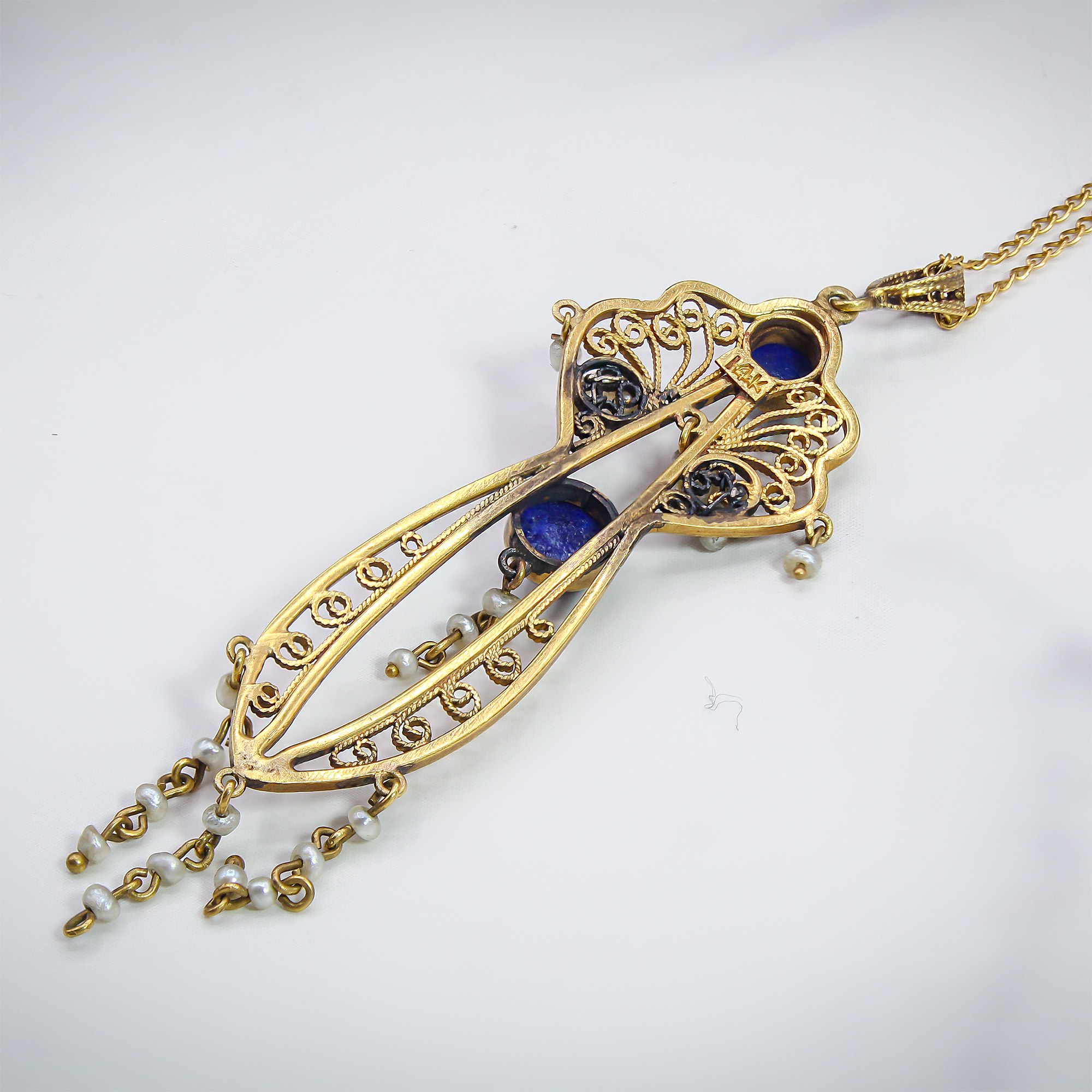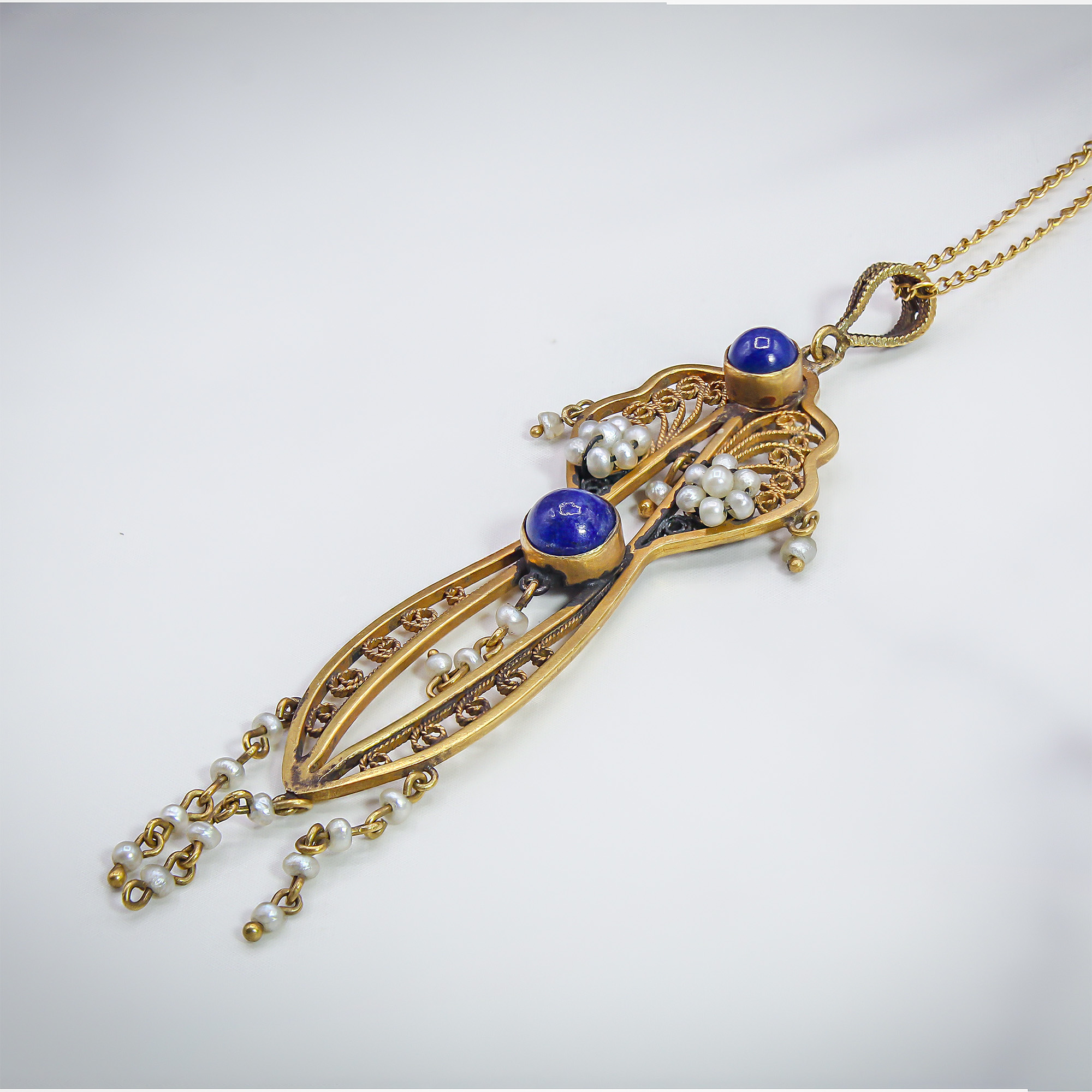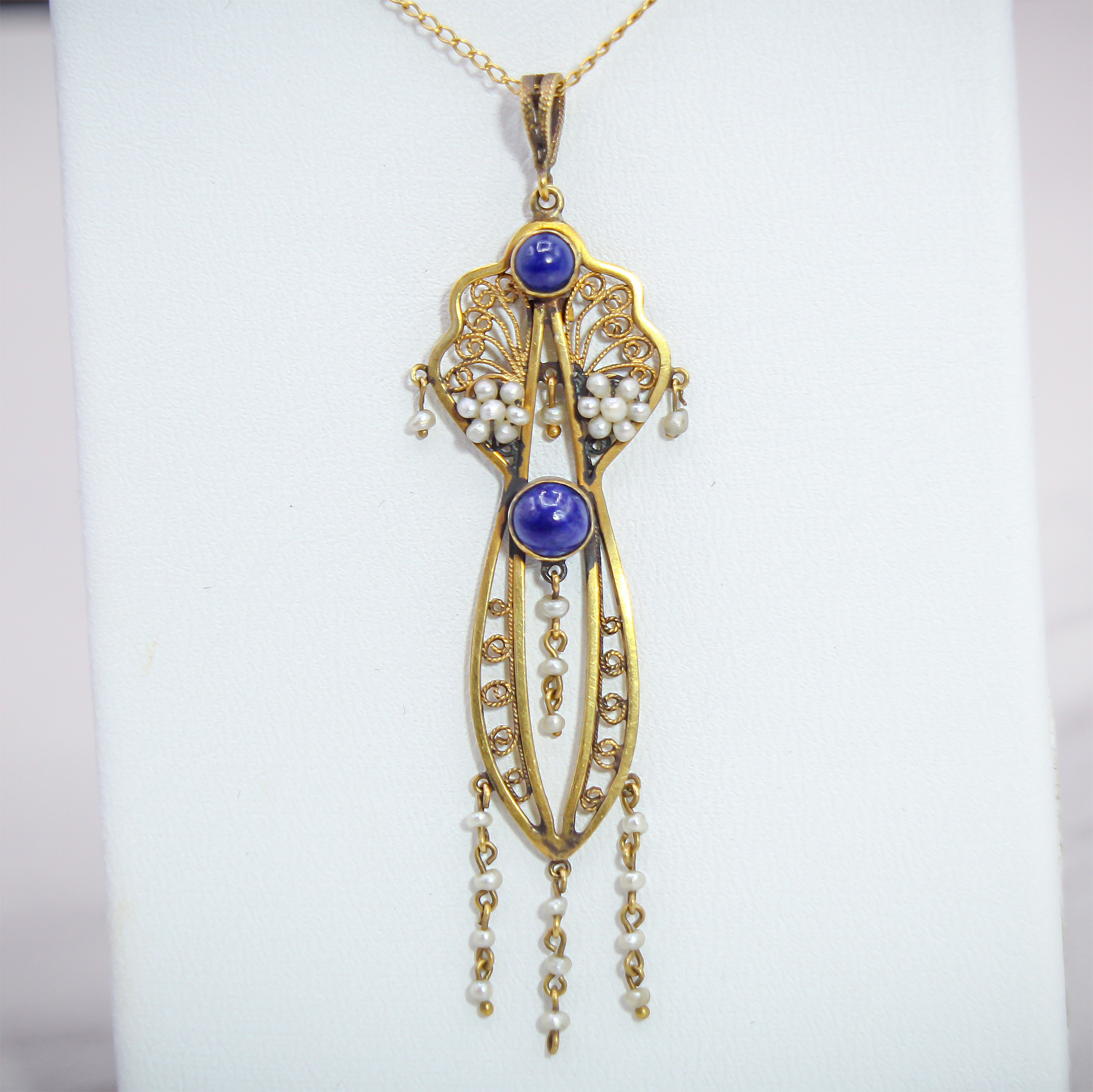 This ethereal Art Nouveau lavaliere pendant is a masterclass in the organic, flowing lines of the early 20th century. Two vibrant, cobalt-blue lapis lazuli cabochons are anchored within an intricate gold frame, accented by clusters of luminous seed pearls that evoke a soft, romantic glow. Delicate pearl-set tassels dance at the base, creating a sense of movement and grace that makes this antique piece an unforgettable addition to any sophisticated jewelry collection.