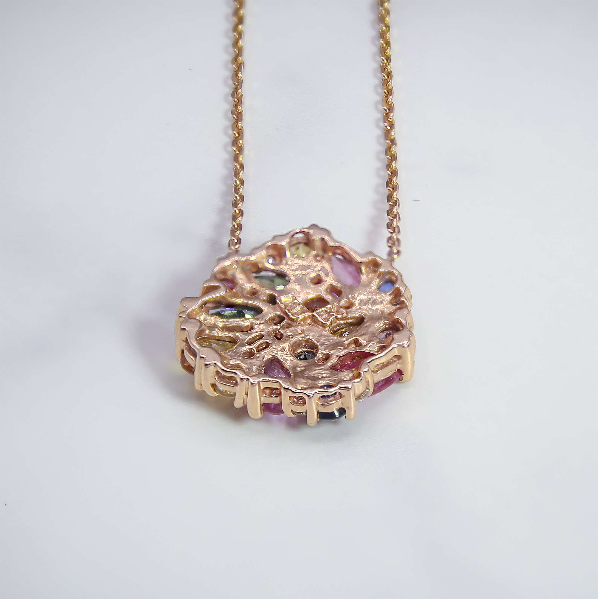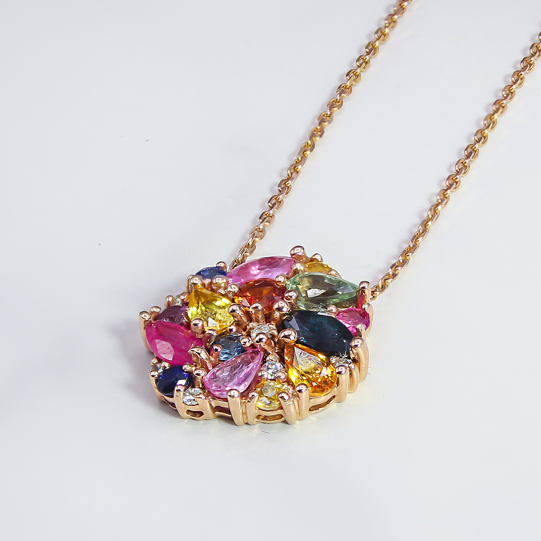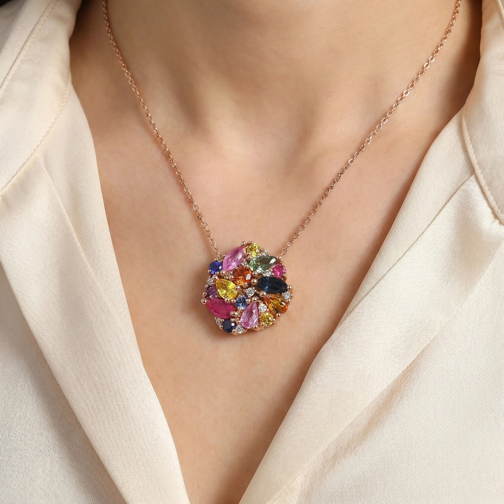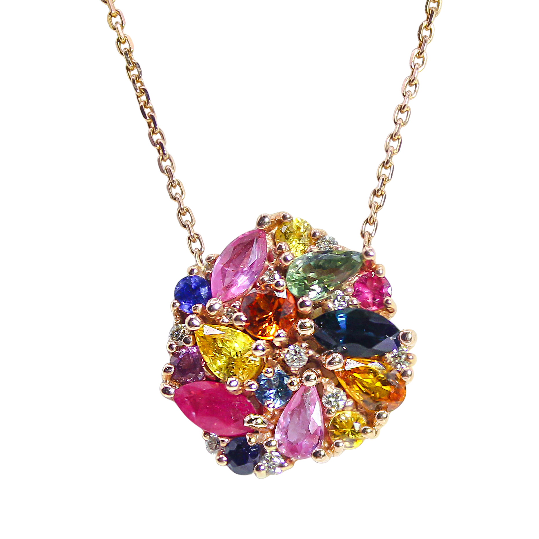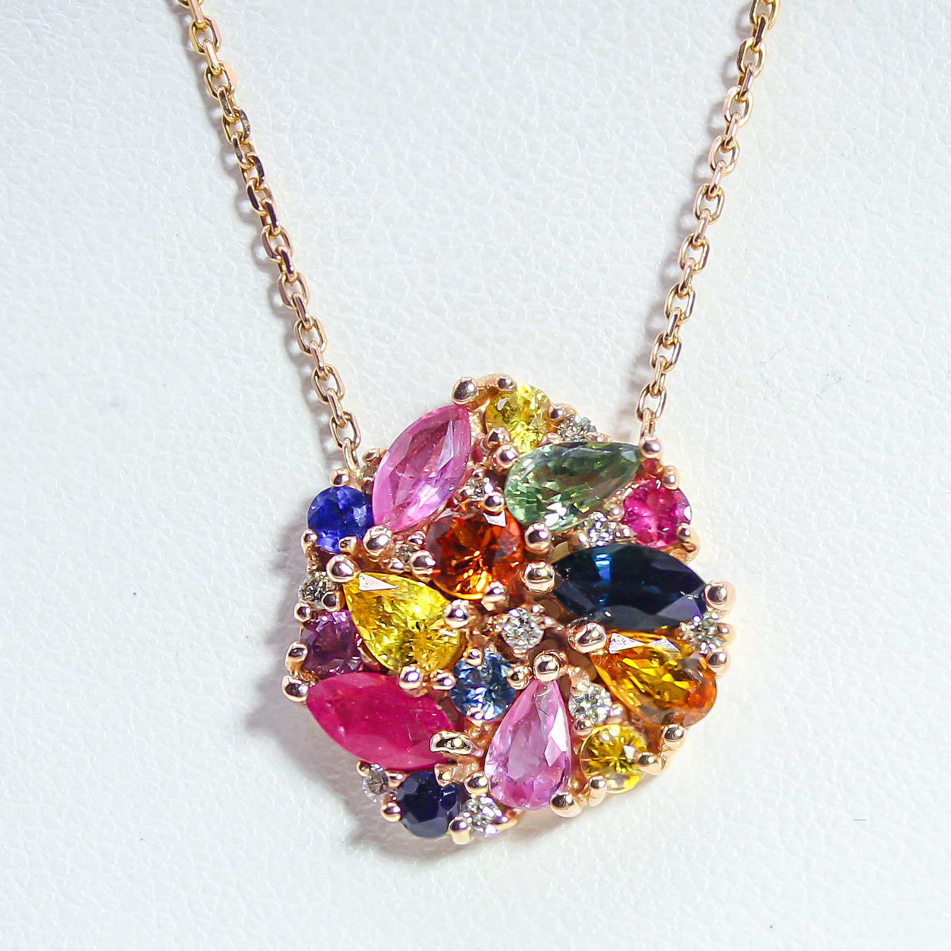 Capture the vibrant beauty of a blooming garden with this exquisite multi-gemstone mosaic necklace. Set in warm rose gold, a kaleidoscope of fancy-cut stones—totaling over 2.50 carats of deep sapphires, fiery garnets, and soft tourmalines—dances around sparkling diamond accents, creating a playful yet sophisticated confetti of color. This piece captures light from every angle, instantly brightening your complexion and acting as the perfect signature accessory for the woman who lives life in full color.