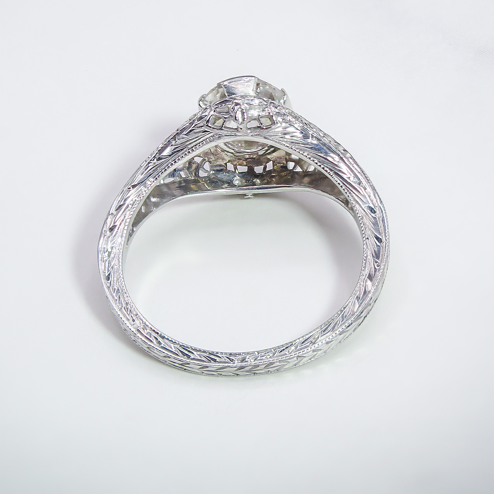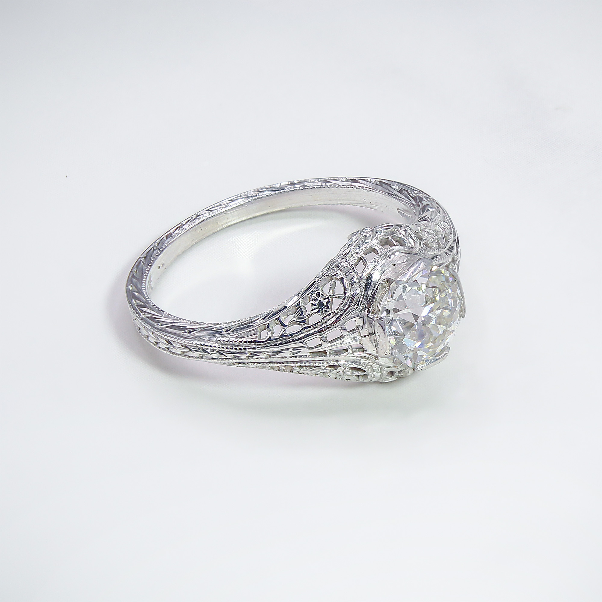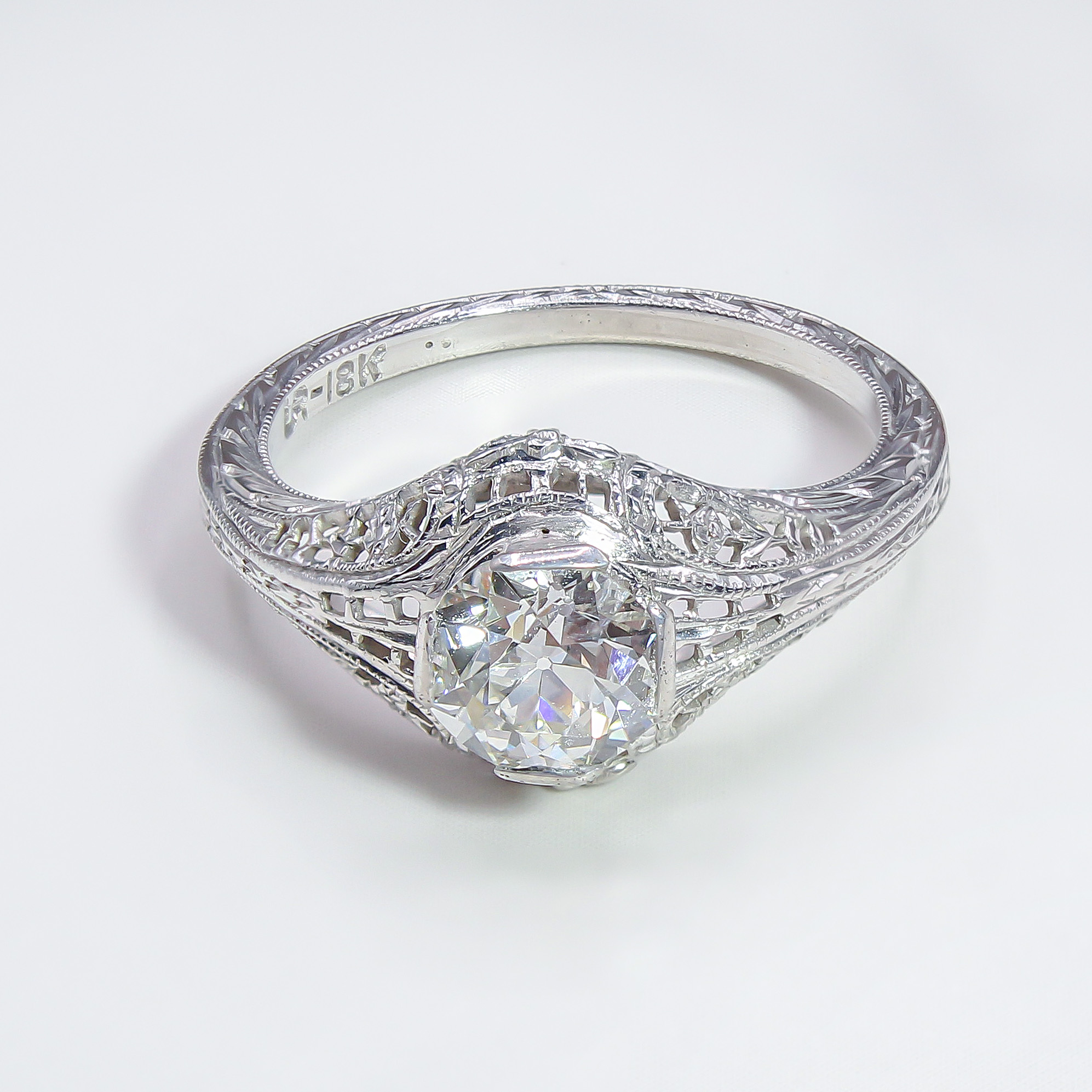Step back into the glamour of the 1920s with this breathtaking Art Deco original, featuring a stunning 0.91ct Old European cut diamond that radiates a unique, romantic fire. The 18kt white gold setting is a work of art, showcasing intricate hand-pierced filigree and delicate wheat-pattern engravings that wrap elegantly around the finger. This GIA-certified treasure carries a century of history and soul, making it an incomparable choice for a vintage engagement or a high-jewelry collection.