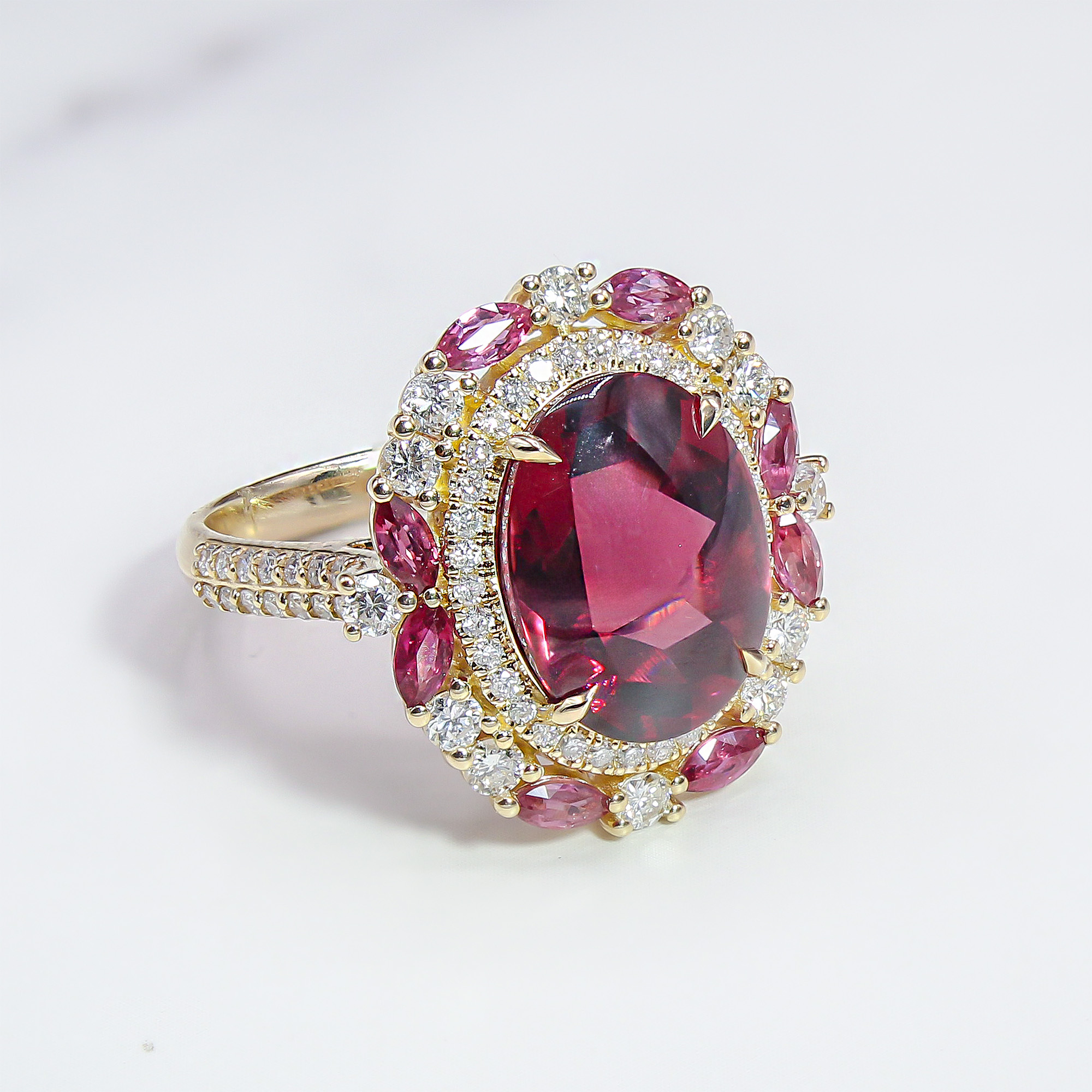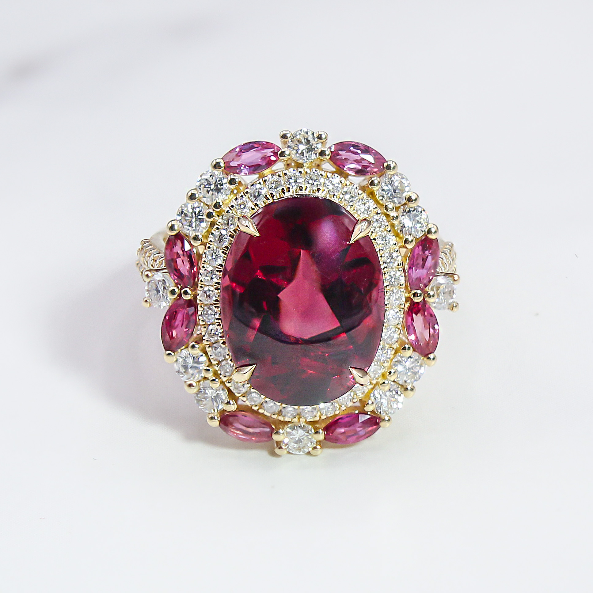 “A masterclass in tonal color, this hand-selected estate piece combines the richness of garnet and ruby for a depth of character rarely seen in modern retail collections.”