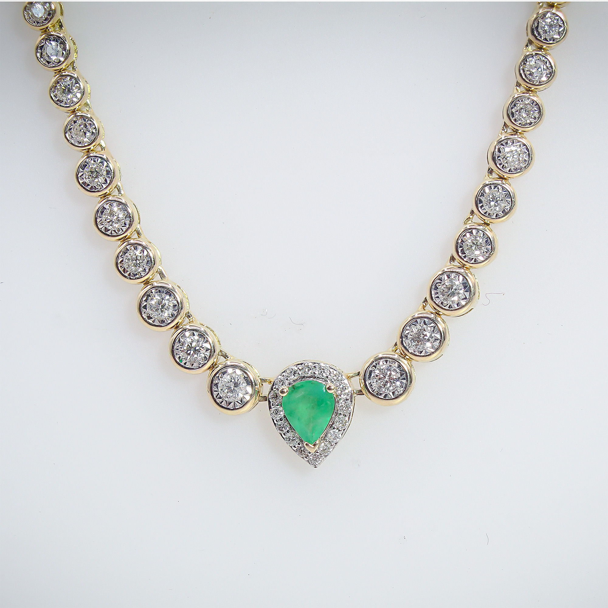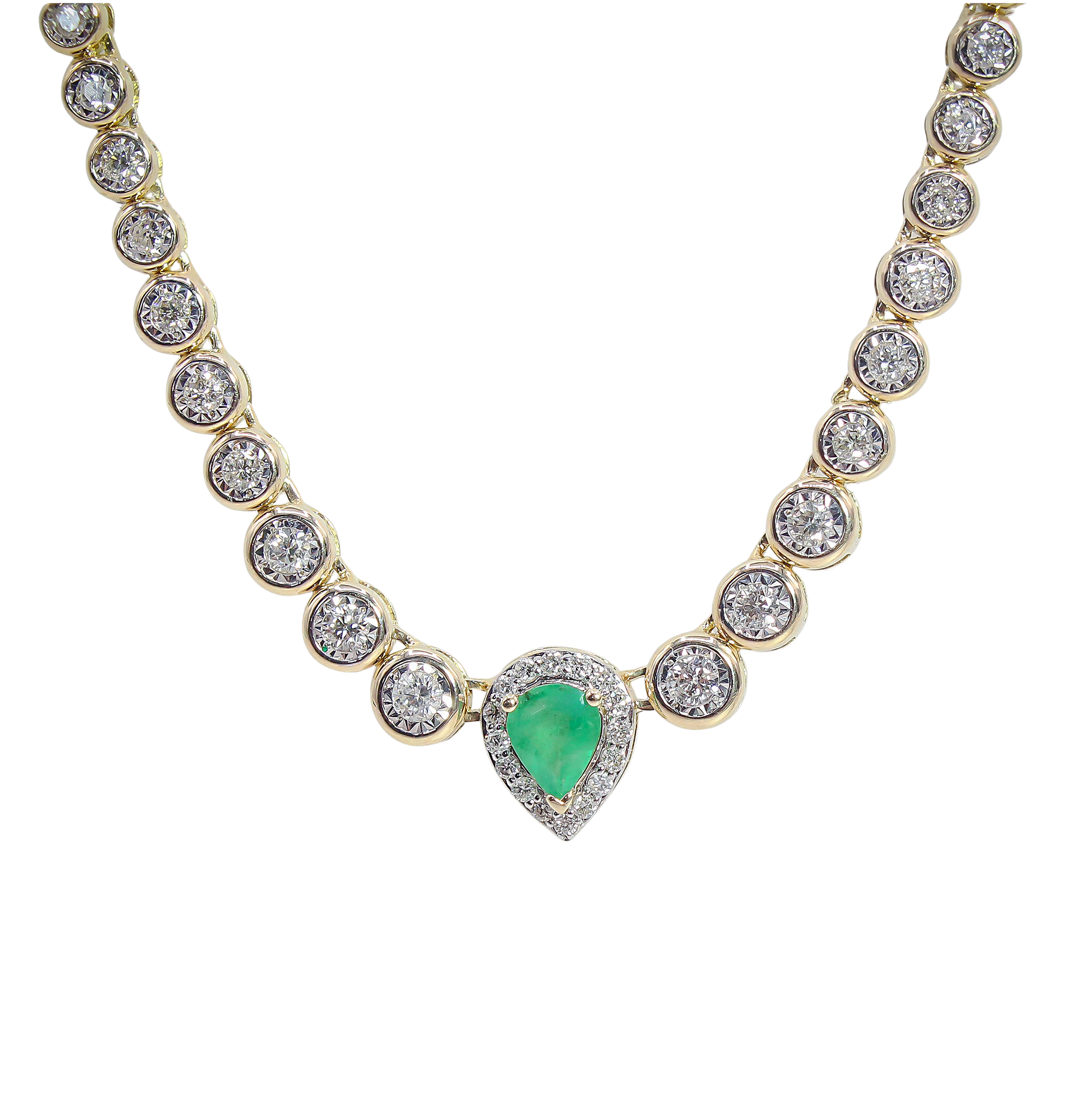 This sophisticated estate necklace centers on a vibrant, grass-green pear-shaped emerald, cradled within a delicate diamond halo that captures and throws light with every movement. The centerpiece transitions seamlessly into a classic tennis-style strand, featuring round brilliant diamonds individually secured in polished bezel settings for a sleek, snag-free finish. Whether gracing a black-tie affair or elevating a crisp white blouse, this piece offers a rhythmic sparkle and a pop of botanical color that feels both regal and remarkably wearable.