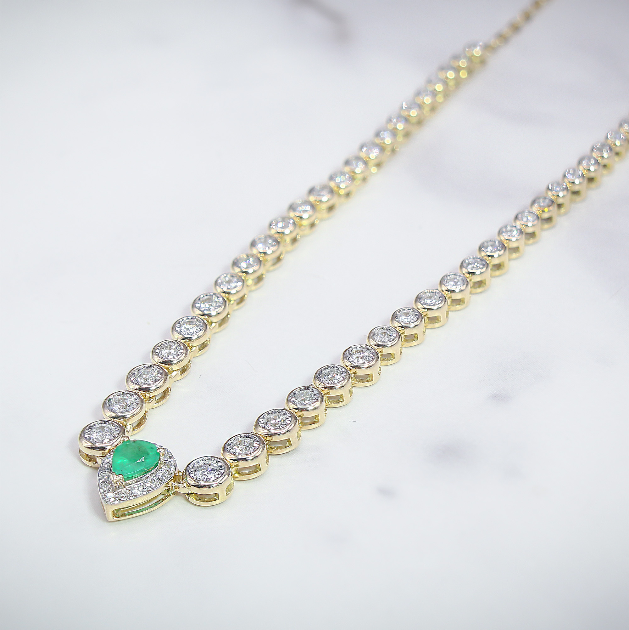 “A refreshing twist on the traditional tennis necklace, this curated estate find combines the security of bezel settings with the undeniable allure of a vivid green centerpiece.”