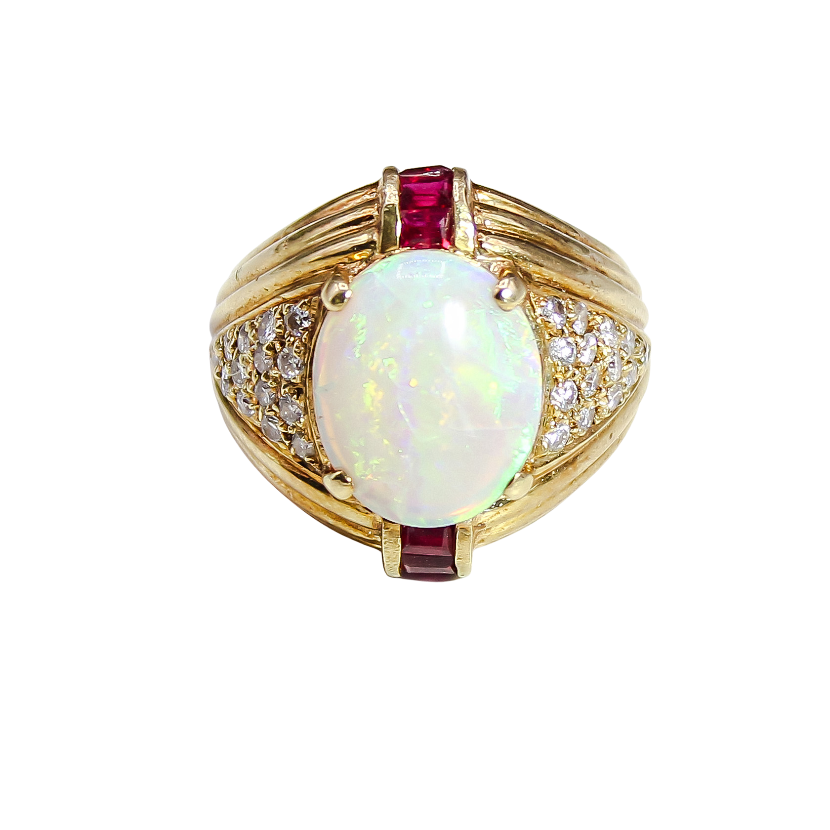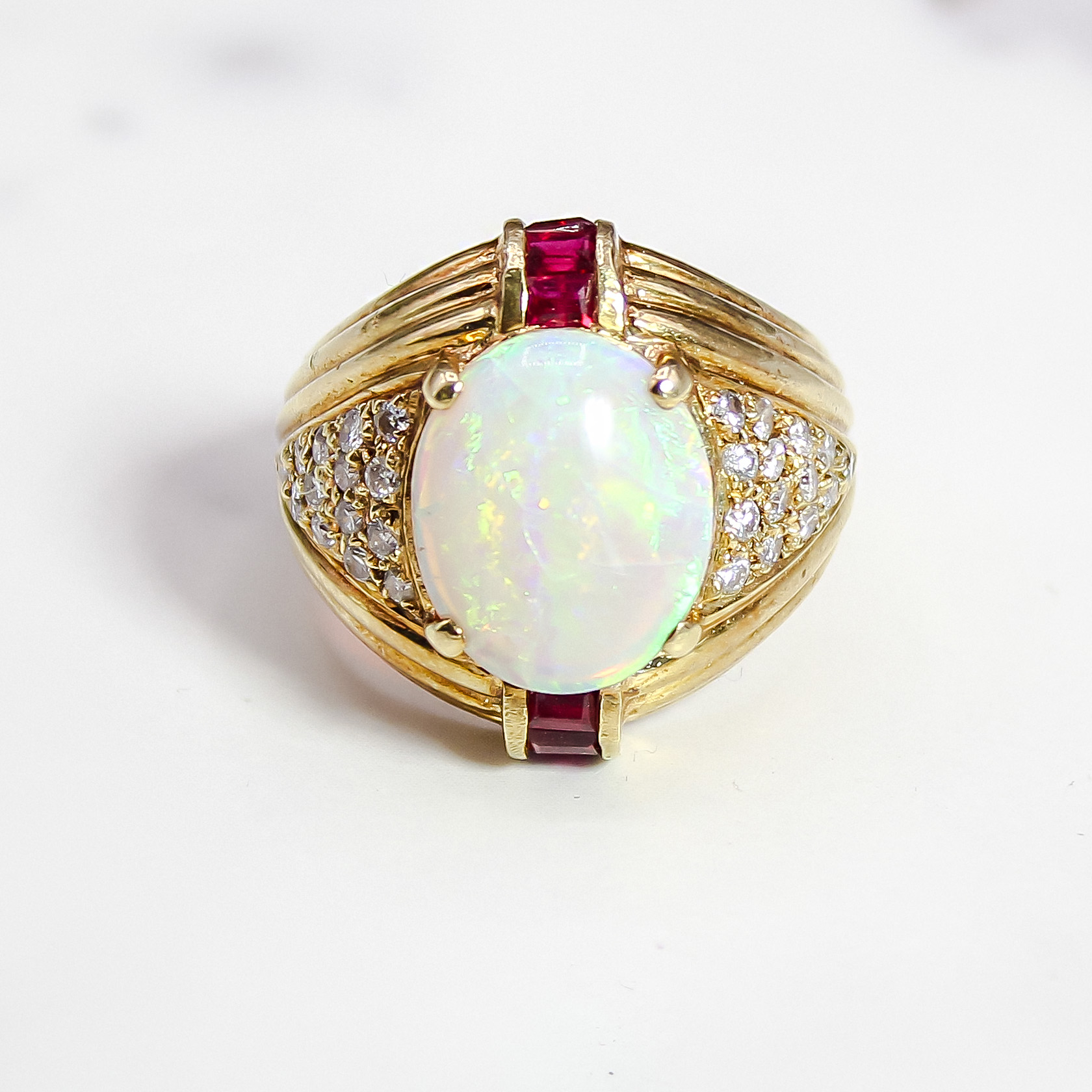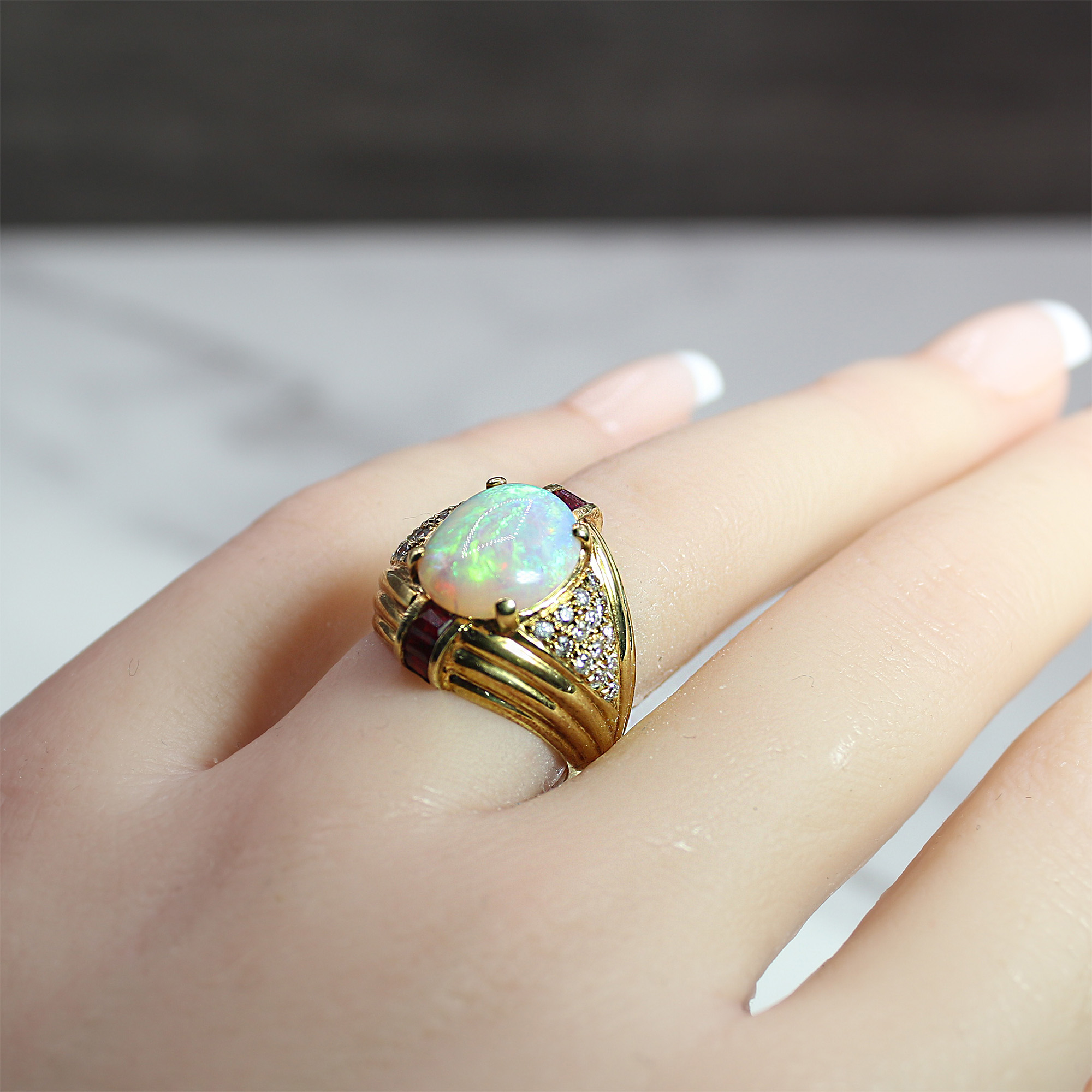 This spectacular cocktail ring showcases a magnificent, cabochon-cut natural opal with a dazzling play-of-color at its center. The vibrant gemstone is boldly contrasted by two channel-set, rectangular-cut natural rubies, positioned vertically at the ring’s north and south poles. The impressive, domed mounting is crafted in rich 14kt yellow gold, featuring elegant, ribbed details and shoulders lavished with a pave setting of brilliant-cut natural diamonds. The combination of fiery opal, deep red ruby, and sparkling diamonds in a substantial gold setting creates a truly captivating and luxurious piece.