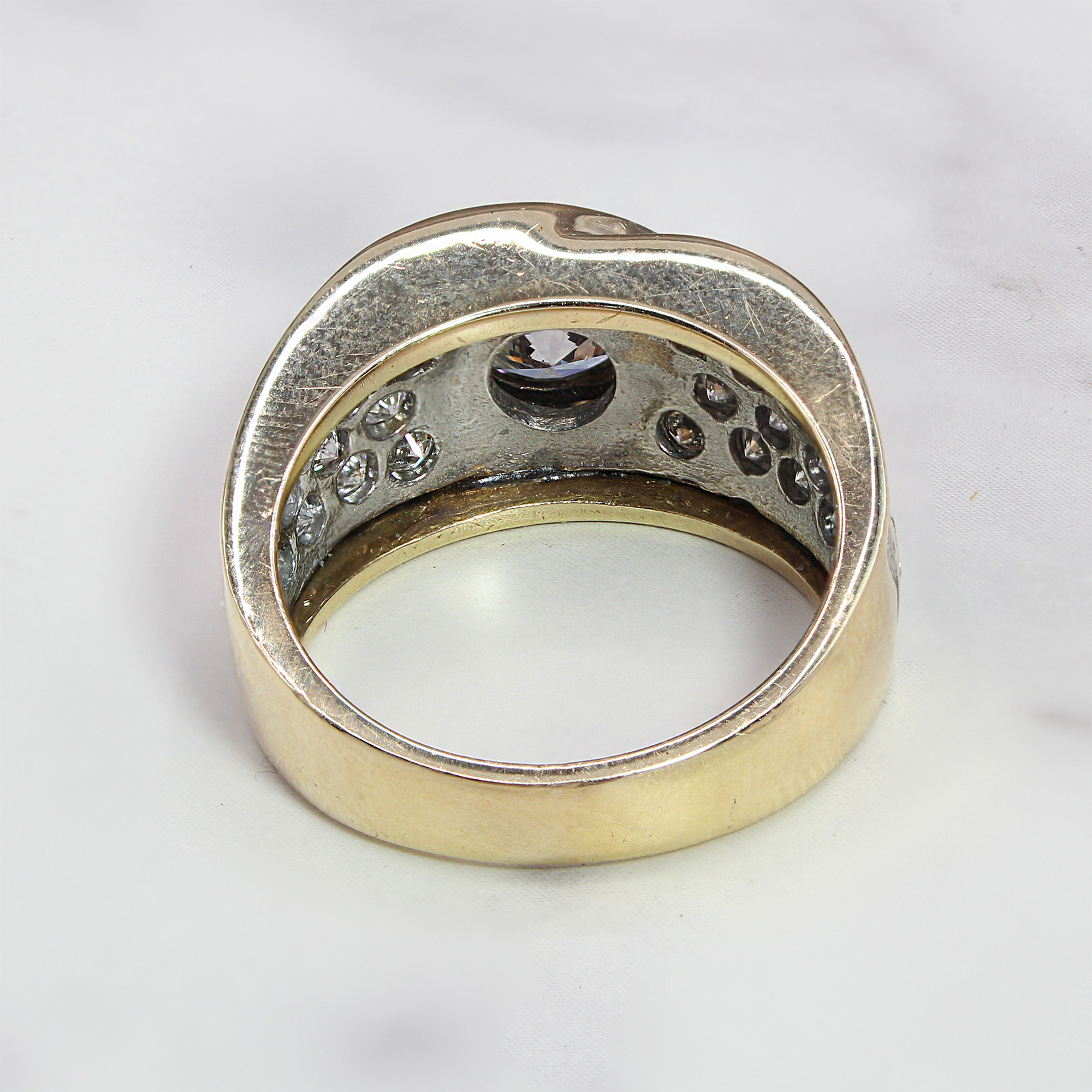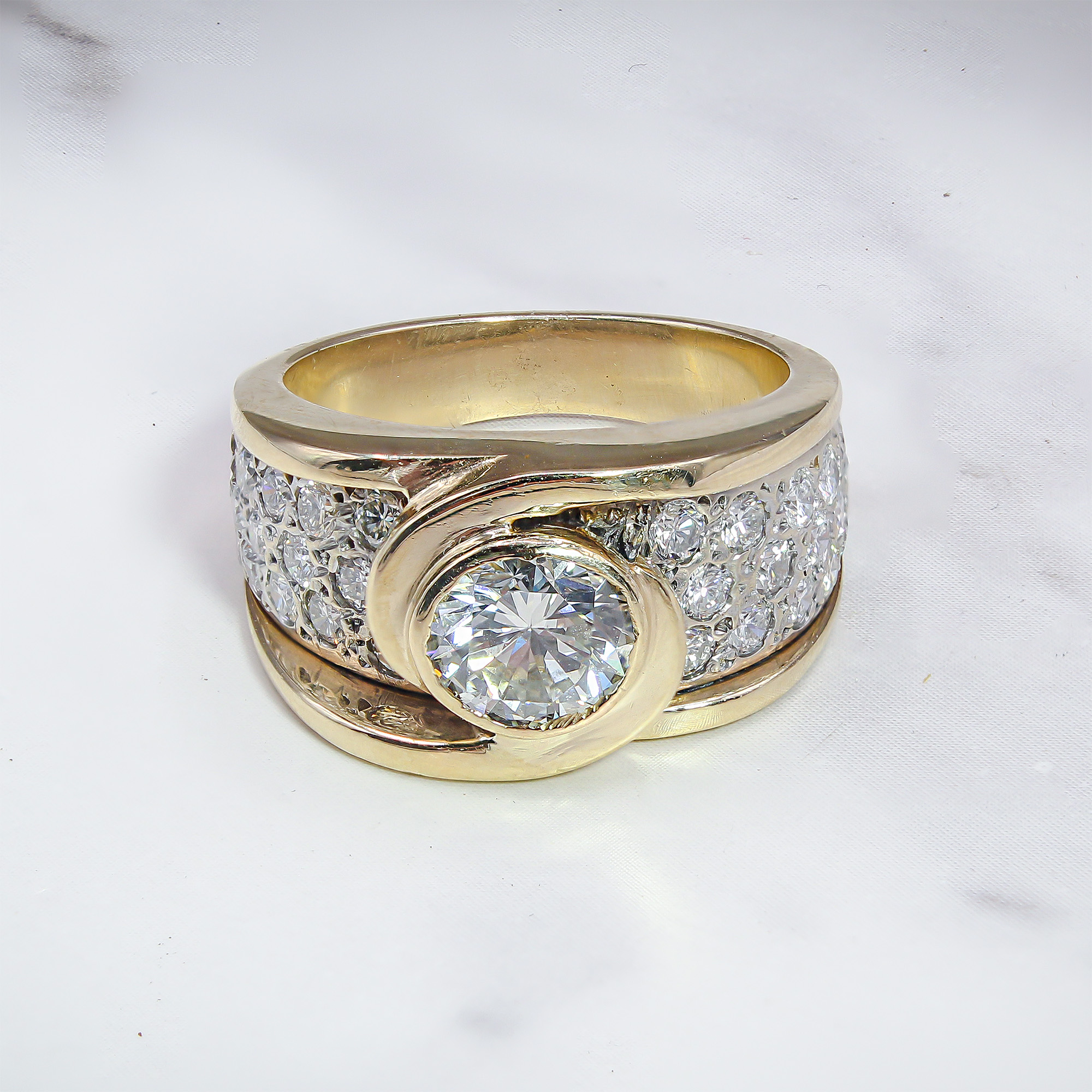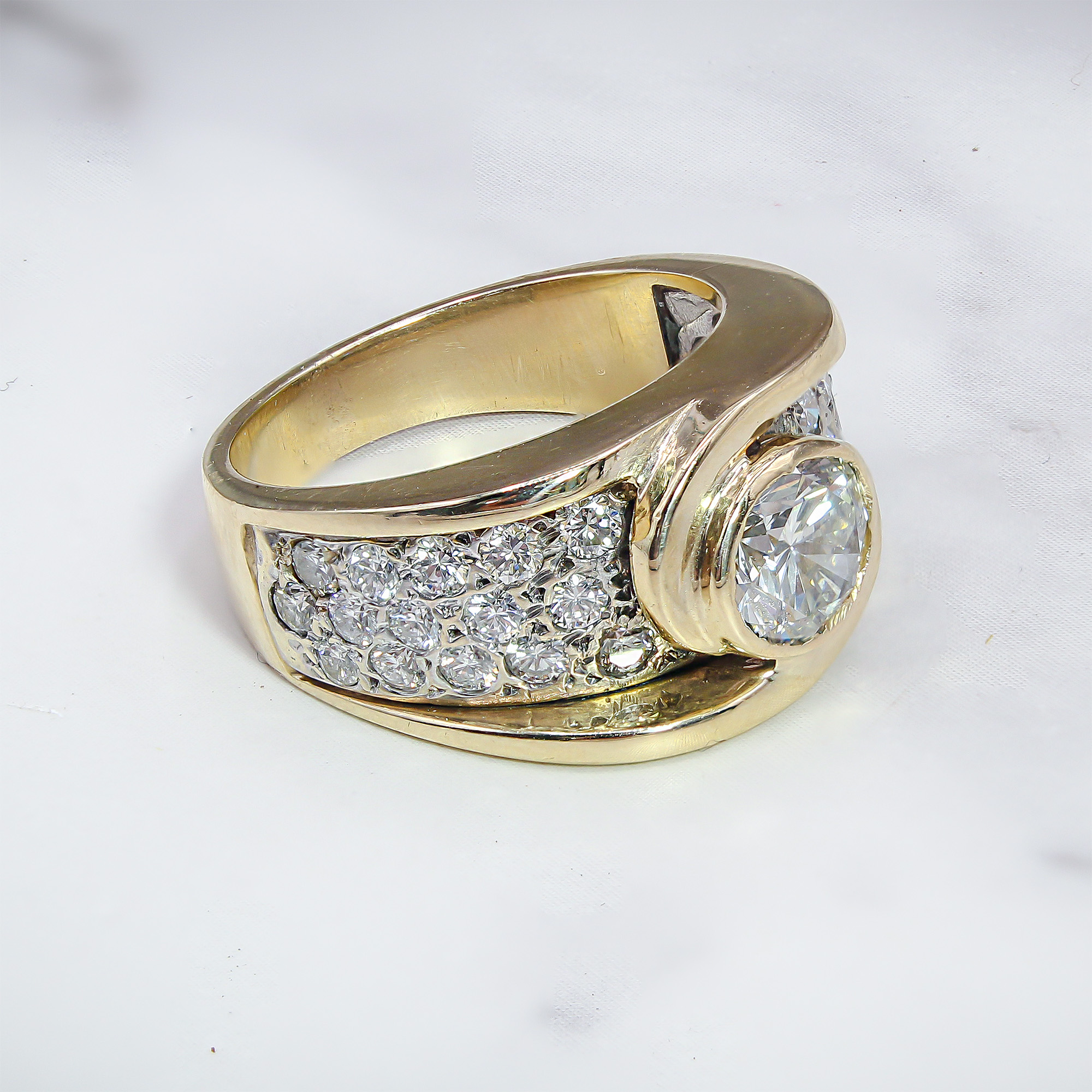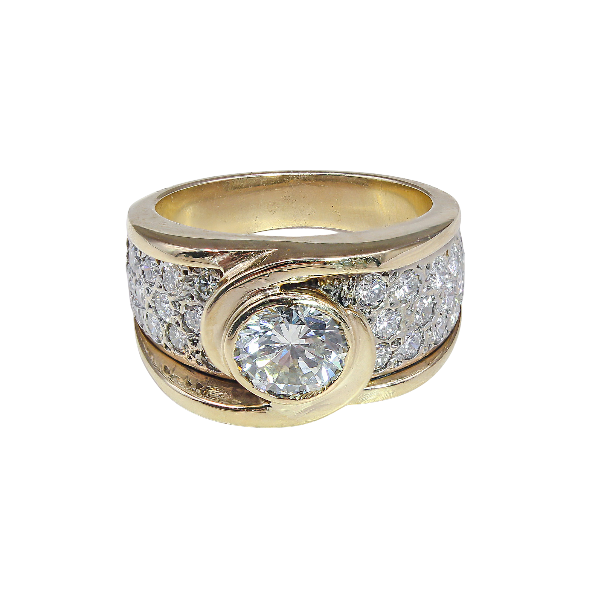 This striking modern estate piece commands attention with its sculptural bypass silhouette and a radiant 1.30-carat center diamond. The high-polish yellow gold curves elegantly around the finger, transitions into pavé-set shoulders that catch the light from every conceivable angle. Whether worn as a powerful right-hand ring or a unique contemporary engagement piece, its substantial weight and fiery brilliance offer a sophisticated glow that feels both grounded and ethereal.