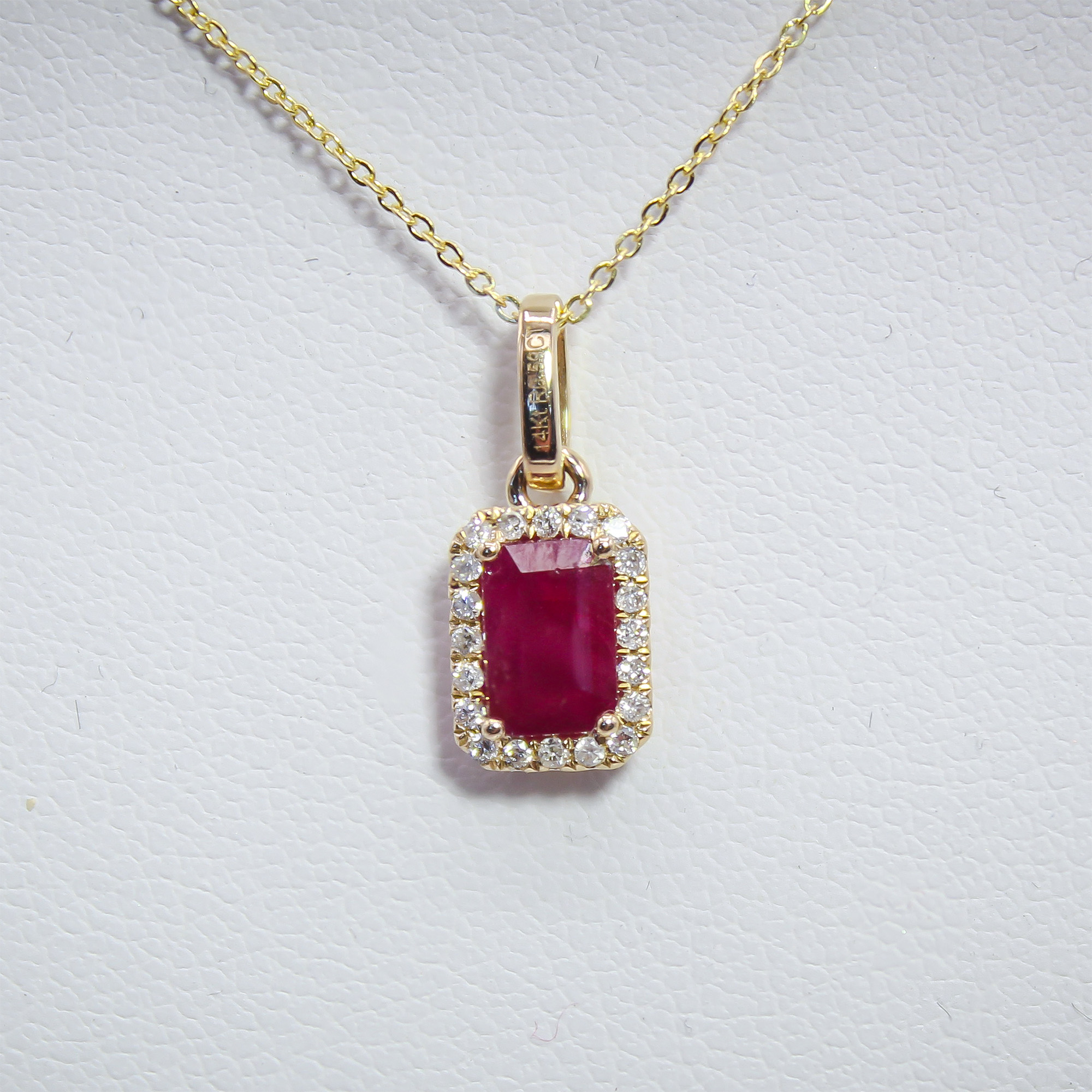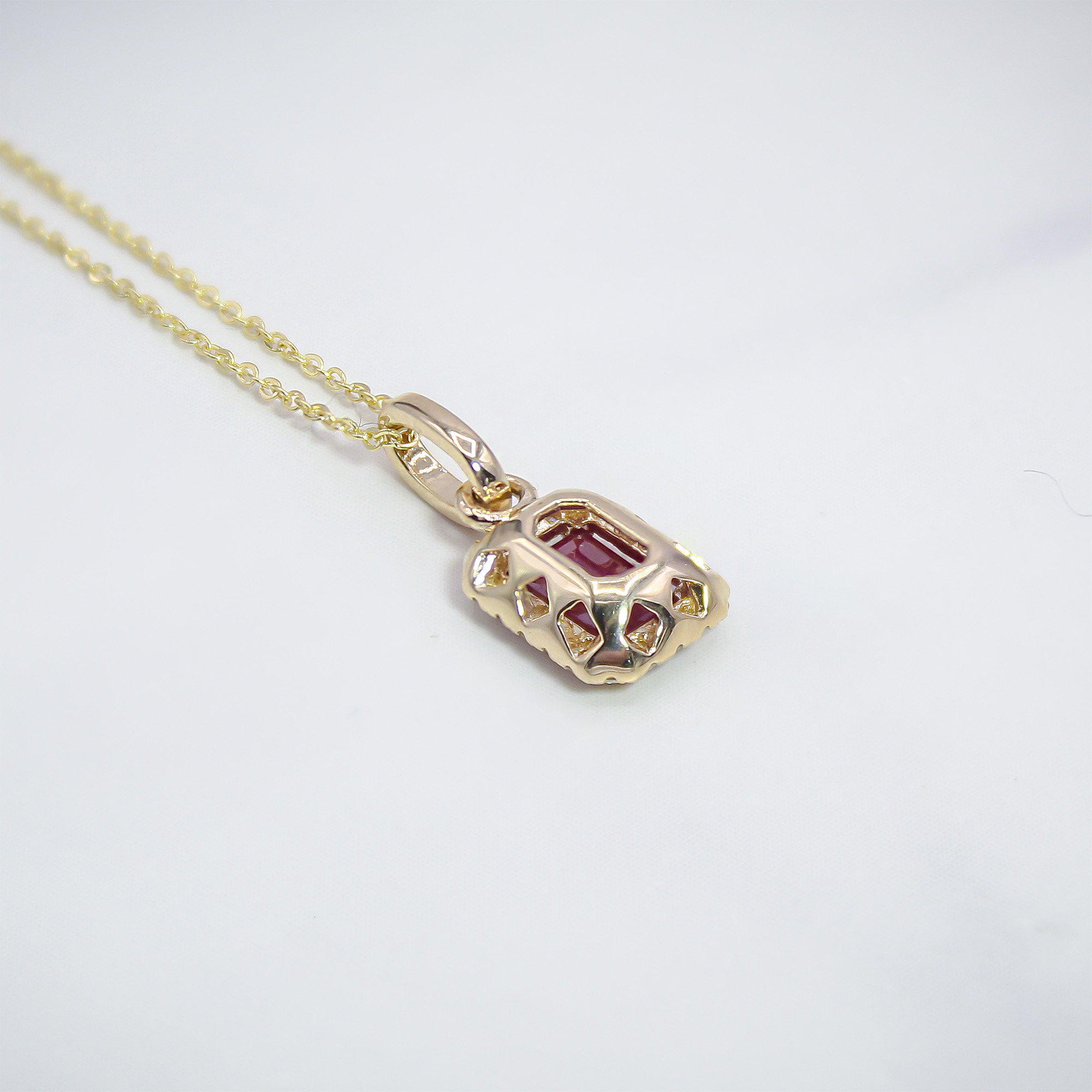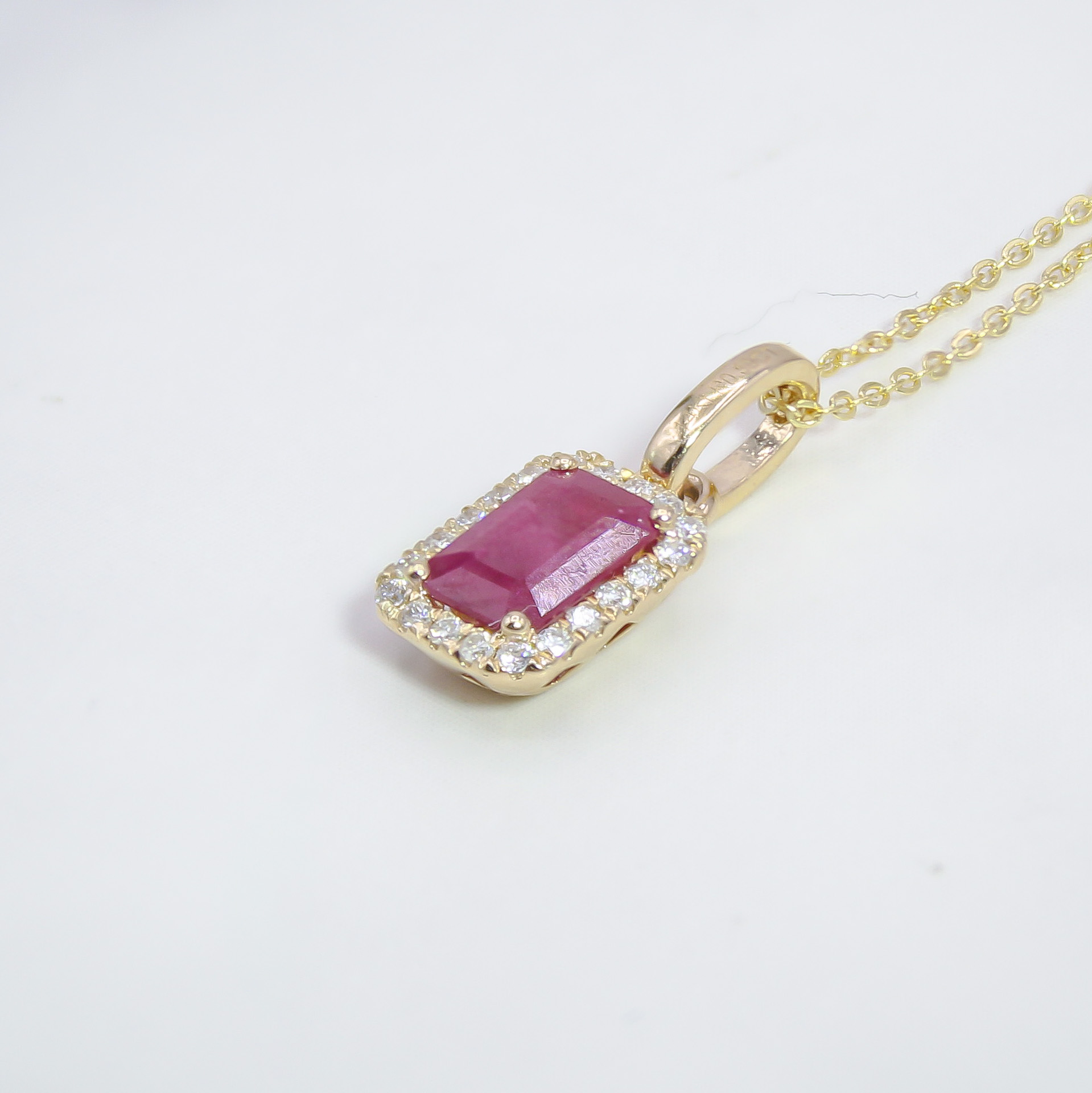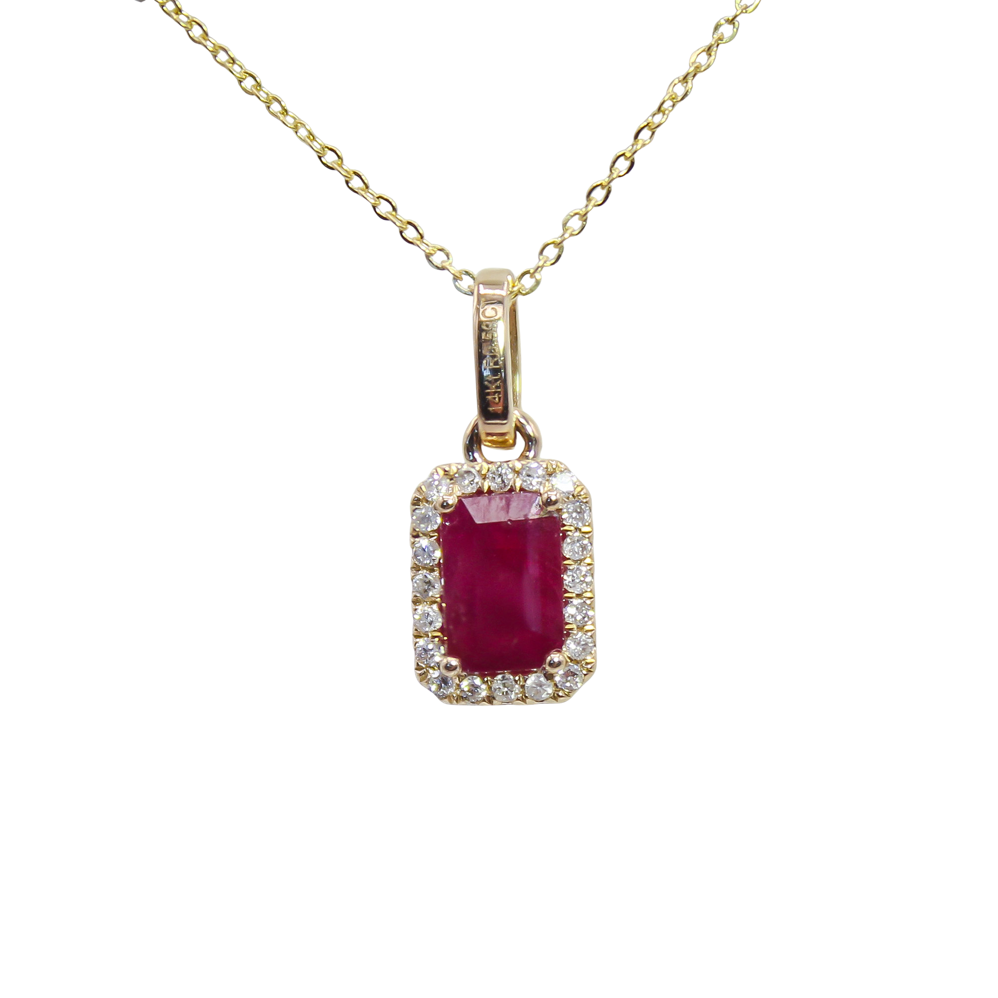 The central ruby boasts a deep, velvety red glow that radiates warmth, beautifully framed by a sparkling halo of bright white diamonds. Its elegant rectangular silhouette offers a sophisticated, vintage-inspired aesthetic that catches the light with every subtle movement. Perfectly balanced in buttery yellow gold, this necklace is a versatile masterpiece suited for both everyday luxury and the most celebrated occasions.