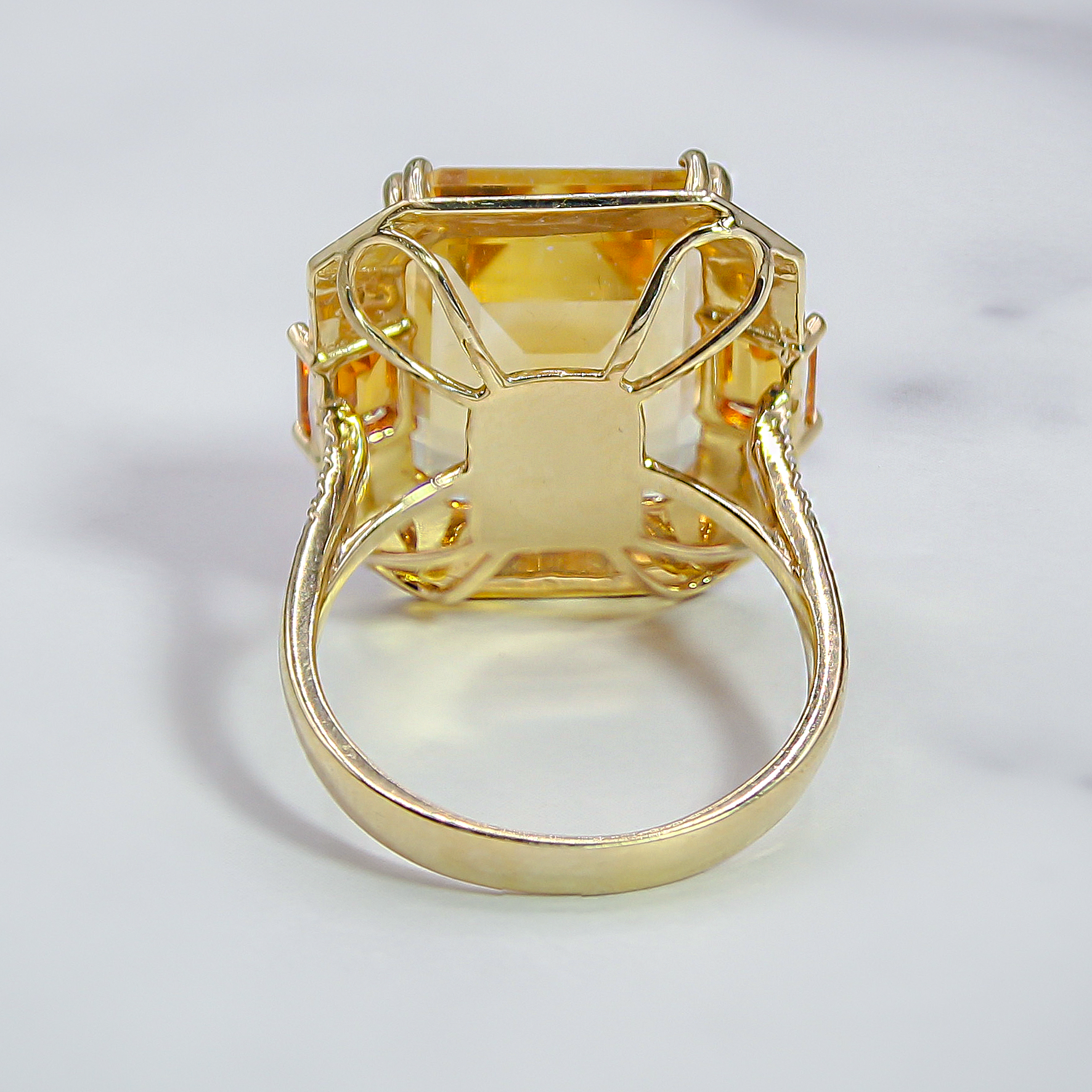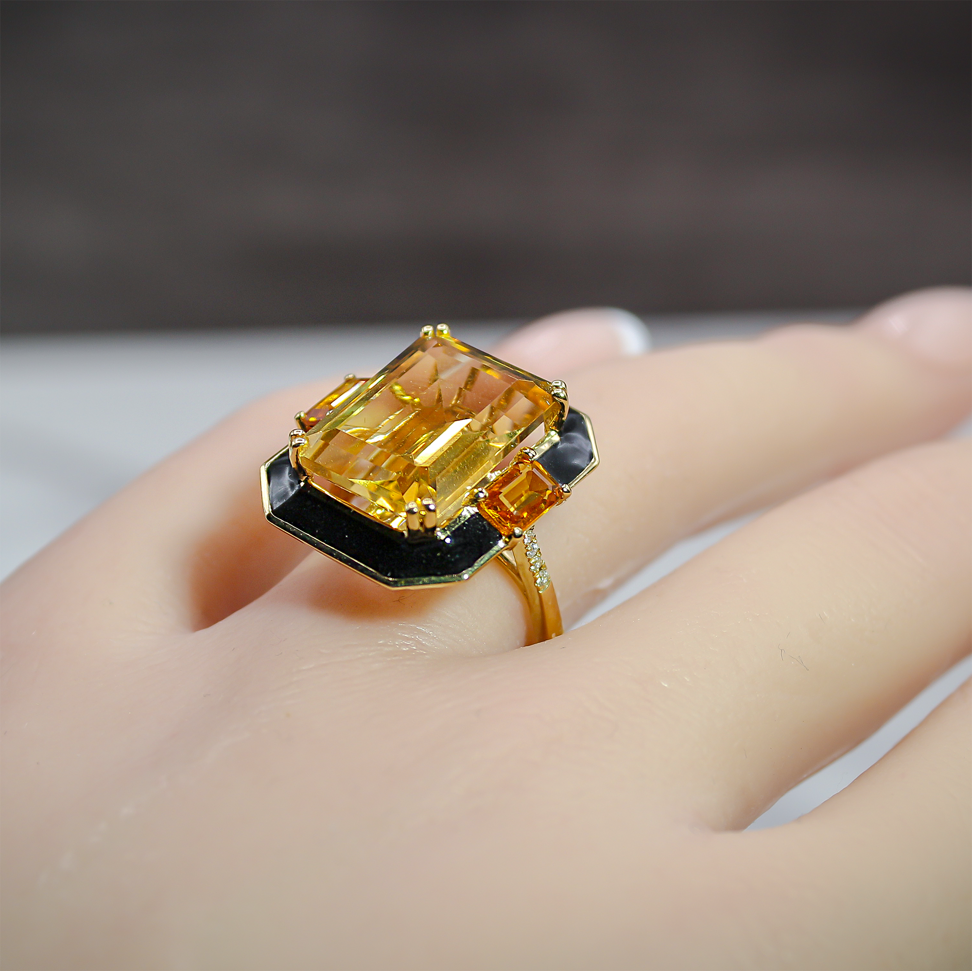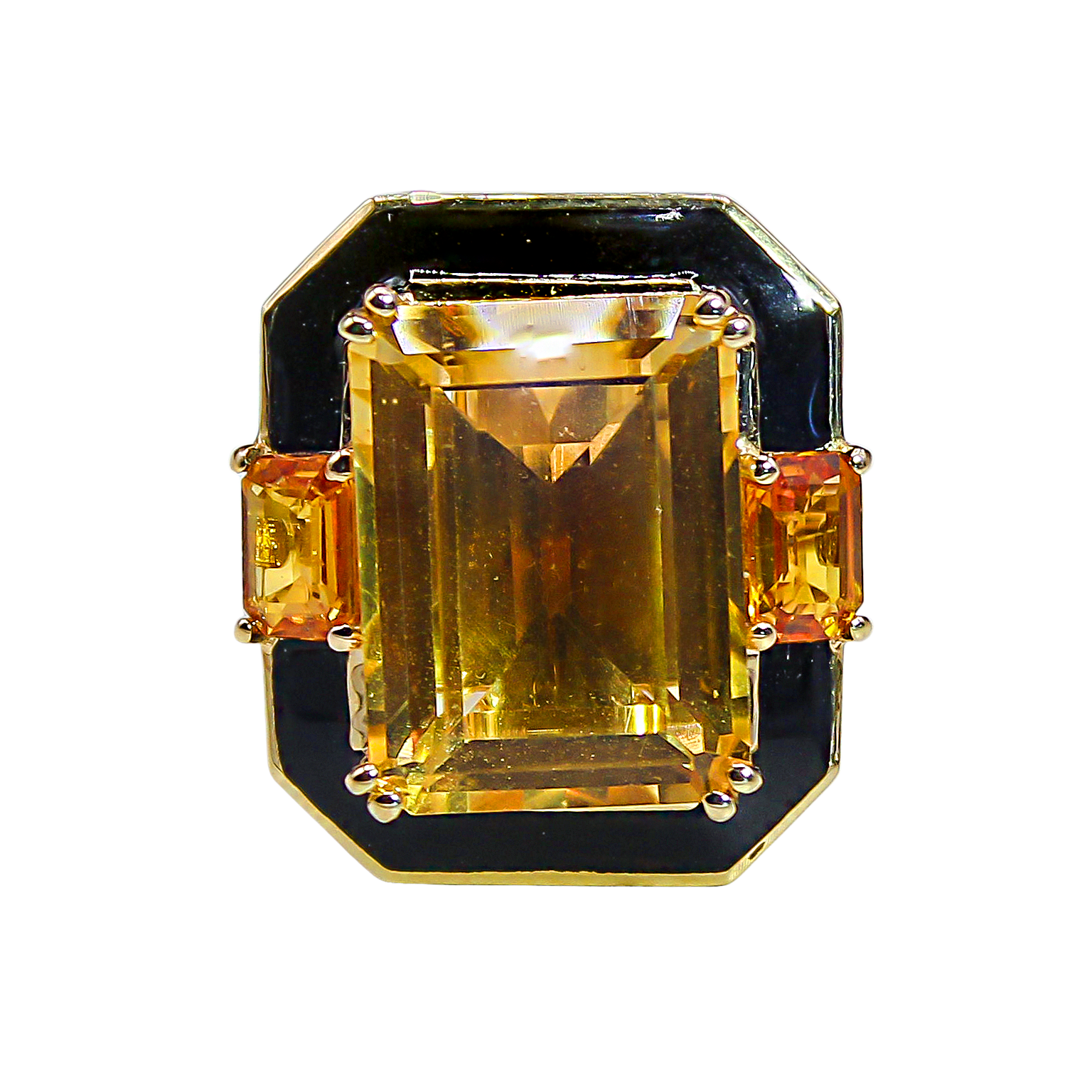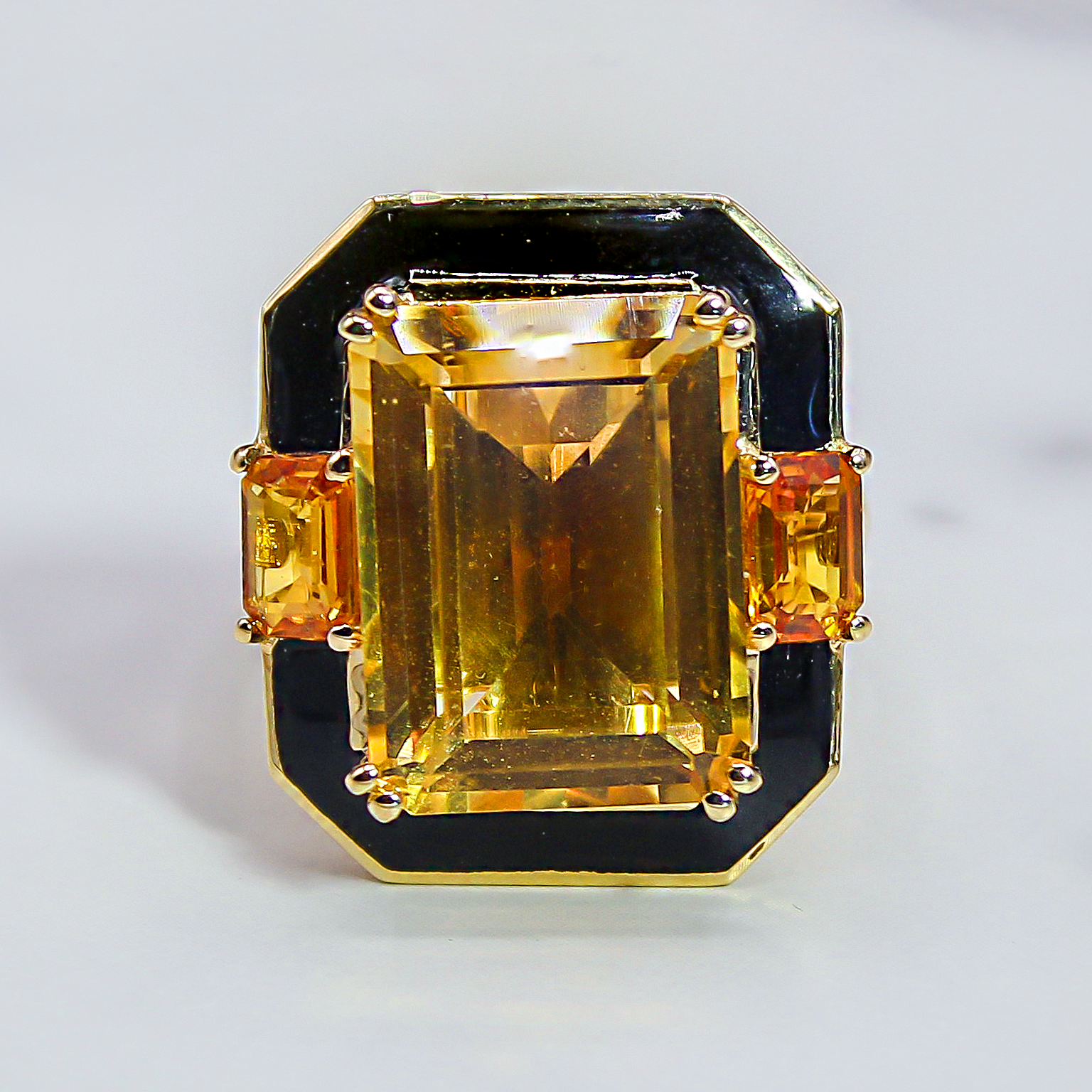 Command attention with this bold and beautiful cocktail ring, meticulously crafted in glowing 18-karat yellow gold. The centerpiece is a magnificent, rectangular step-cut natural Citrine, exuding a warm, vibrant golden-yellow hue reminiscent of a perpetual sunset. The striking gem is dramatically framed by a border of high-polish black Onyx, creating a captivating contrast that enhances the Citrine’s brilliance. Flanking the central stone are two smaller, richly colored Citrine accent stones, adding depth and symmetry. The split shank is subtly accented with delicate natural diamonds near the shoulders, providing a final touch of sparkle to this glamorous statement piece.